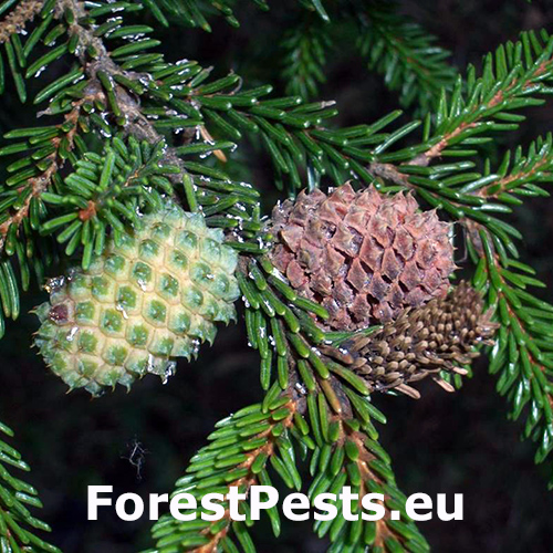 The insect is 0.2–0.5 mm in size with a bluish-green body. Colonies are found mainly in the crown region of mature trees, where the adelgids feed on young shoots, stems, and branches. Feeding induces the formation of galls measuring 6–30 mm, which appear later in the season (July–August). These galls disrupt nutrient flow and may lead to needle discoloration, deformation, and premature needle drop. Reported in Europe on fir and spruce, Dreyfusia prelli is primarily found in central and southeastern regions of the continent.