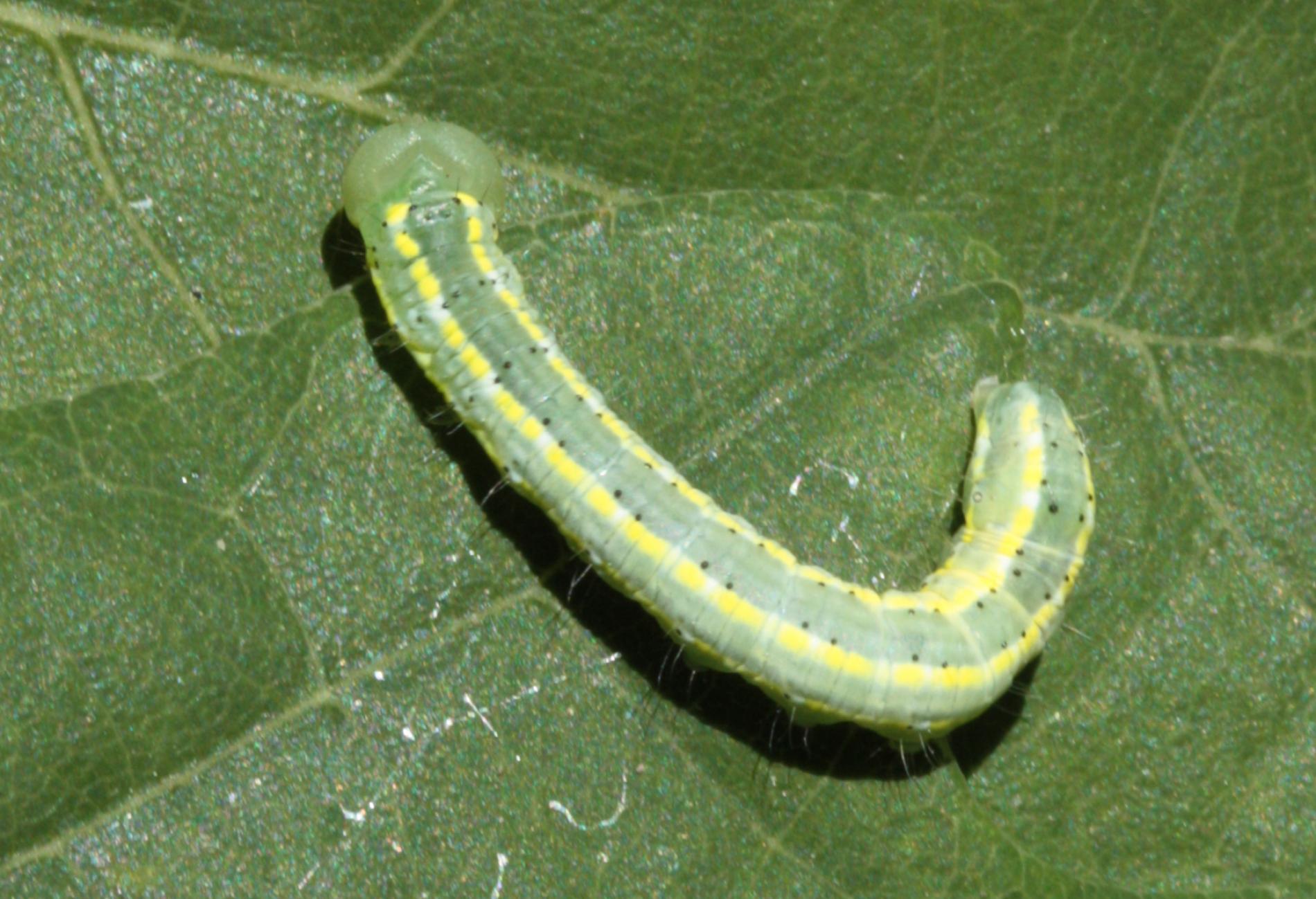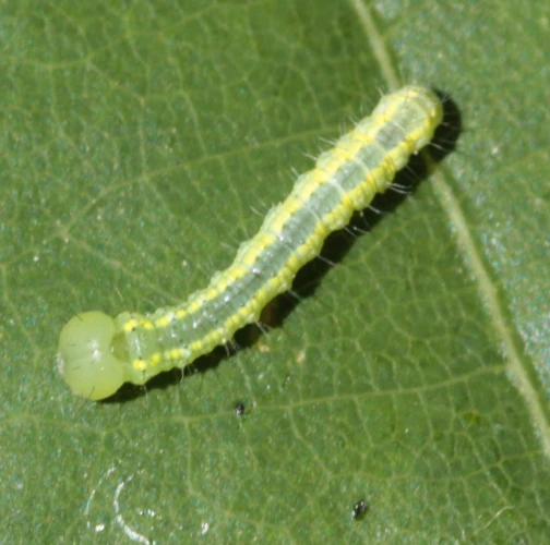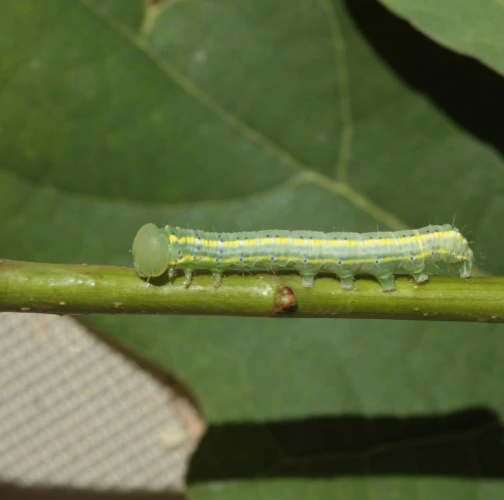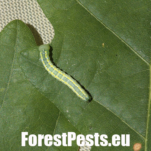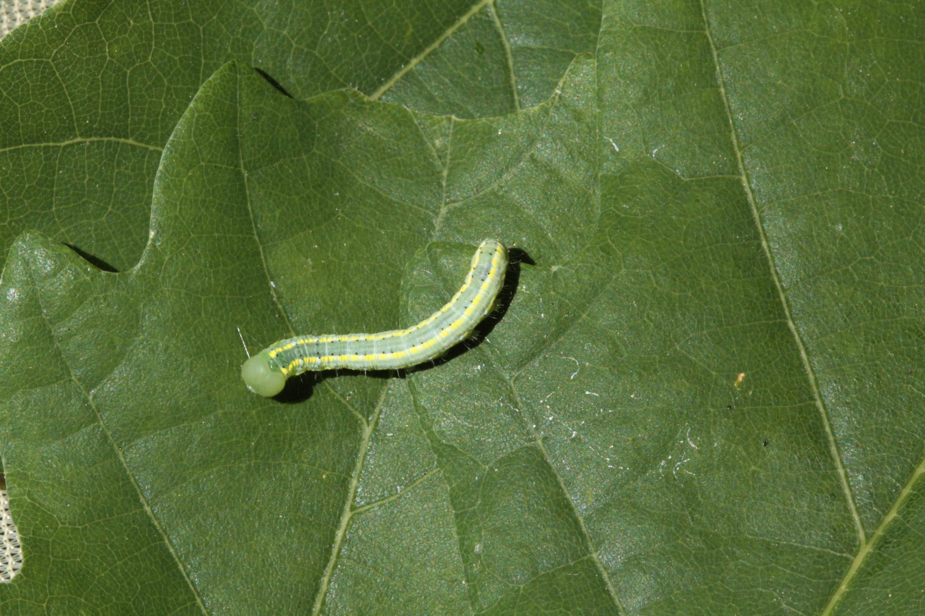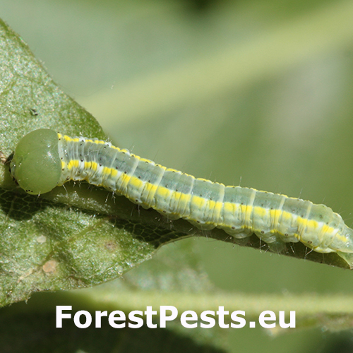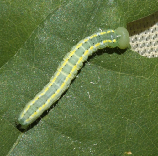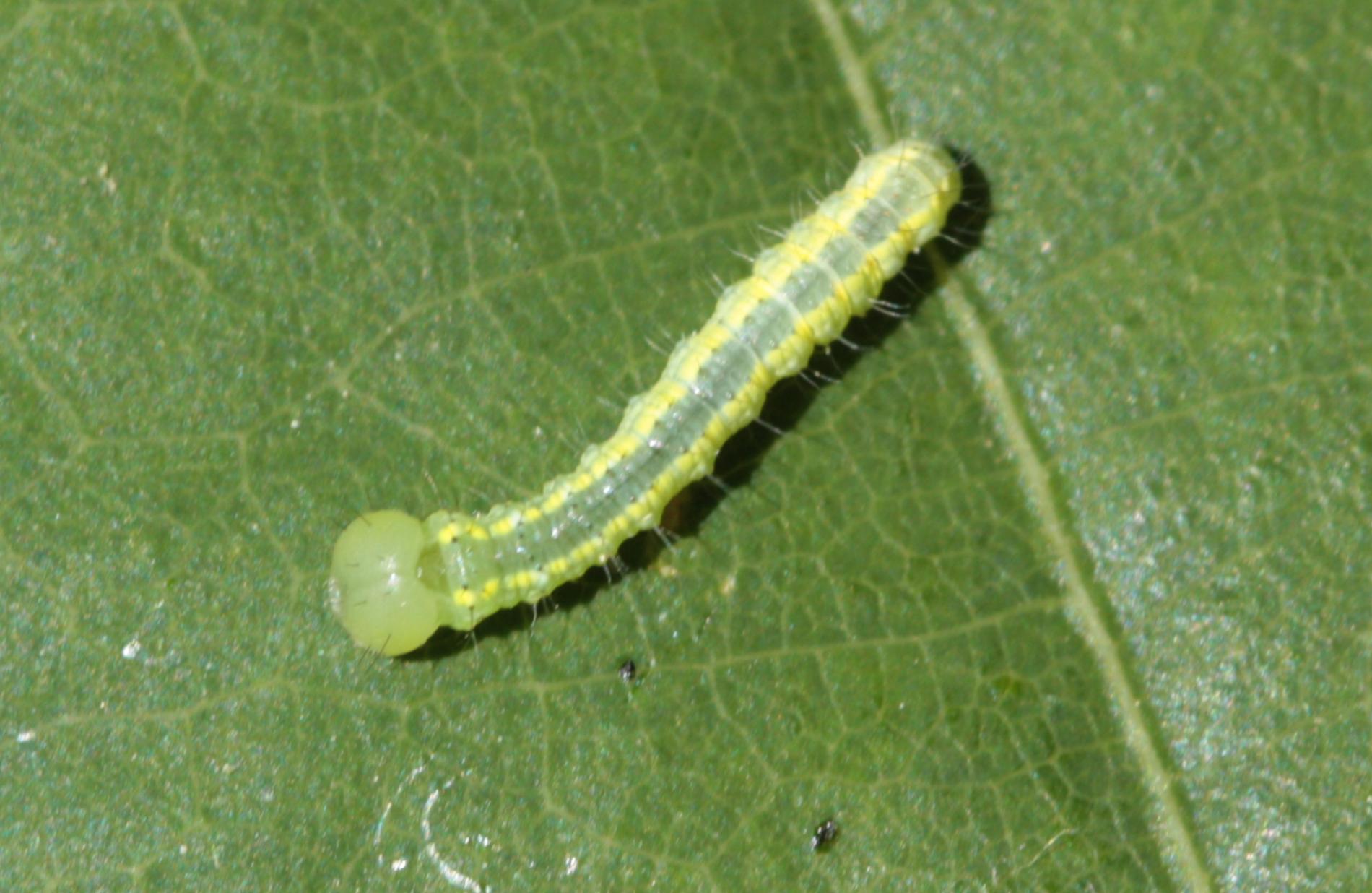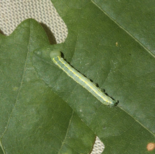 Larva: Body green, dorsally light blue-green, with narrow but distinct yellow or whitish subdorsal lines and wider, mostly yellow spiracular stripes; the last can be partly dashed. Dorsal line absent. Head green, with narrow ongoing spiracular stripes; legs, prolegs and anal prolegs green. Pinacula inconspicuous. Young caterpillars greenish or yellowish with black pinacula; later green with very distinct yellow subdorsal stripes.