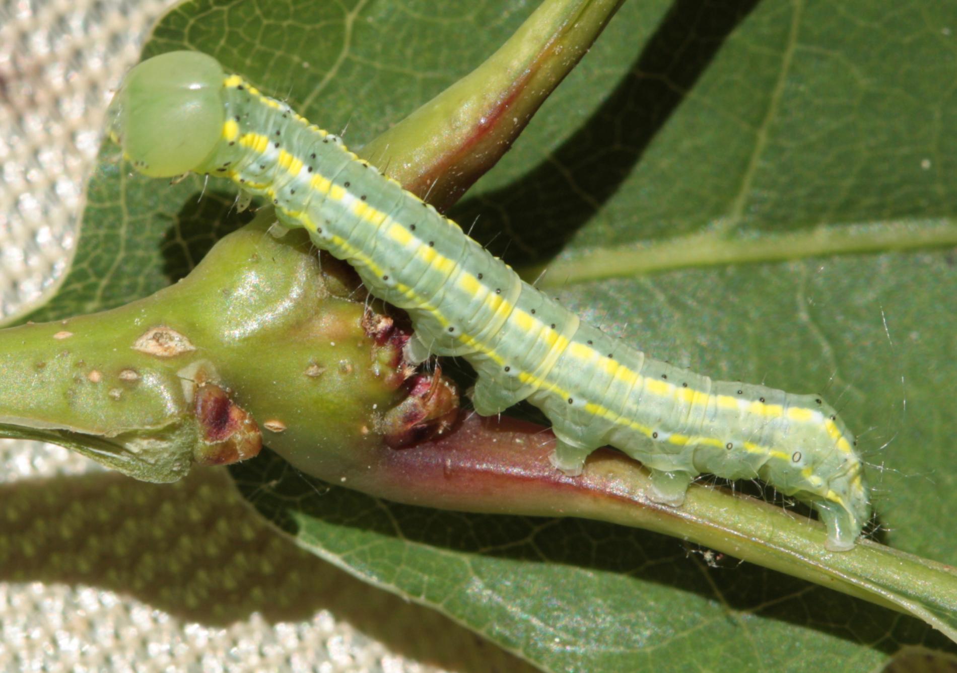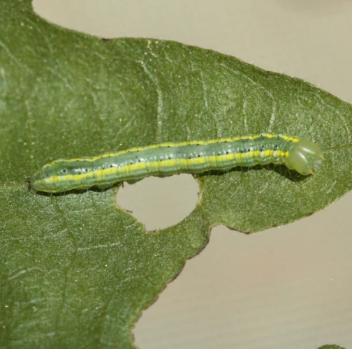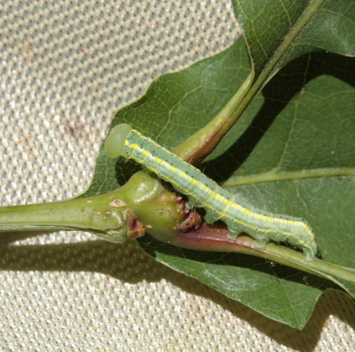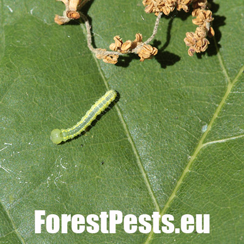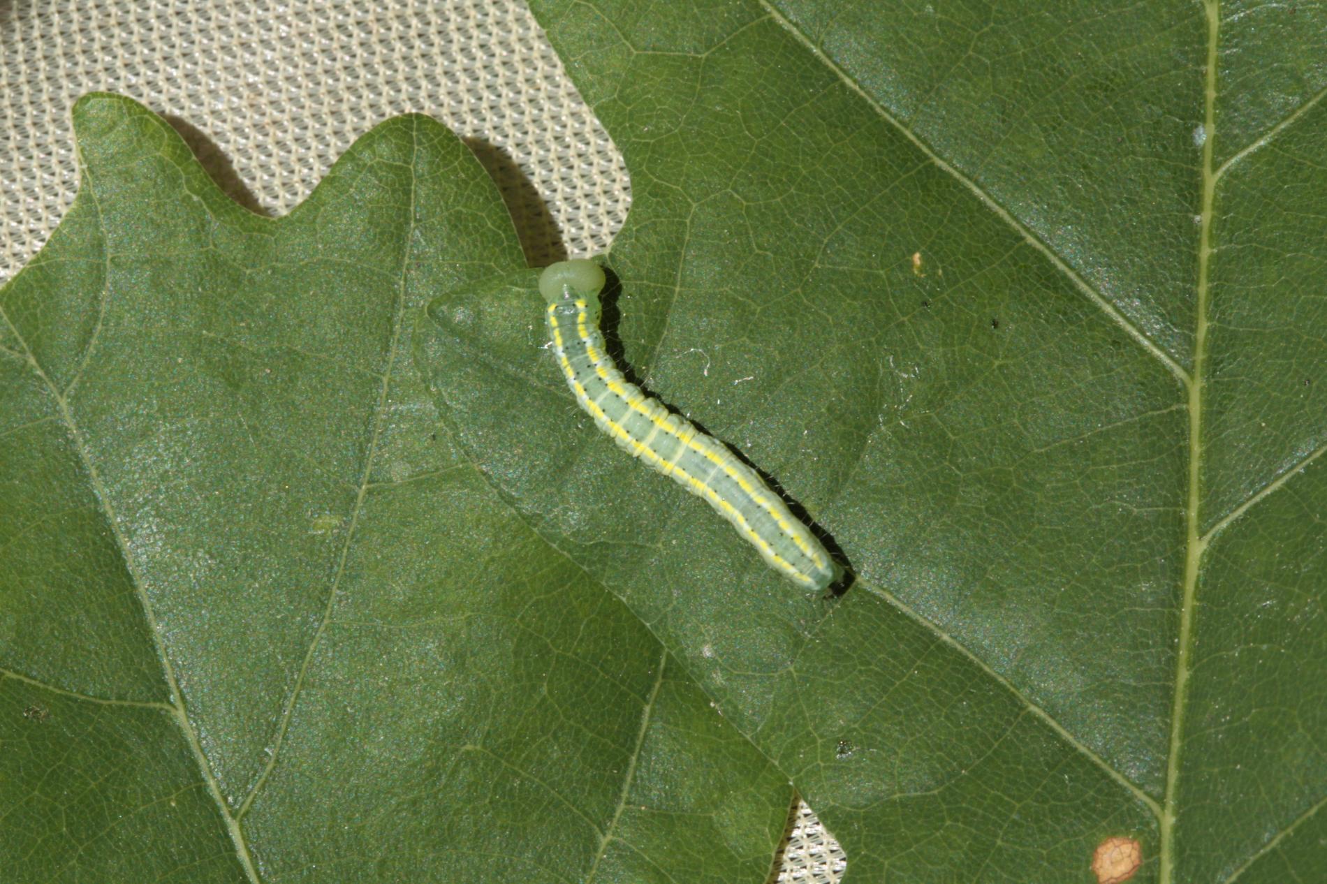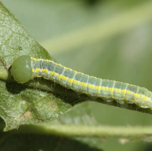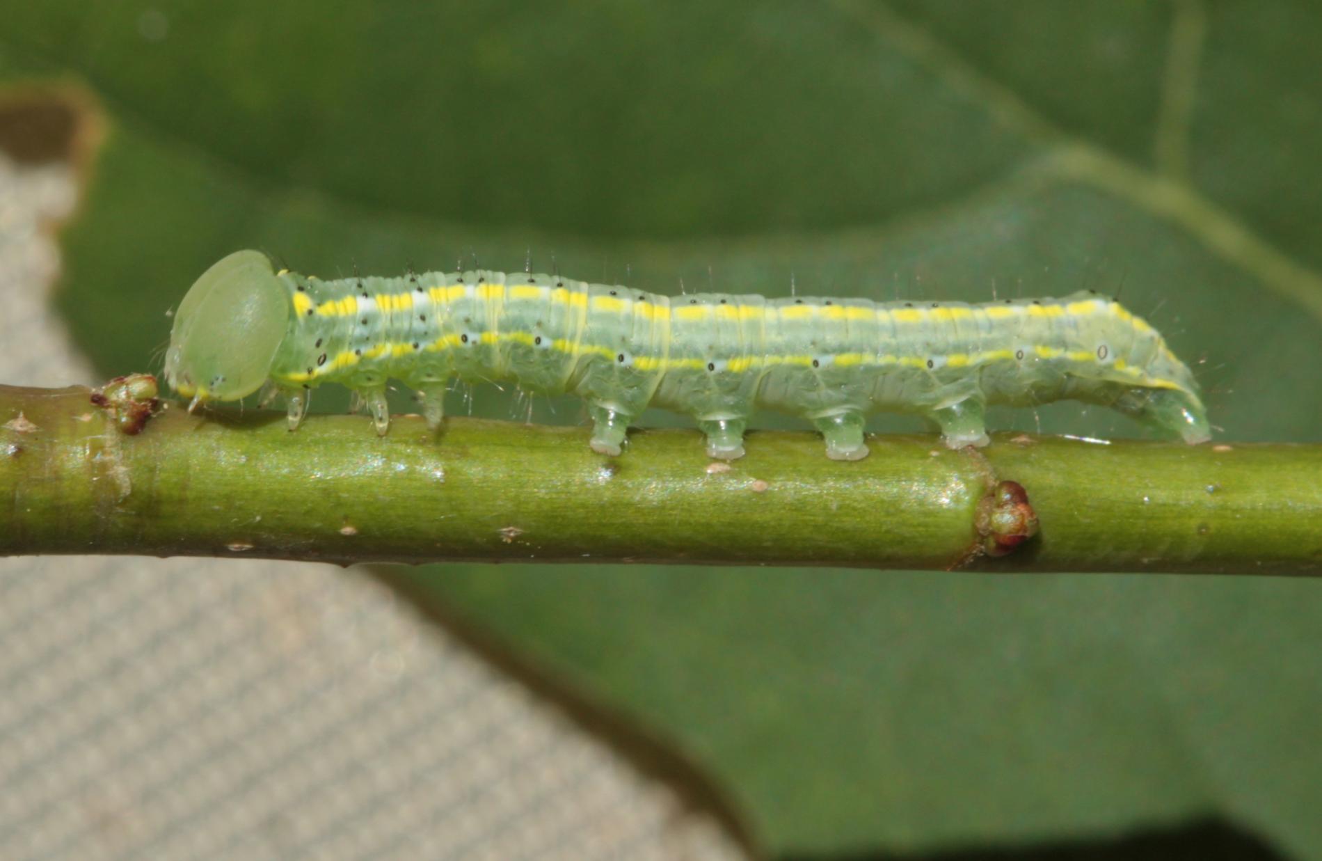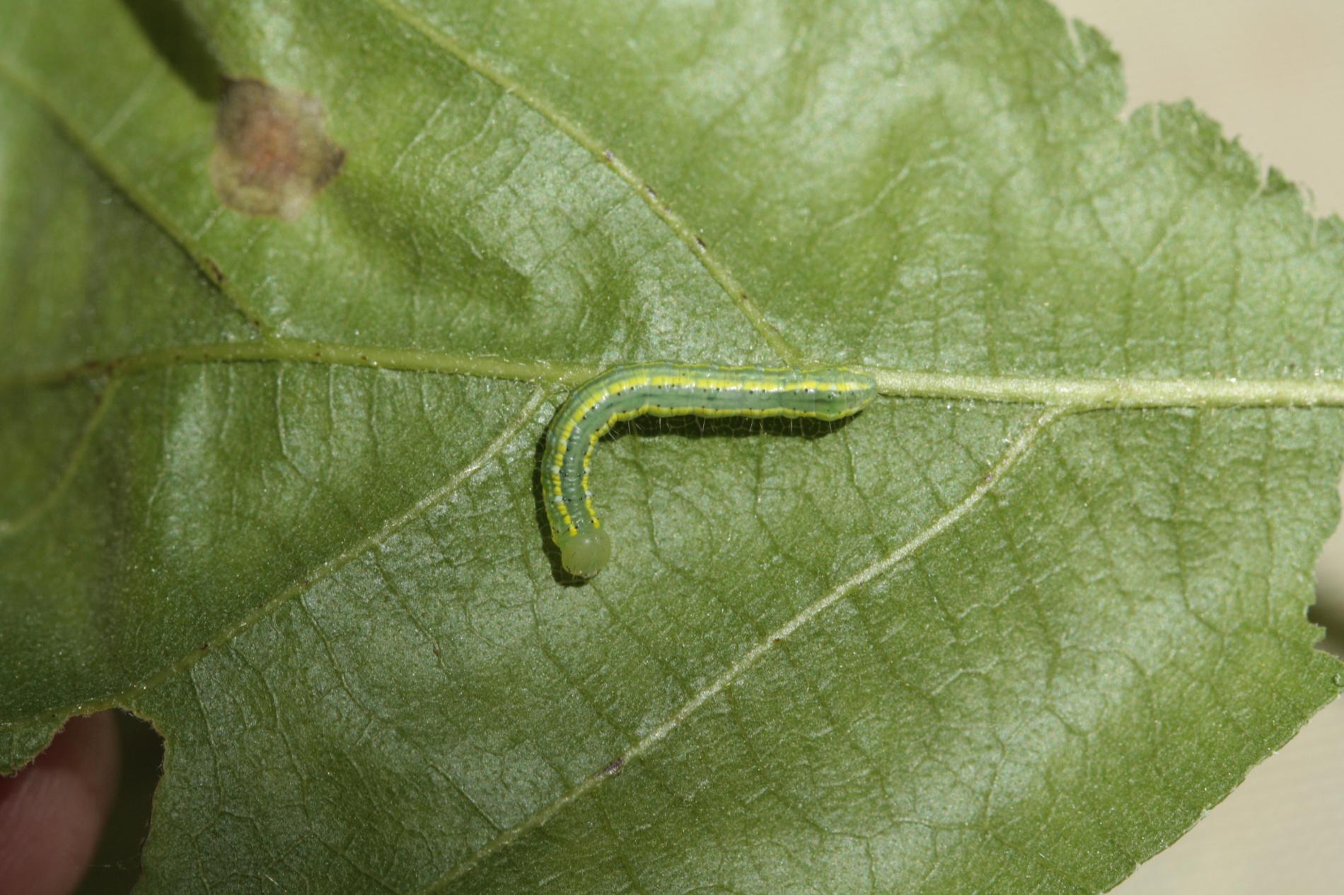 Larva: Body green, dorsally light blue-green, with narrow but distinct yellow or whitish subdorsal lines and wider, mostly yellow spiracular stripes; the last can be partly dashed. Dorsal line absent. Head green, with narrow ongoing spiracular stripes; legs, prolegs and anal prolegs green. Pinacula inconspicuous. Young caterpillars greenish or yellowish with black pinacula; later green with very distinct yellow subdorsal stripes.
