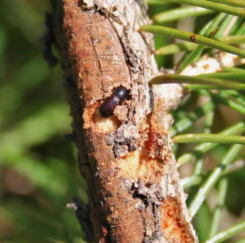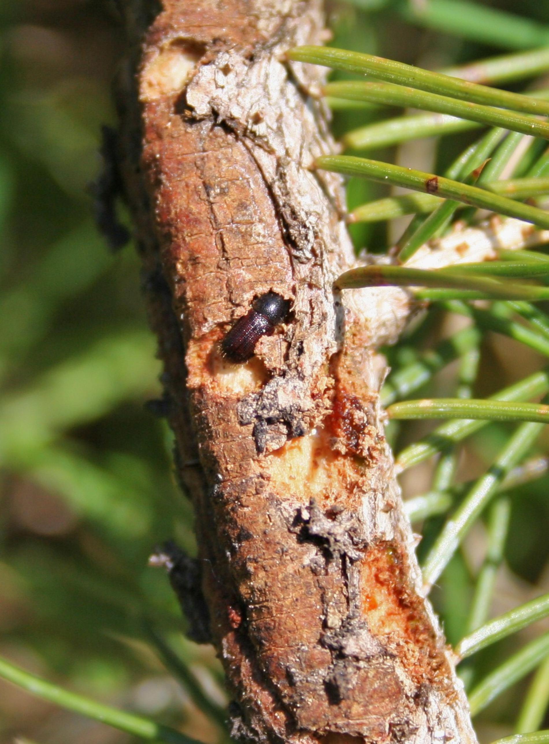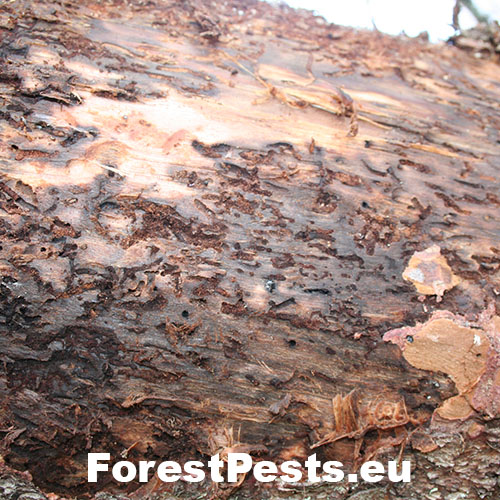 This member of the bark beetle family colonizes thicker trunk sections of dying trees. Primarily, however, it prefers felled or broken trunks lying on moist ground and often inhabits stumps, too. The adult is a brown beetle, 3-4 mm long. Larvae excavate gallery, which is normally single-branched, with larval tunnels on both sides. In case of massive attack the feeding galleries are intersected. Its more common in higher altitudes. The relative species Dryocoetes hectographus can also be found on Norway spruce.