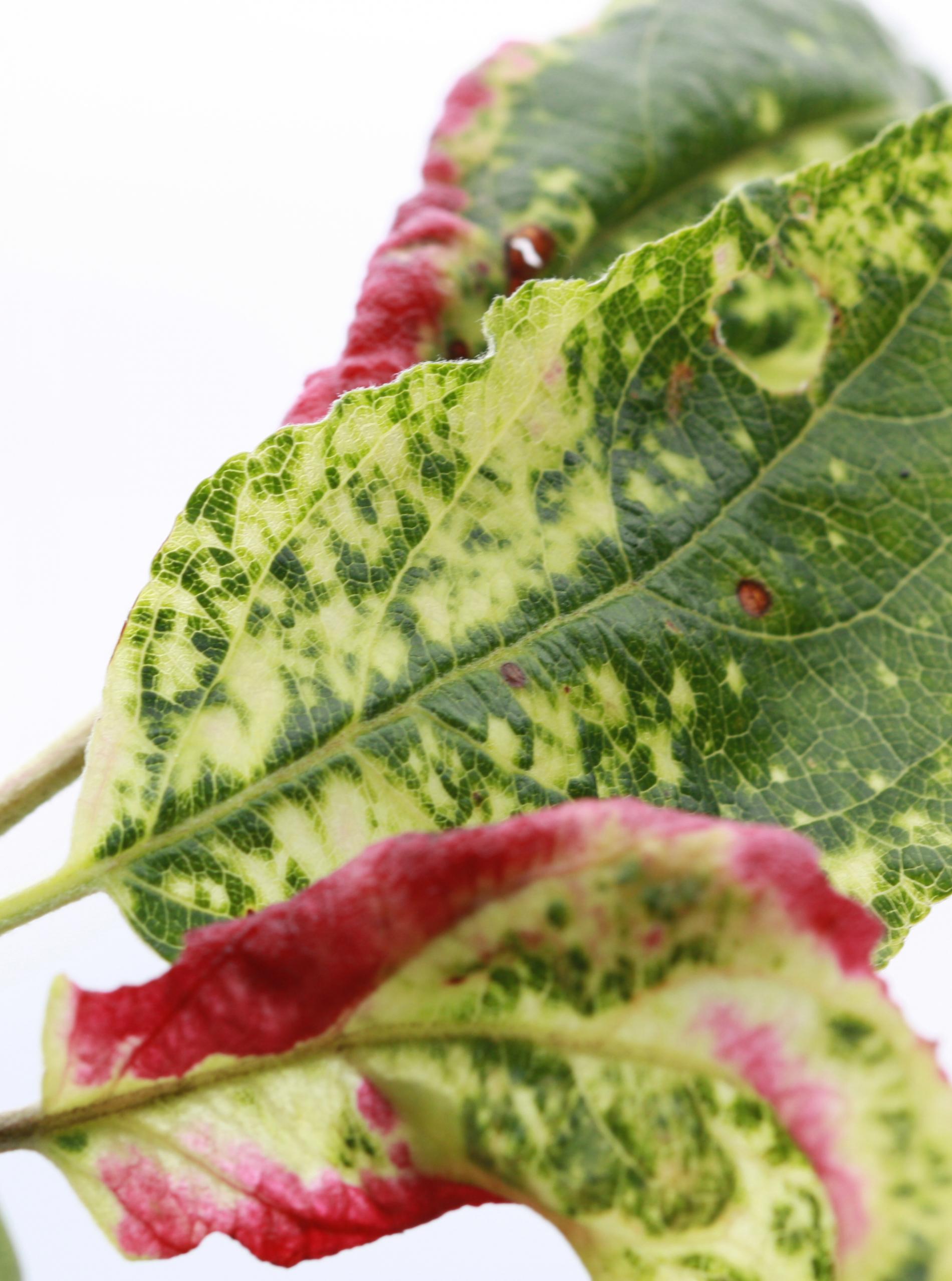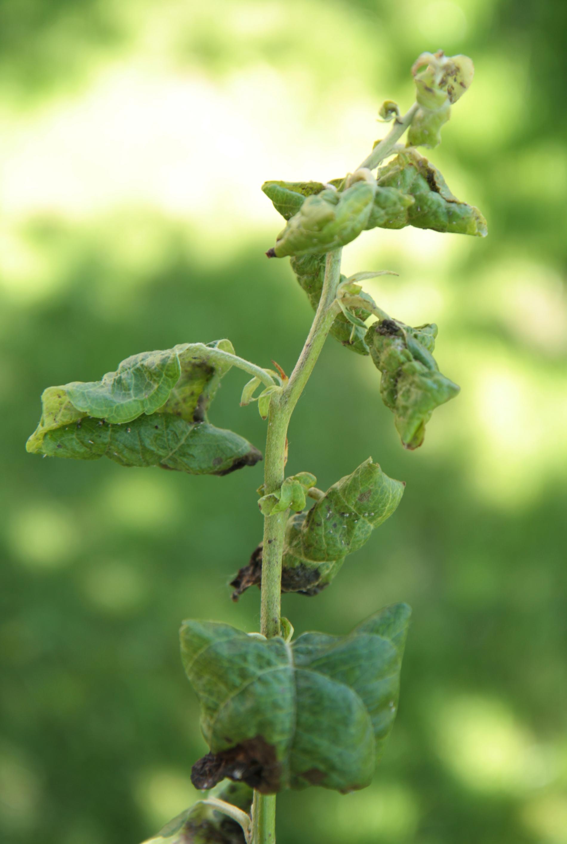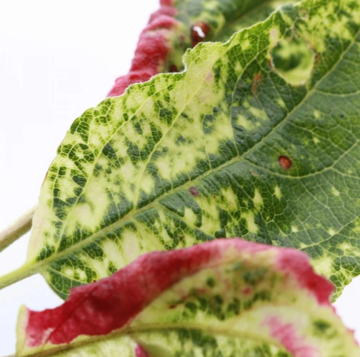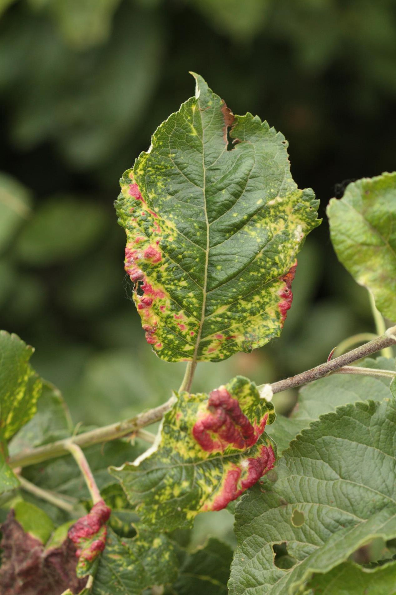Yellow, later red discoloration of the surface of deformed leaves.
