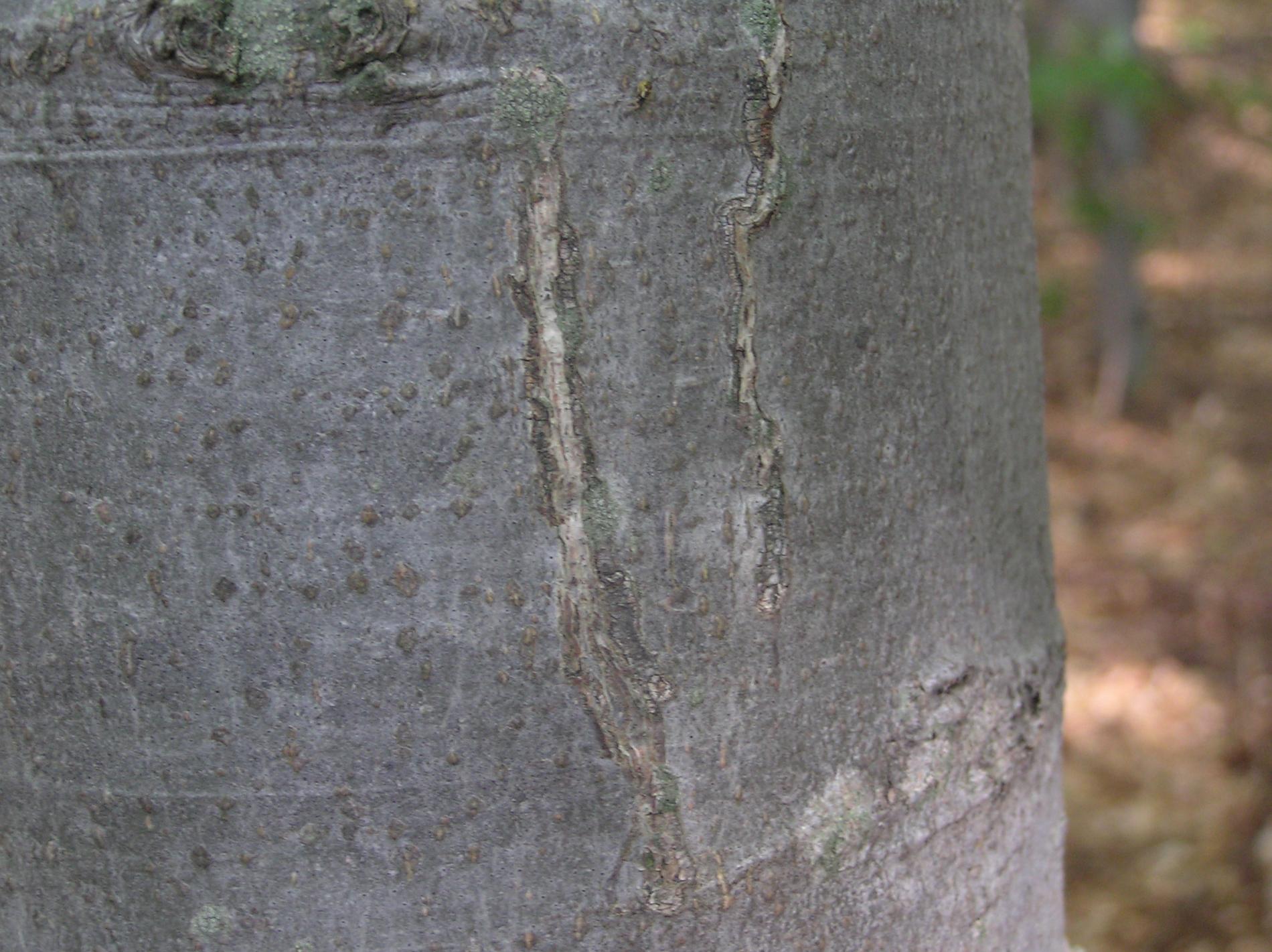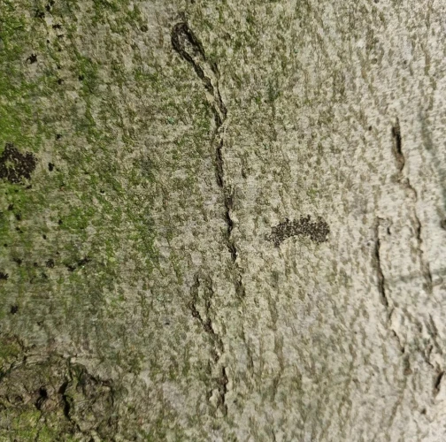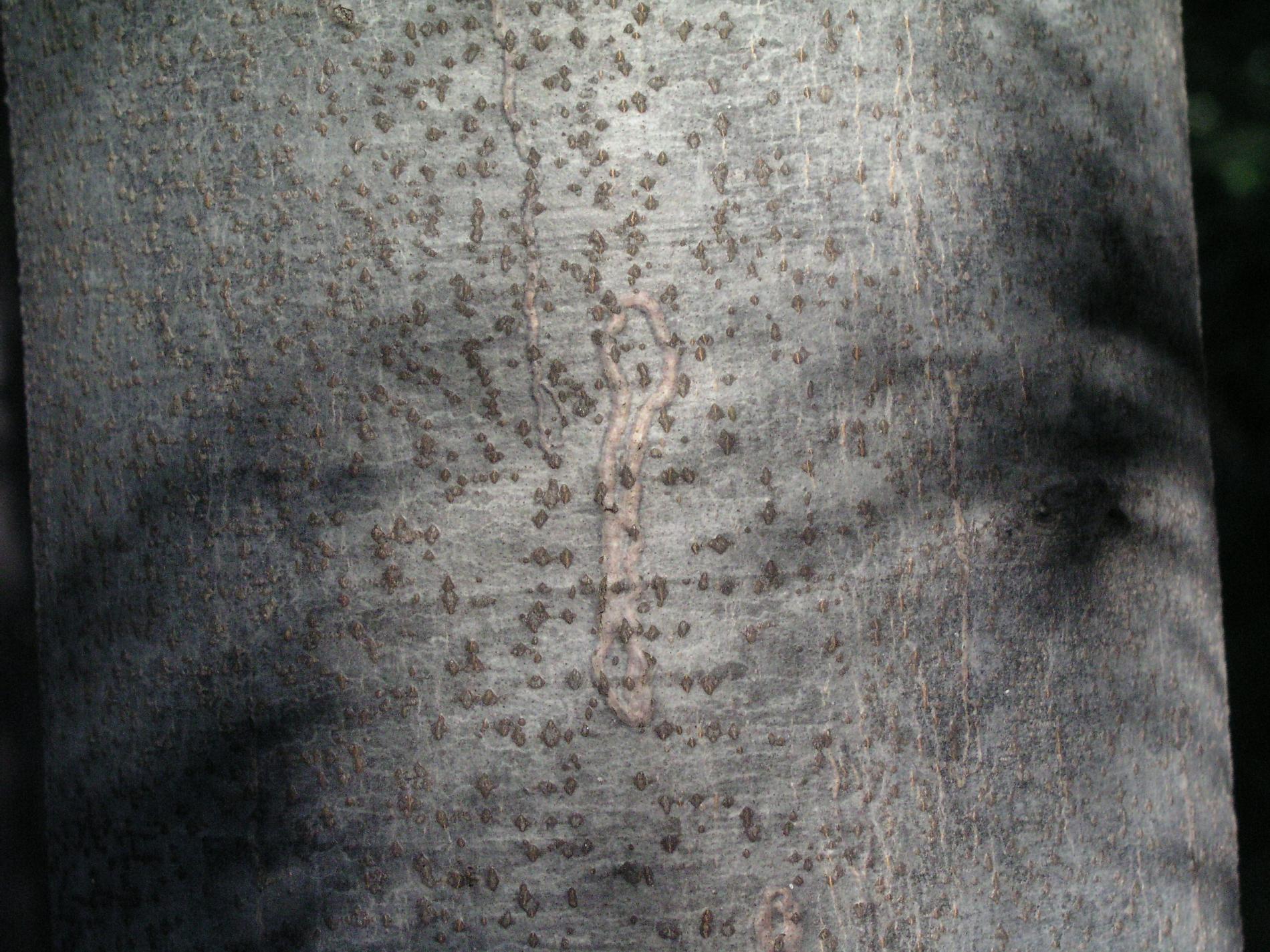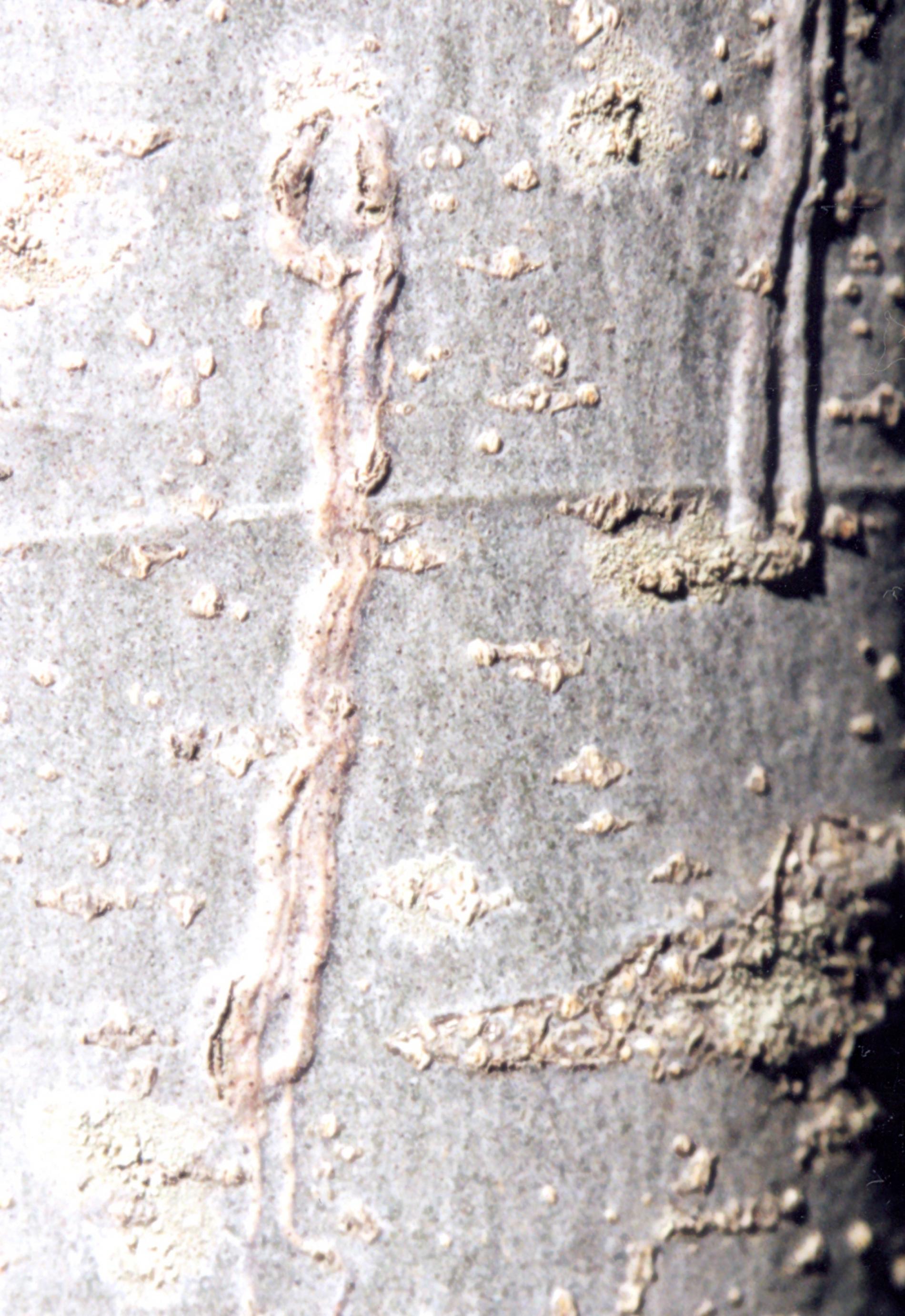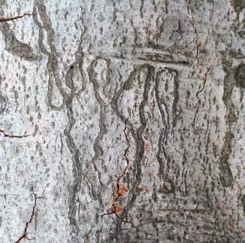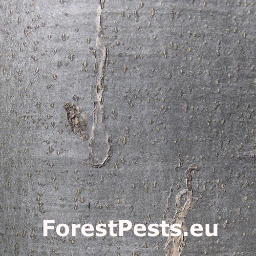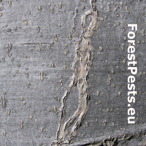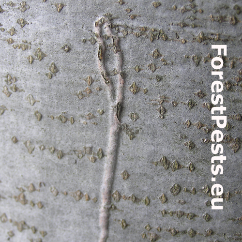 Feeding galleries under the bark, visible from the outside of the bark on the beech trunk. Locally very frequent.