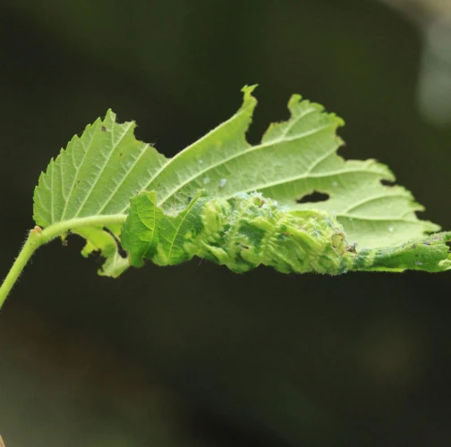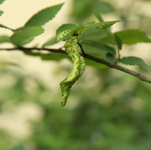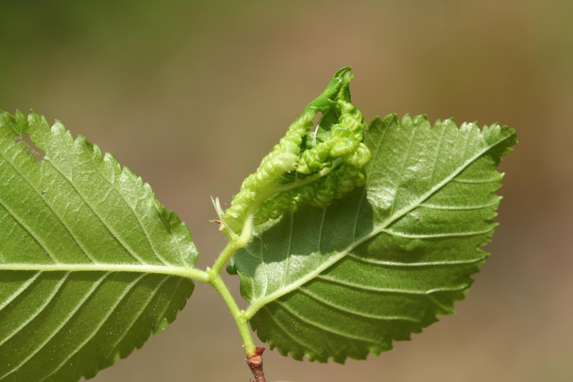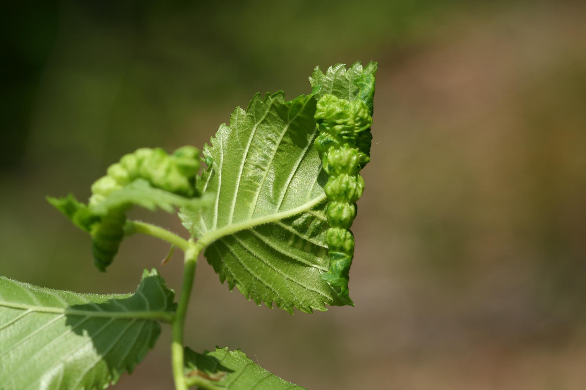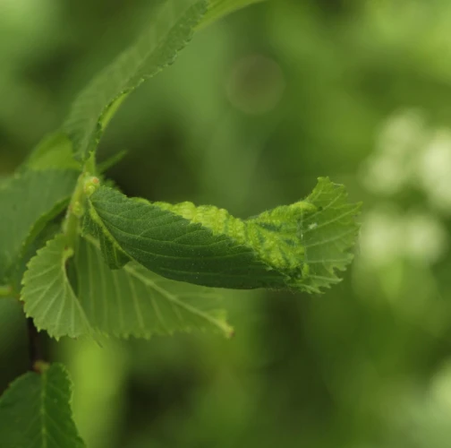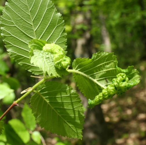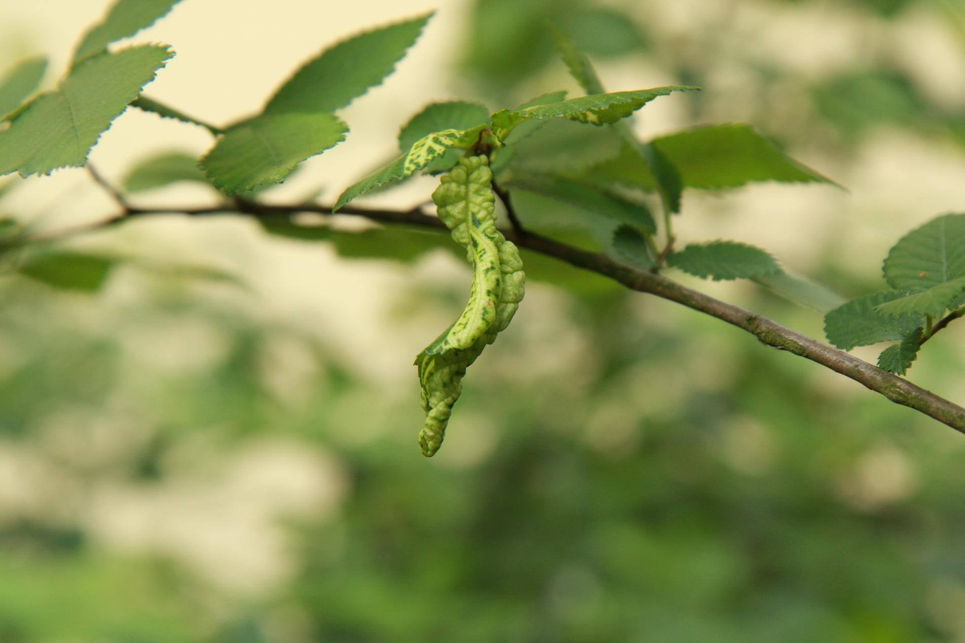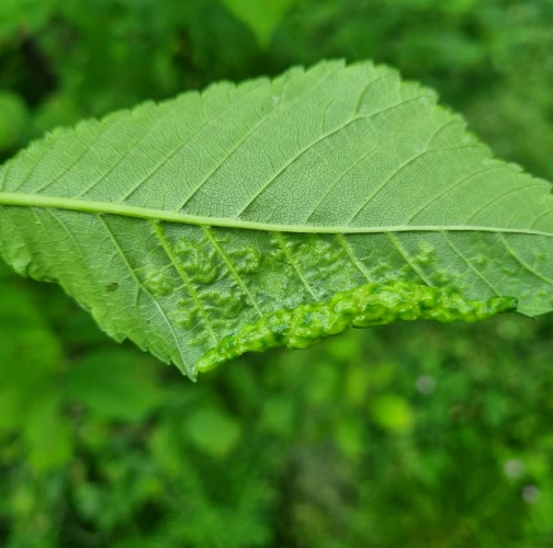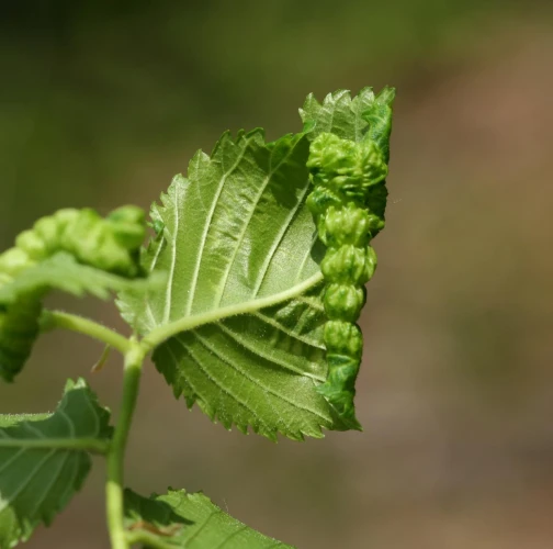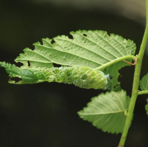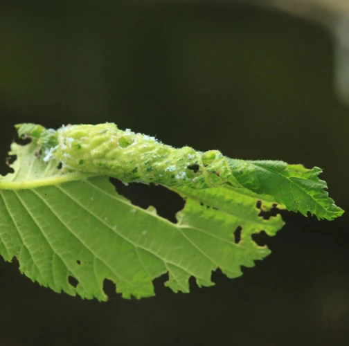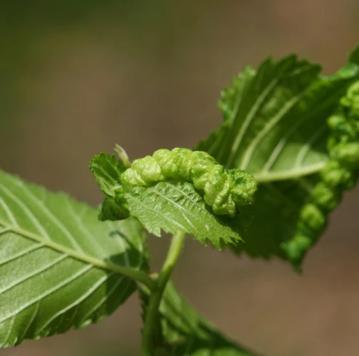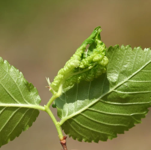 The elm-currant aphid, scientifically known as Eriosoma ulmi, belongs to the family Aphididae and is commonly found in Asia and Europe. It feeds on plant tissue by sucking it out. The aphid induces the formation of abnormal plant growths called galls on elm trees (Ulmus species), which serve as their primary host. For completing their life-cycle, they require a secondary host, the roots of currant bushes (Ribes species), on which they also feed. Galls are yellowish-green or pinkish in color are formed when one half of a leaf becomes crinkled and rolls inwards, forming a tubular pouch. In the spring and early summer, numerous aphids inhabit the gall and are usually brownish to dull green and covered in wax.