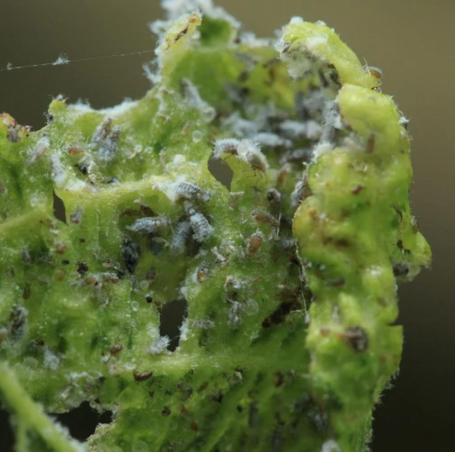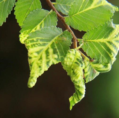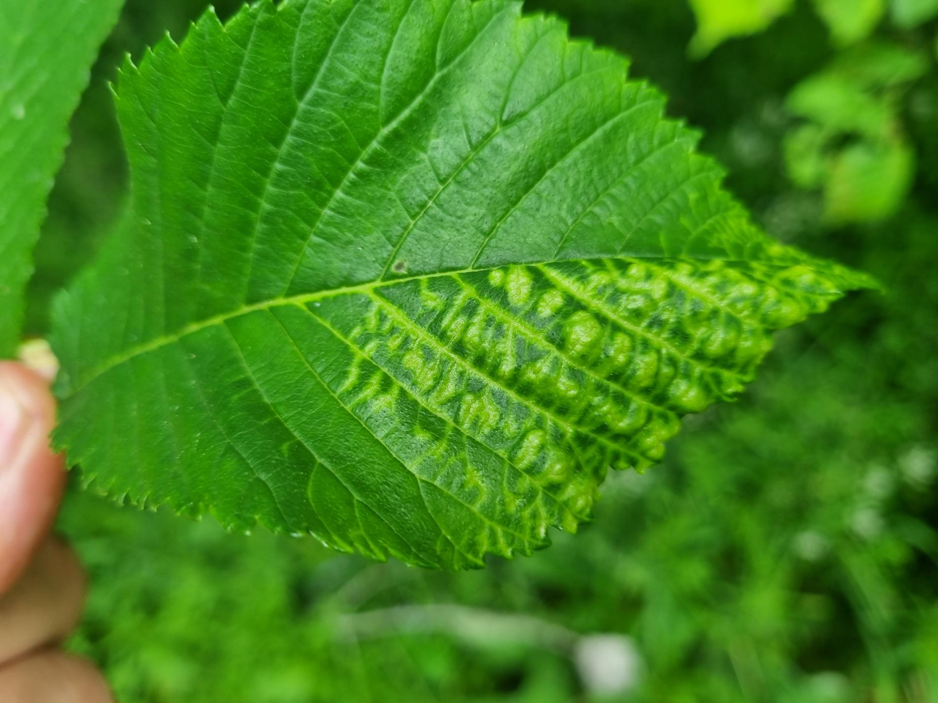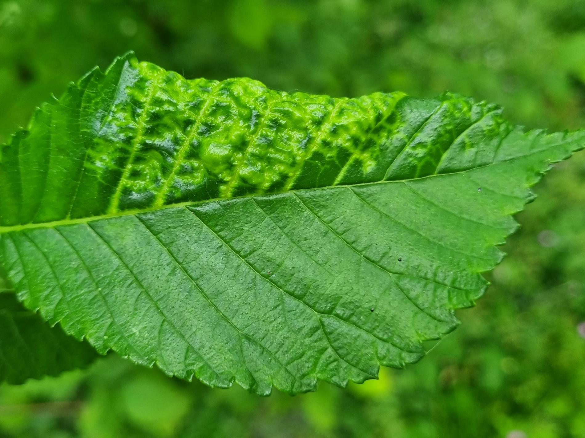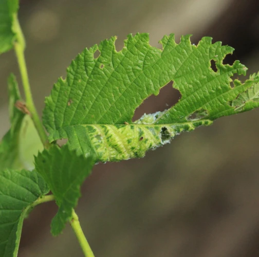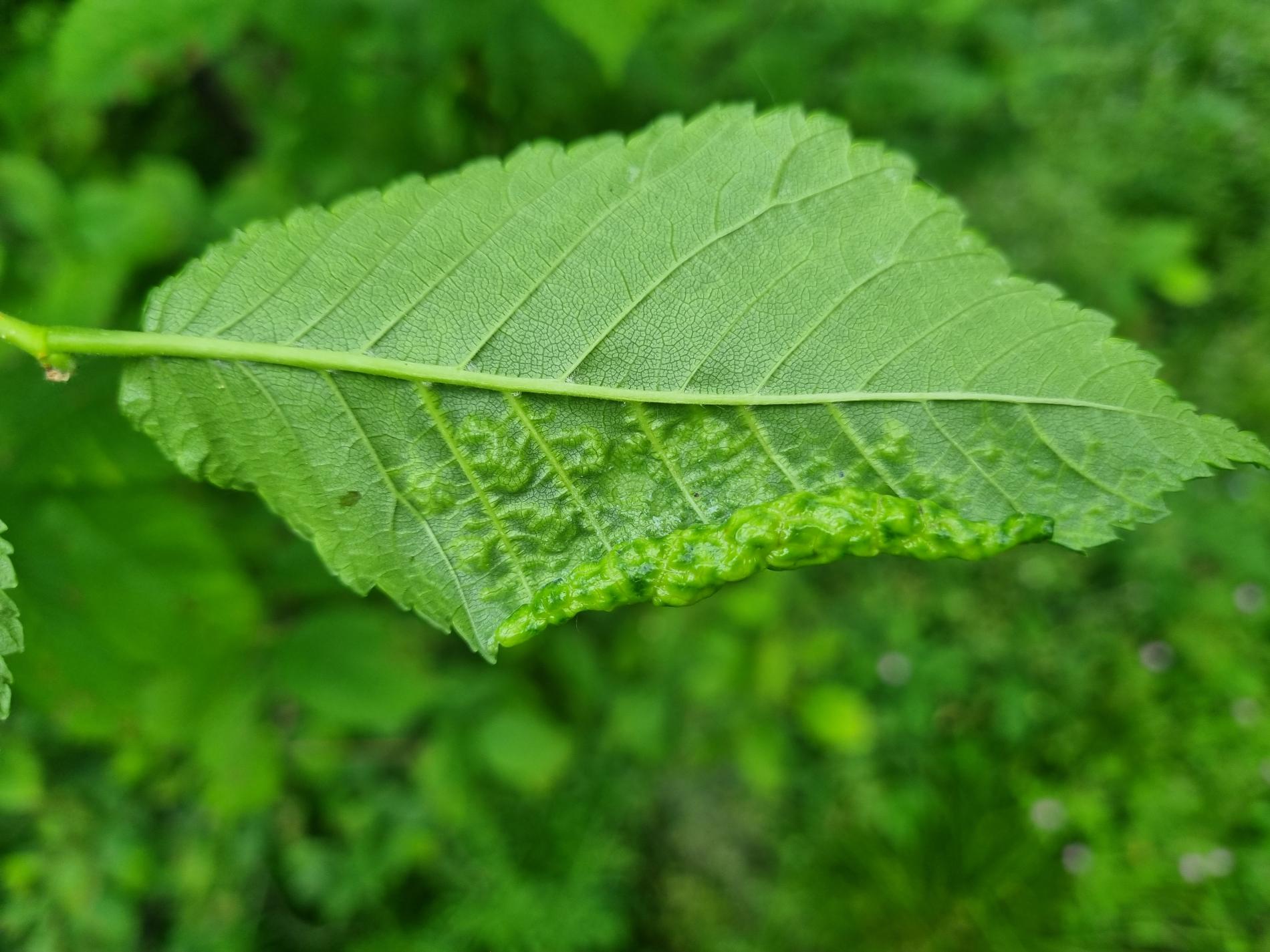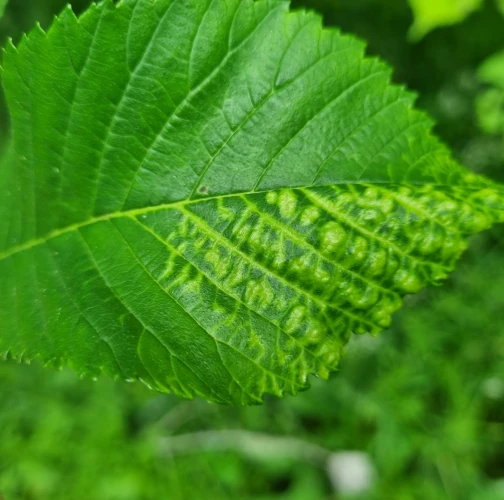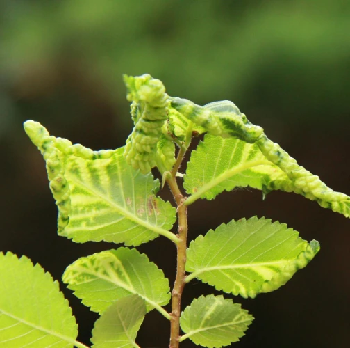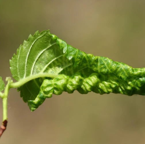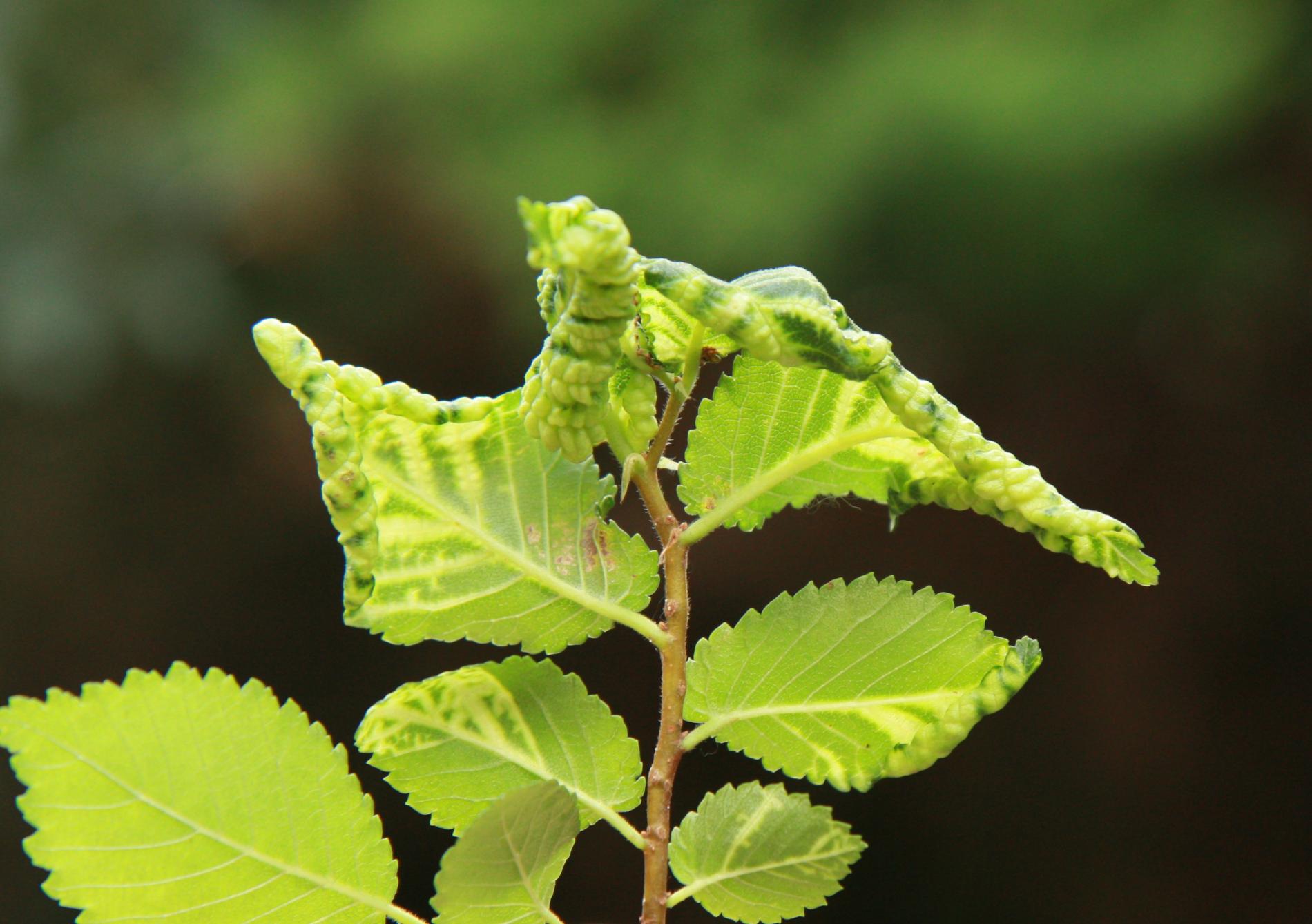 The elm-currant aphid, scientifically known as Eriosoma ulmi, belongs to the family Aphididae and is commonly found in Asia and Europe. It feeds on plant tissue by sucking it out. The aphid induces the formation of abnormal plant growths called galls on elm trees (Ulmus species), which serve as their primary host. For completing their life-cycle, they require a secondary host, the roots of currant bushes (Ribes species), on which they also feed. Galls are yellowish-green or pinkish in color are formed when one half of a leaf becomes crinkled and rolls inwards, forming a tubular pouch. In the spring and early summer, numerous aphids inhabit the gall and are usually brownish to dull green and covered in wax.