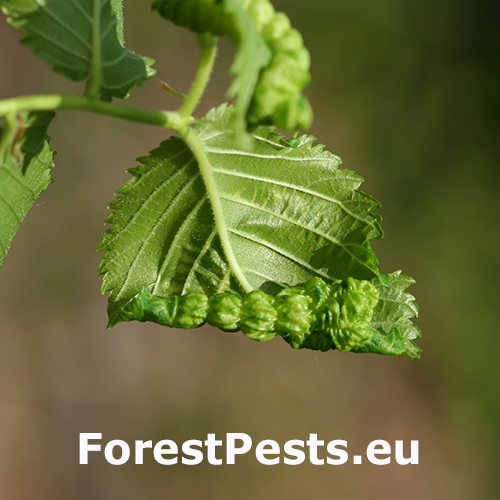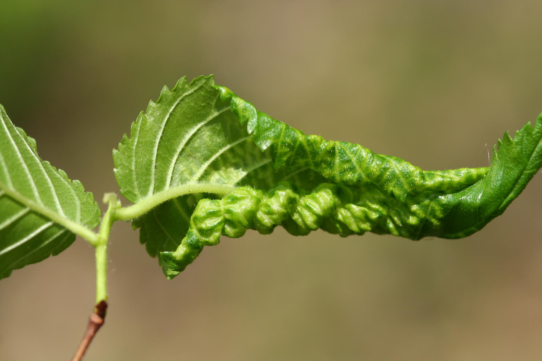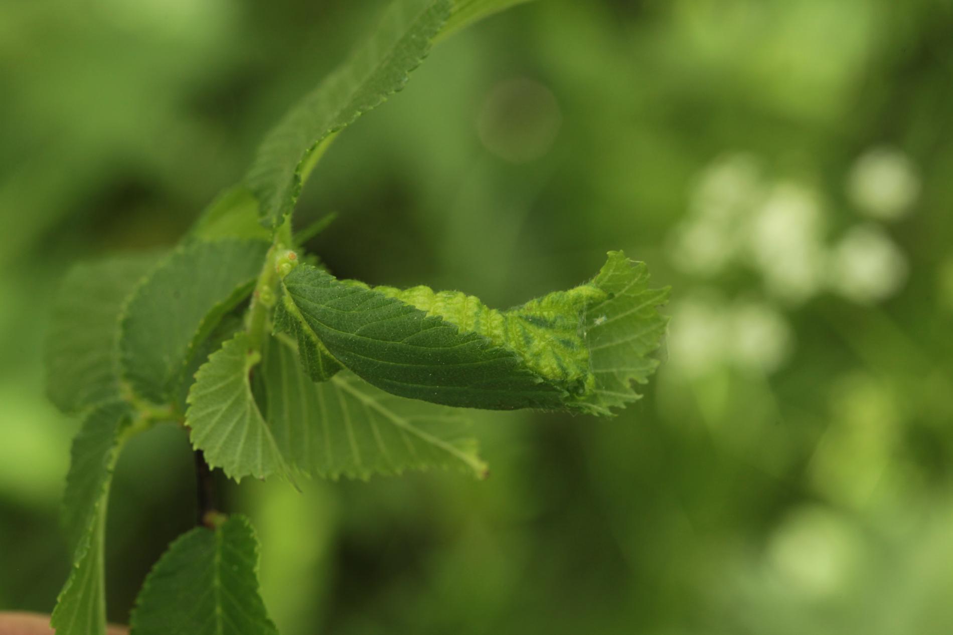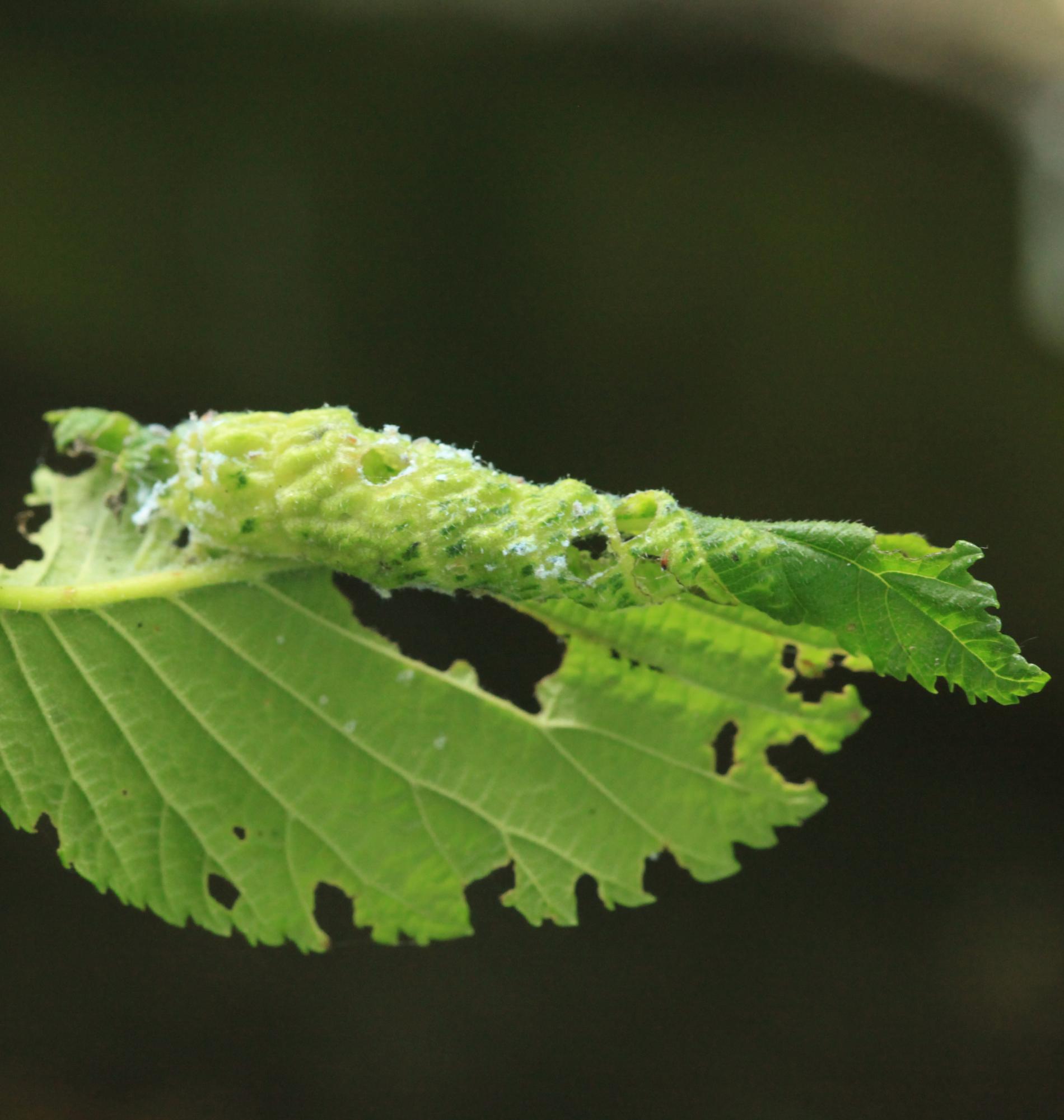 Galls are yellowish-green or pinkish in color are formed when one half of a leaf becomes crinkled and rolls inwards, forming a tubular pouch.