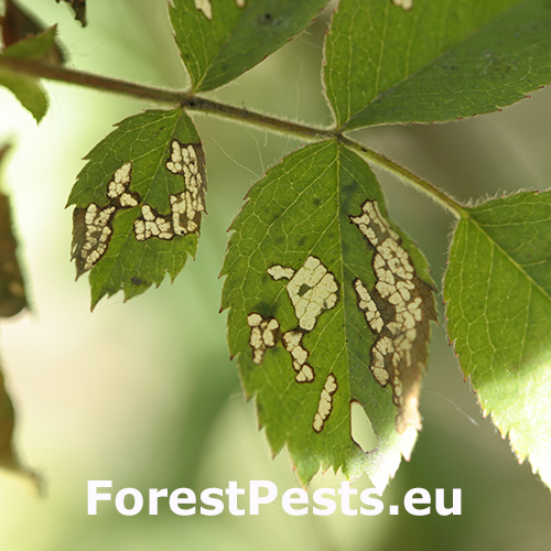 Larvae are green with a smooth body and a brown head. The feeding results in the skeletonization of the leaves.
