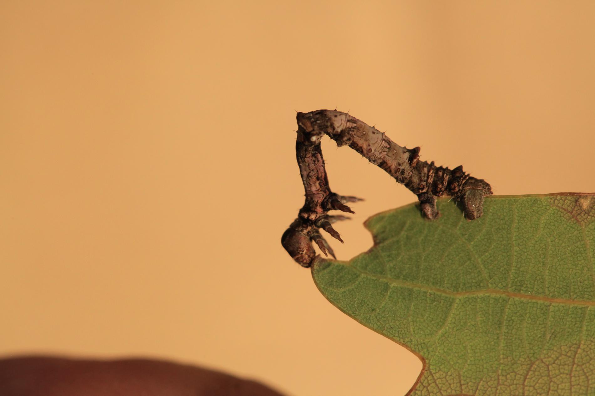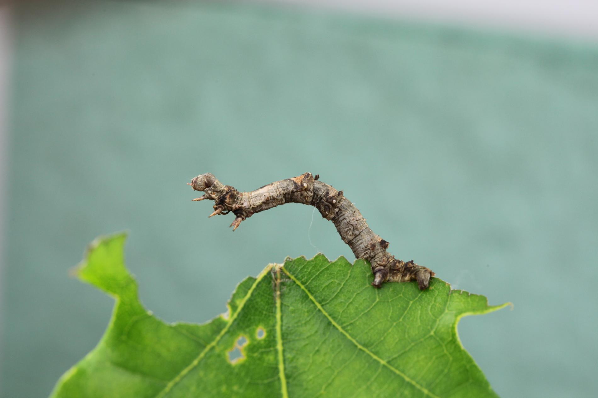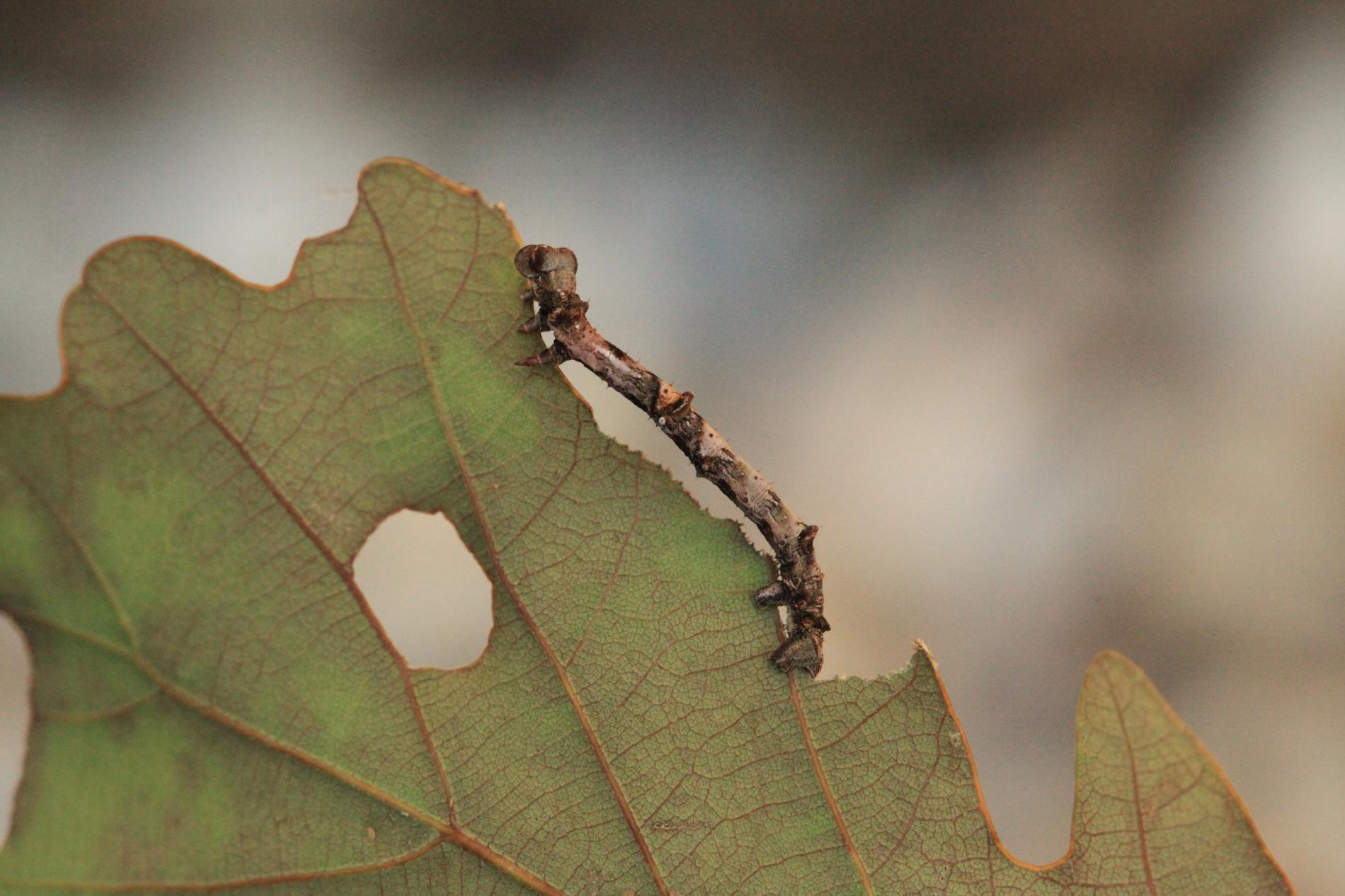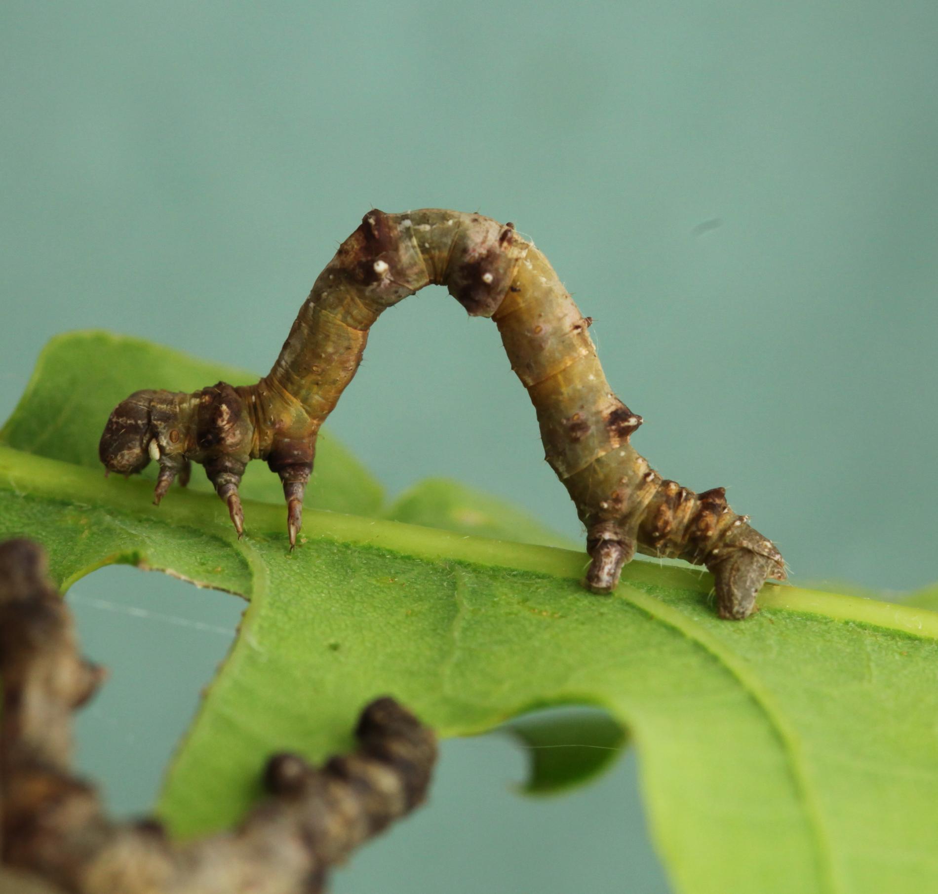 The caterpillar is light yellow-green to green with brown growths resembling a dry branch.