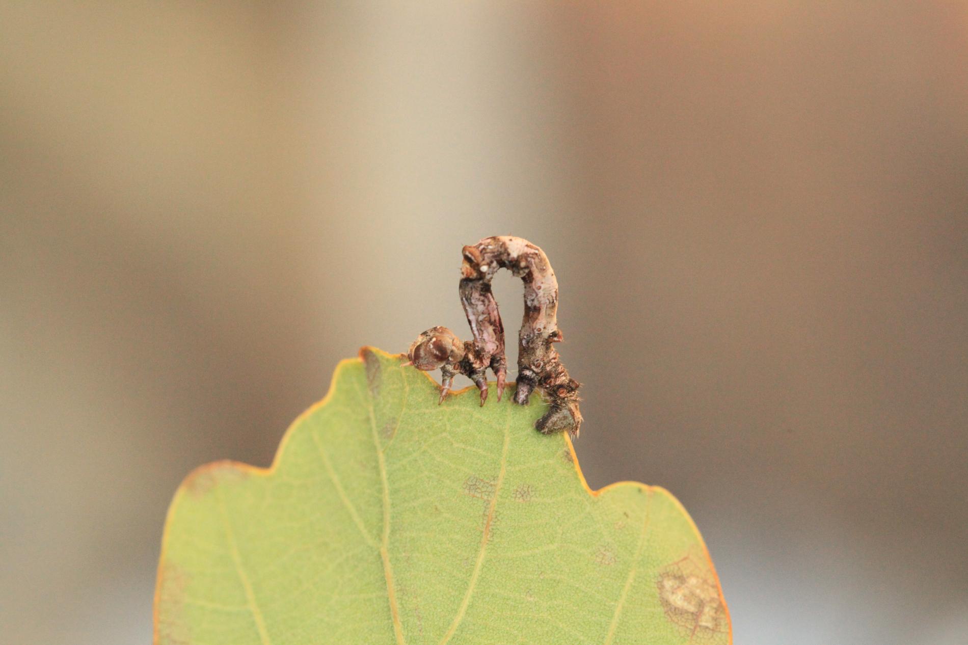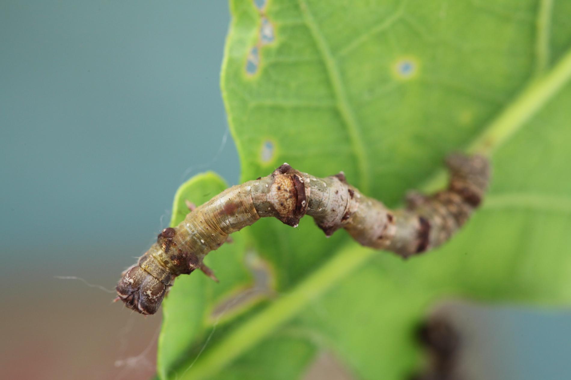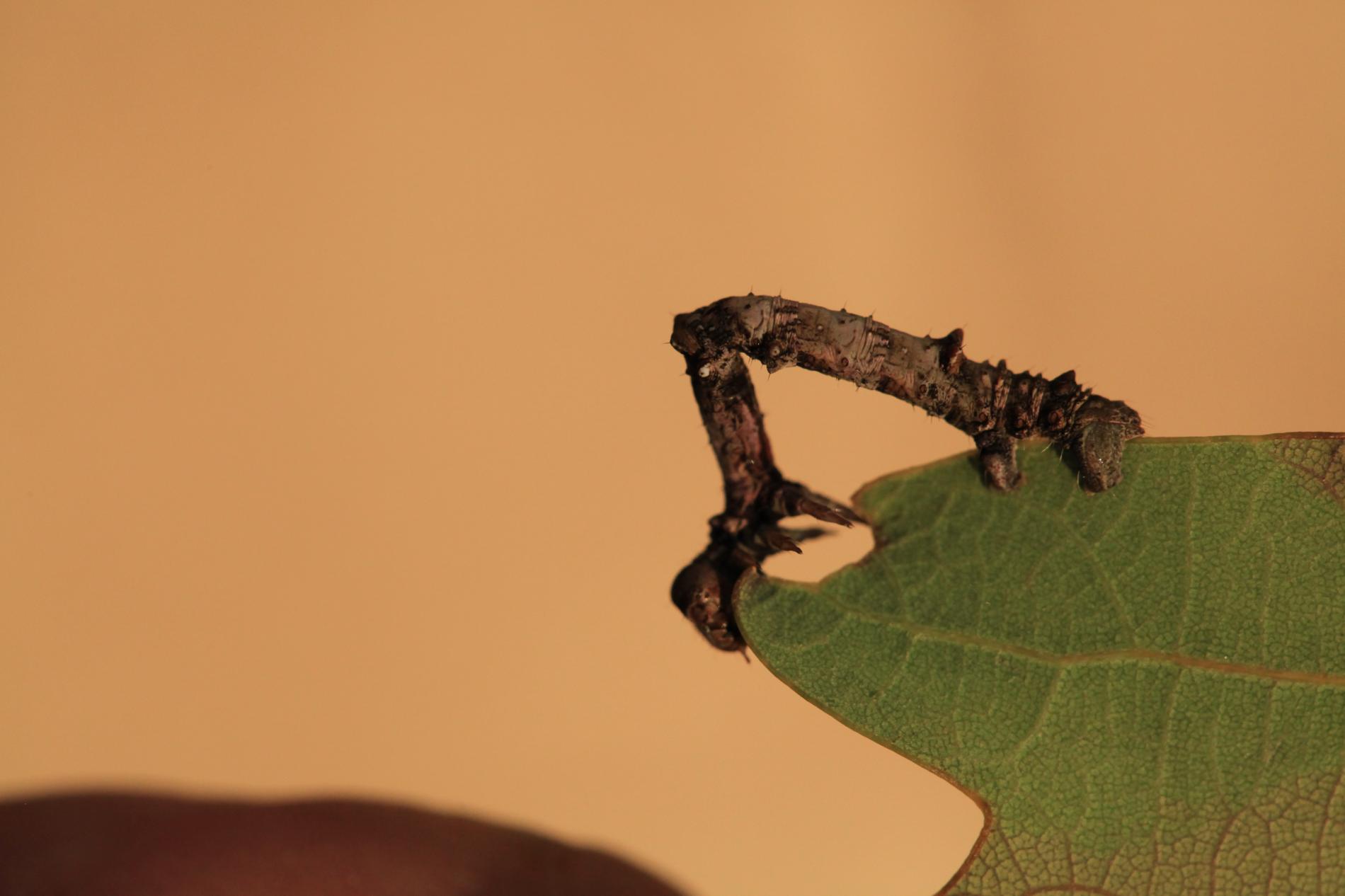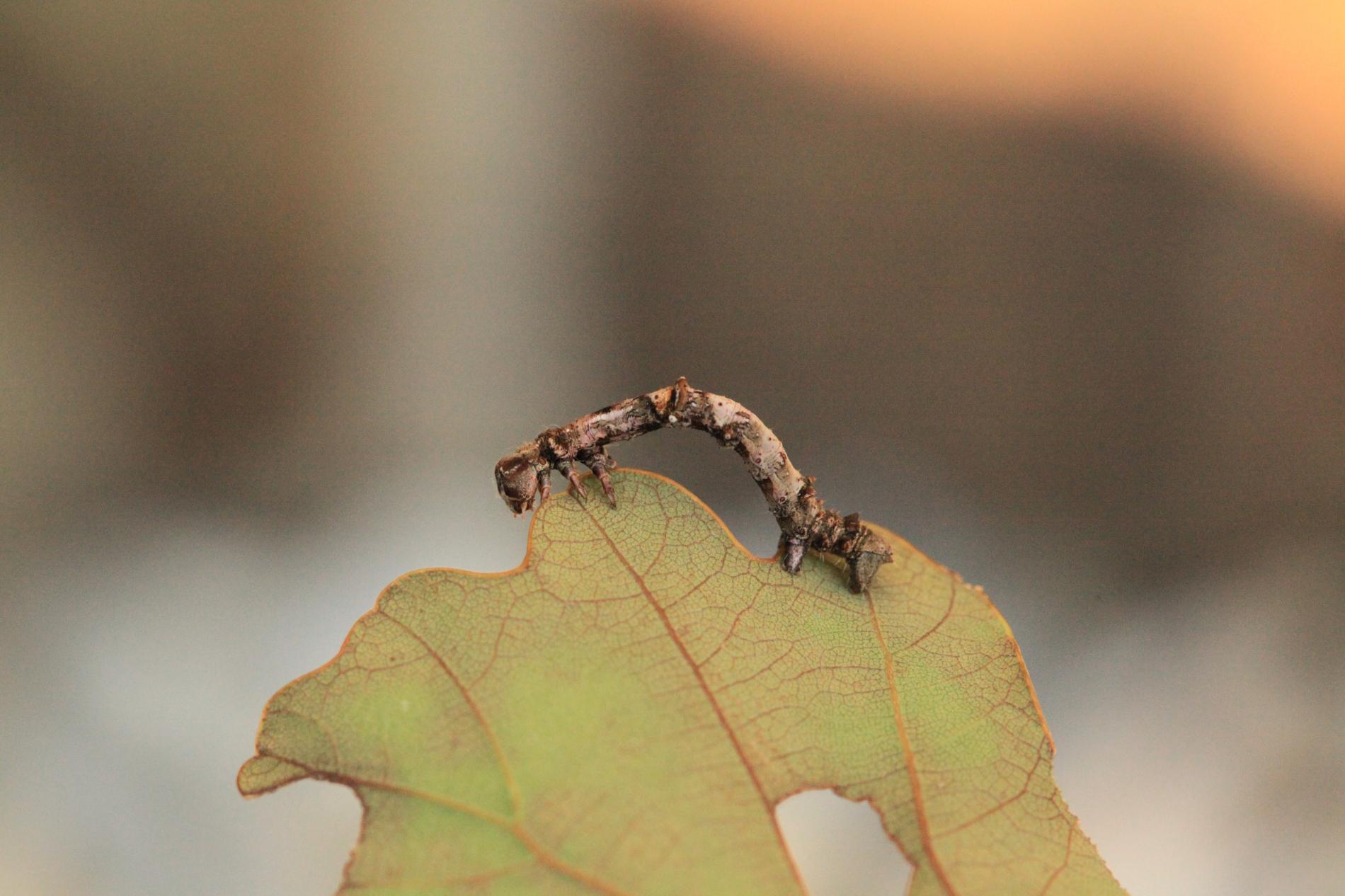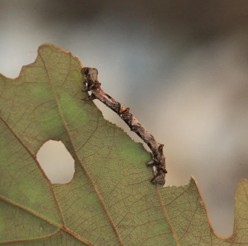 The caterpillar is light yellow-green to green with brown growths resembling a dry branch.