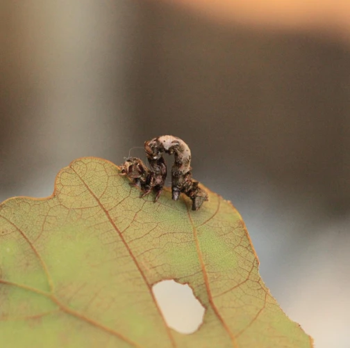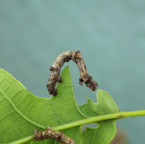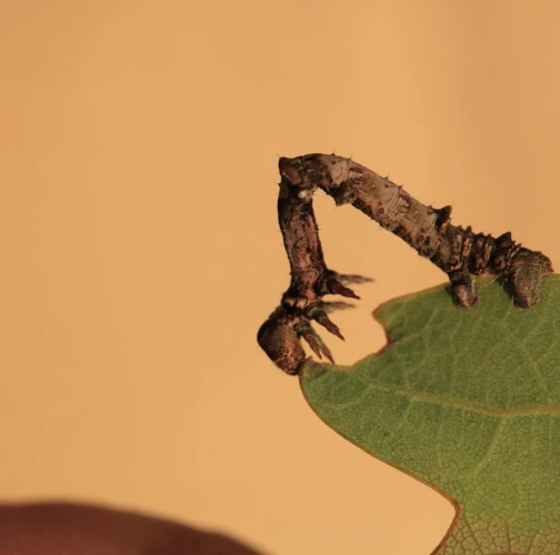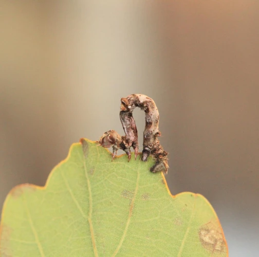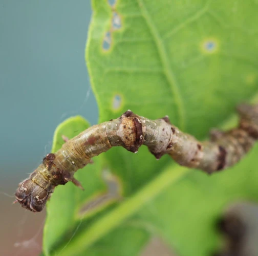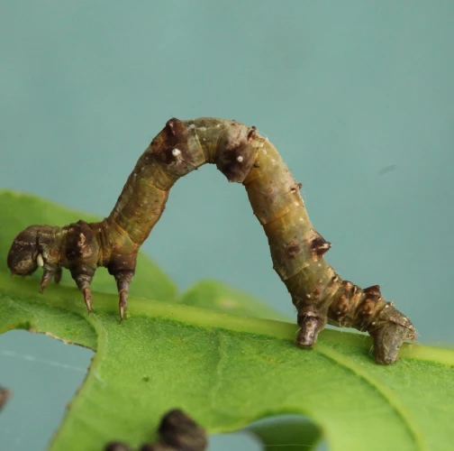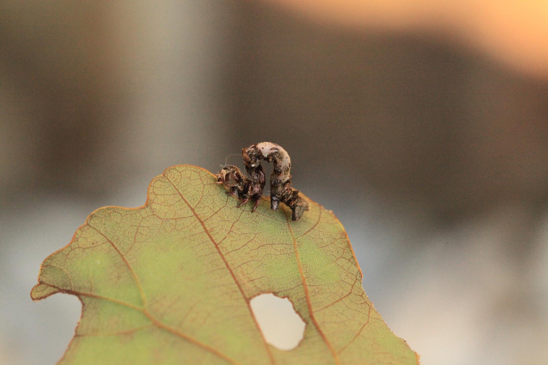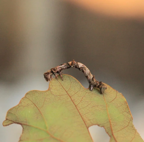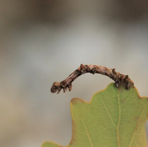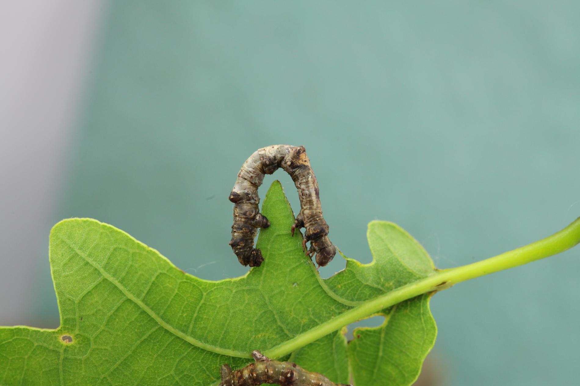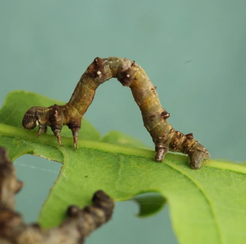 The caterpillar is light yellow-green to green with brown growths resembling a dry branch.