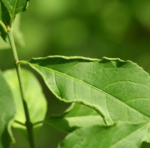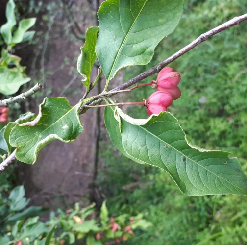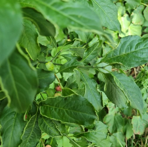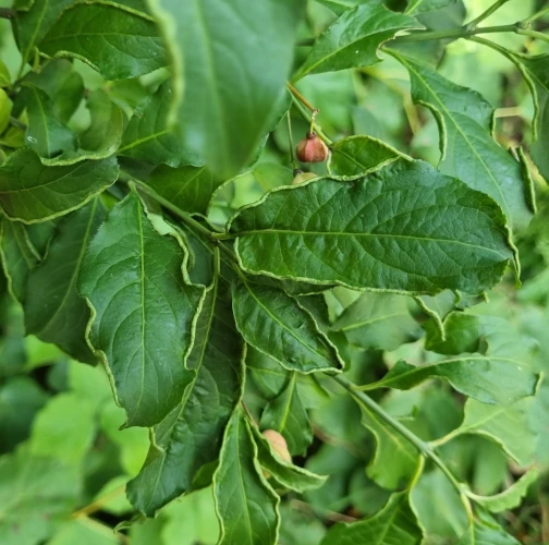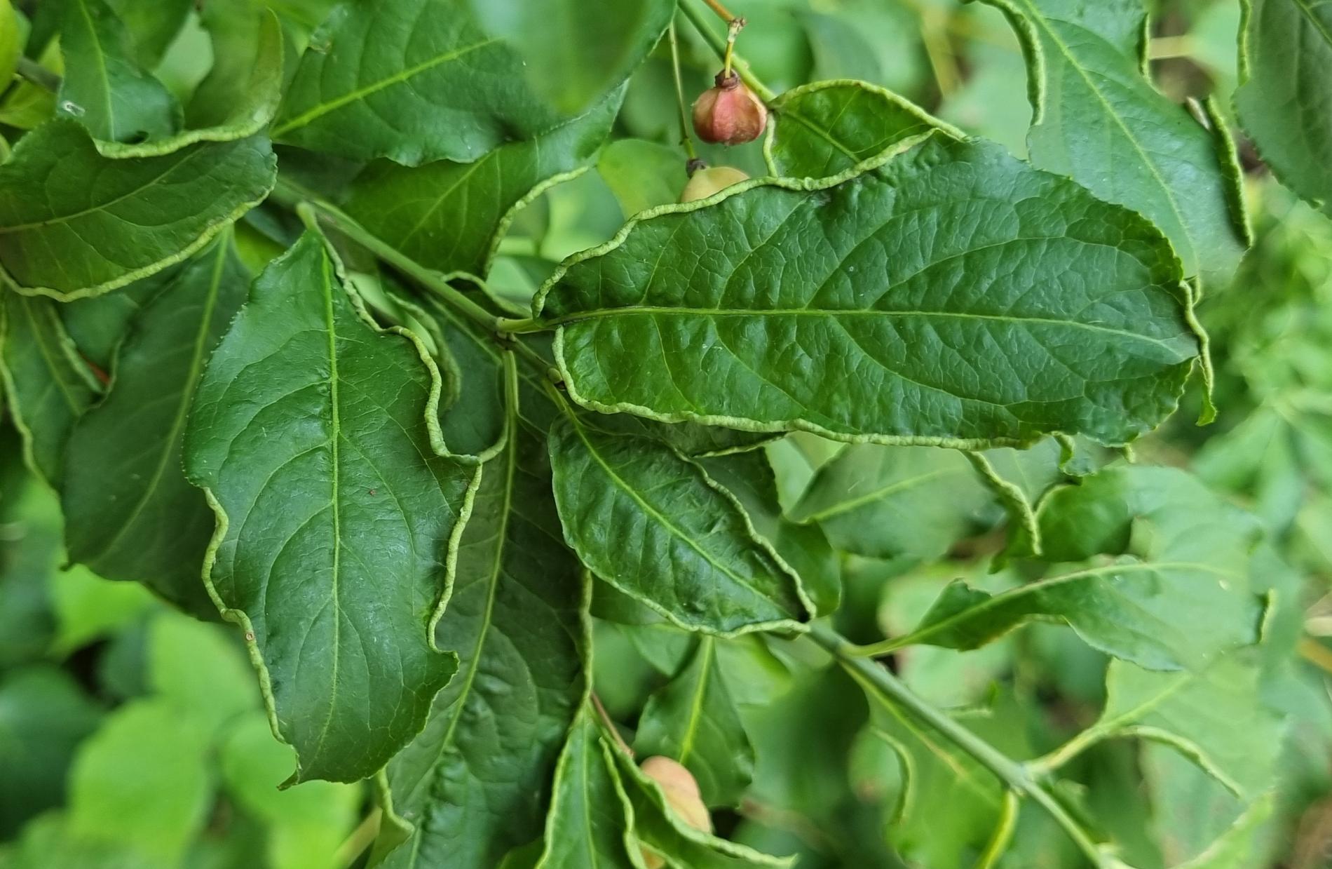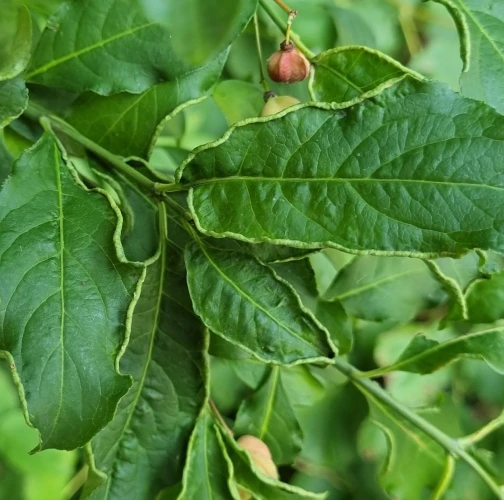 The spindle leaf edge mite Eriophyes convolvens causes a distinctive type of damage. This species is know also under the names as Stenacis convolvens or Stenacis euonymi. Infested Euonymus leaves (spindle tree) show significant curling of the leaf edges upwards. Leaf discoloration does not occur, so the leaves remain green. Often, entire sections of branches are affected, rather than just individual leaves. Despite the visual impact on the plant, its growth is not affected and anly aesthetical tree value can be lowered. This mites have a worm- or spindle-shaped body measuring only 0.1 to 0.2 mm in length and 20-50 µm in width. Identifying them requires a microscope, and precise species identification typically requires specialist expertise. Several generations occur annually, with overwintering usually in buds or bark crevices. In spring, they colonize and feed on young leaves, resulting in the observed damage. The damage primarily affects the appearance of the plant without impairing its growth. Early pruning of affected branch sections is recommended as a preventive measure.