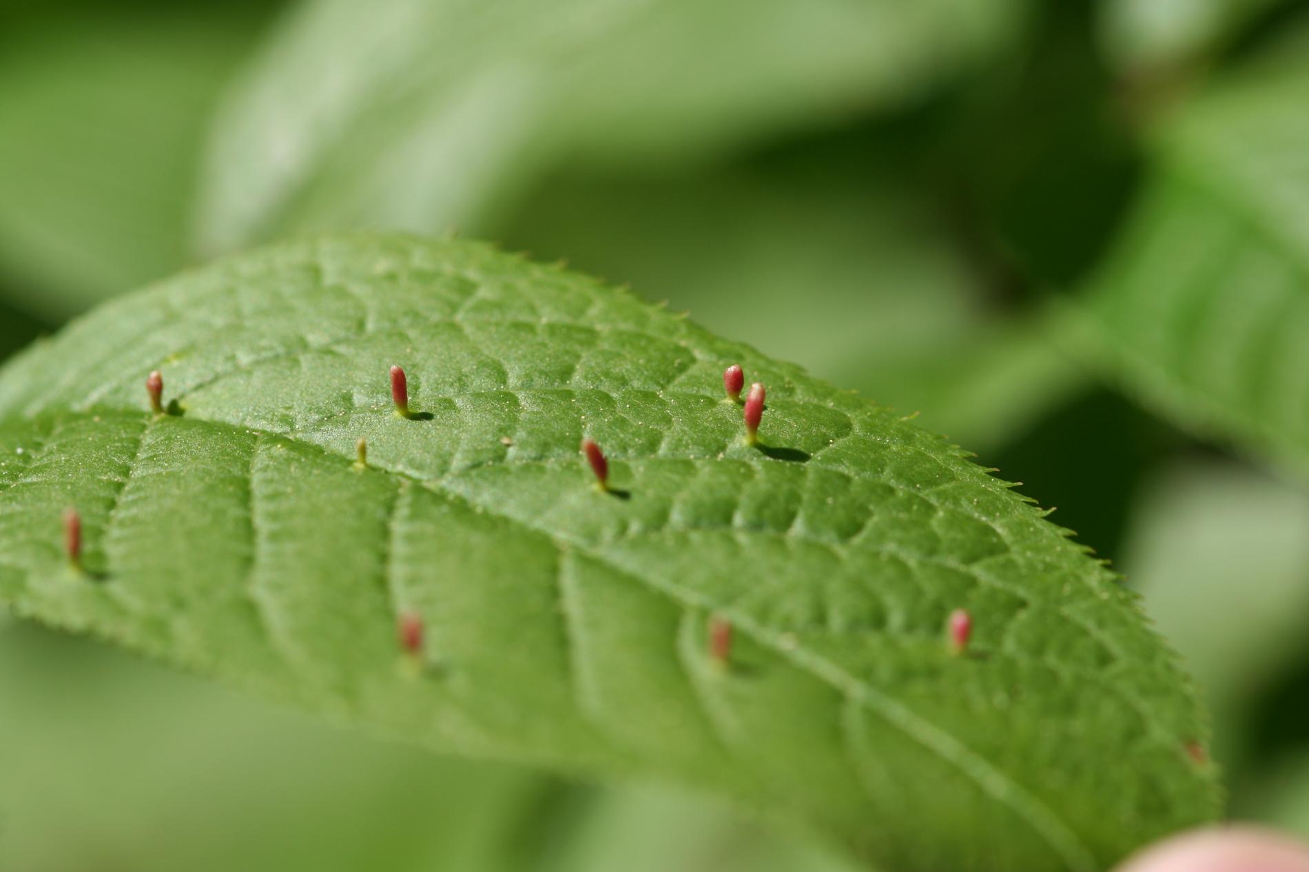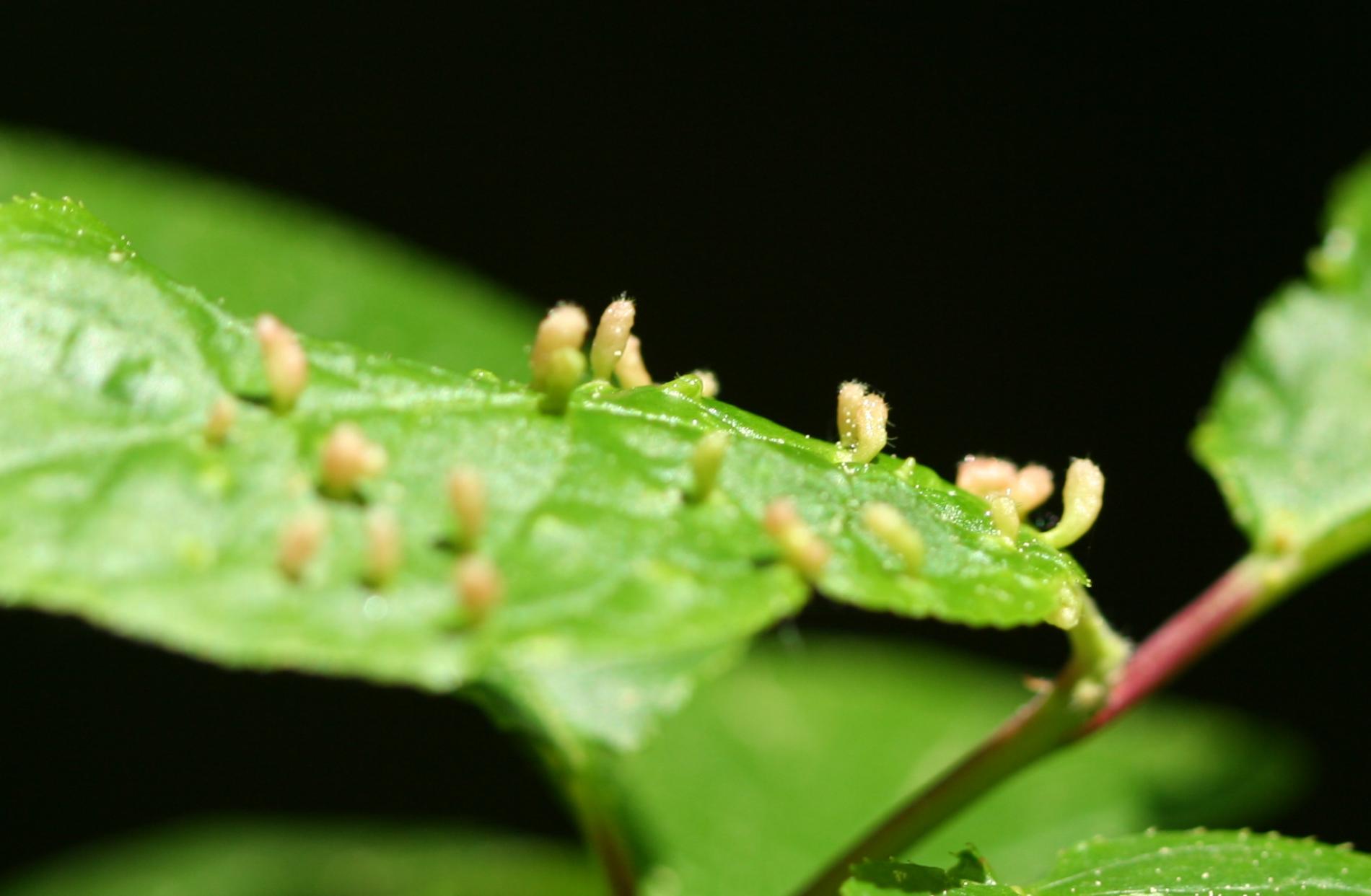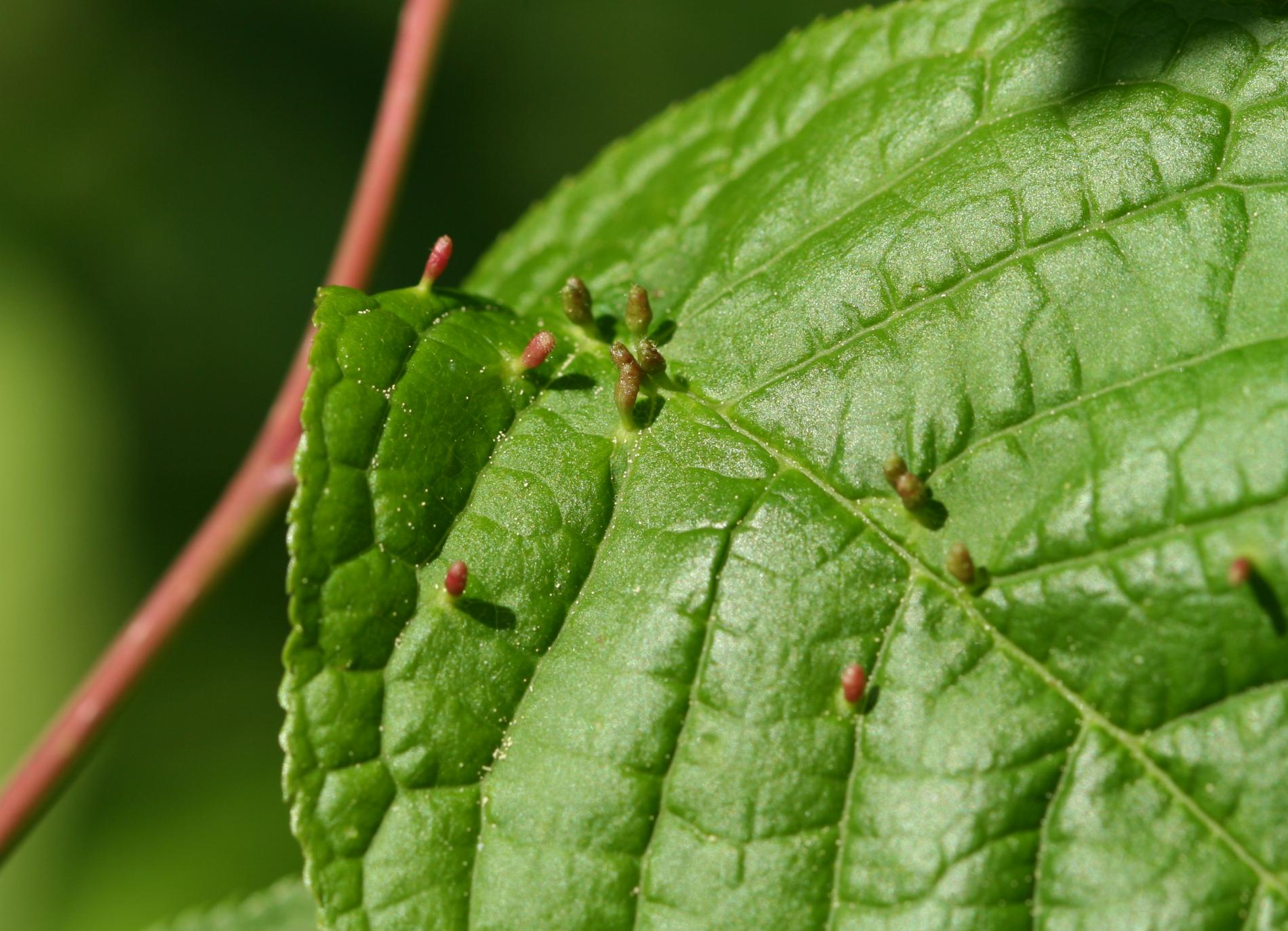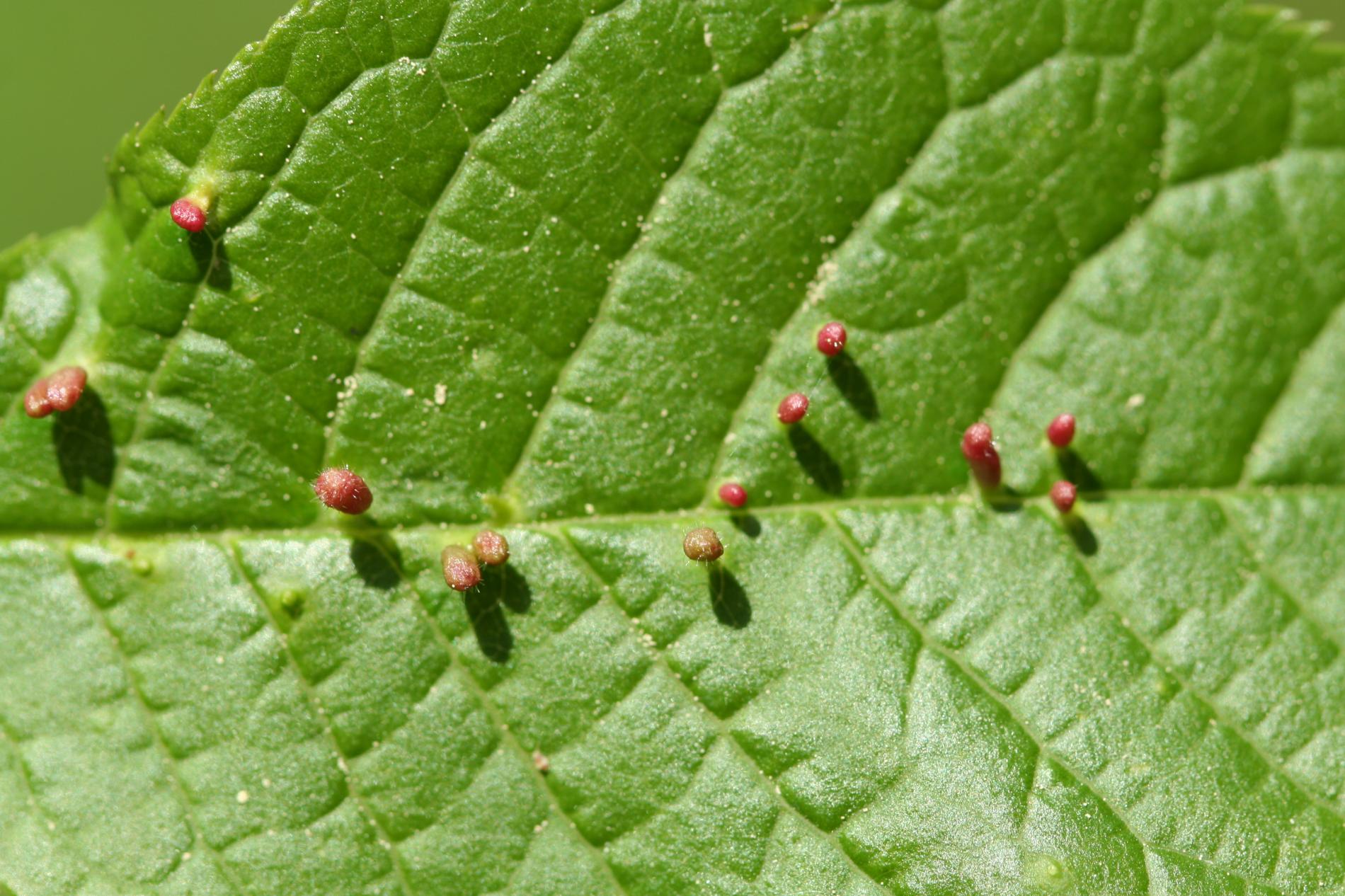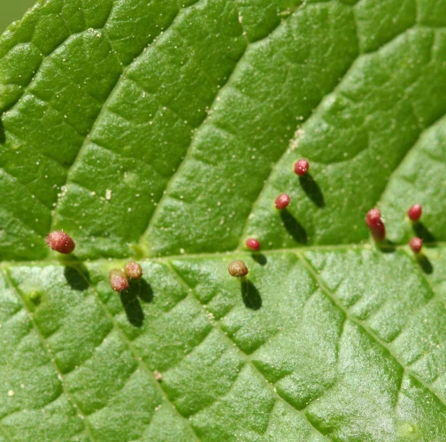 Tiny galls on the upper side of the leaf. They can be spherical, elliptical to elongated, green, yellow, pink or red.