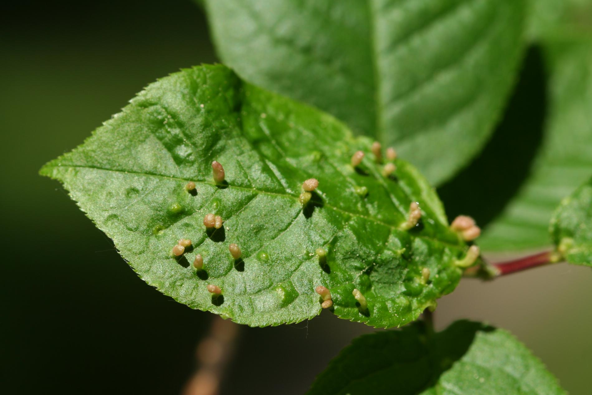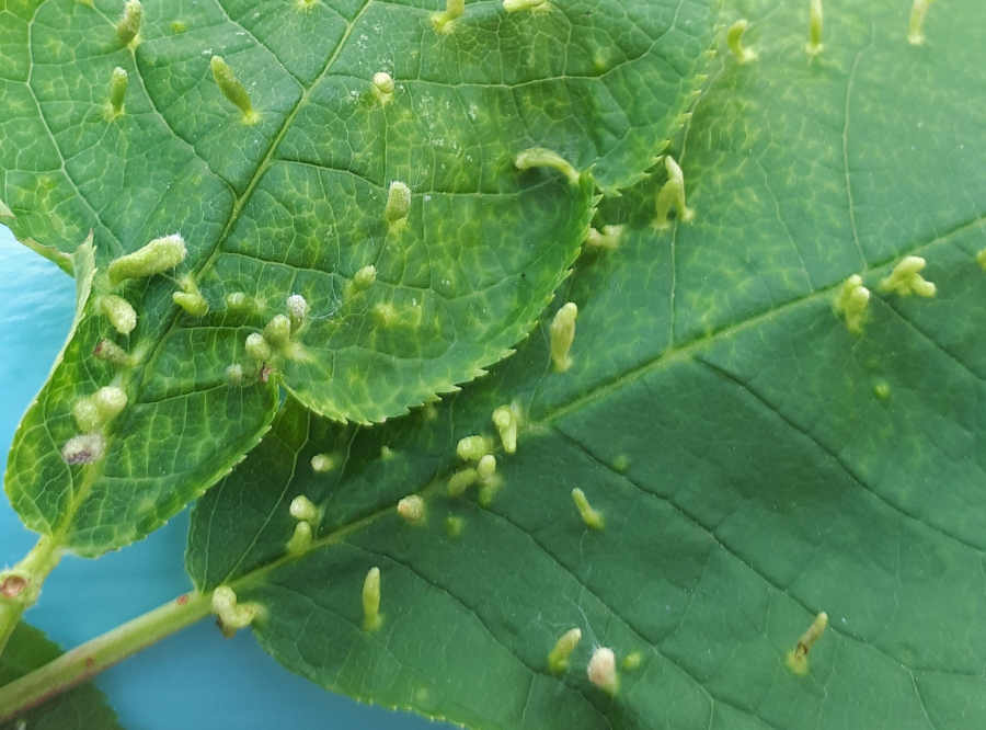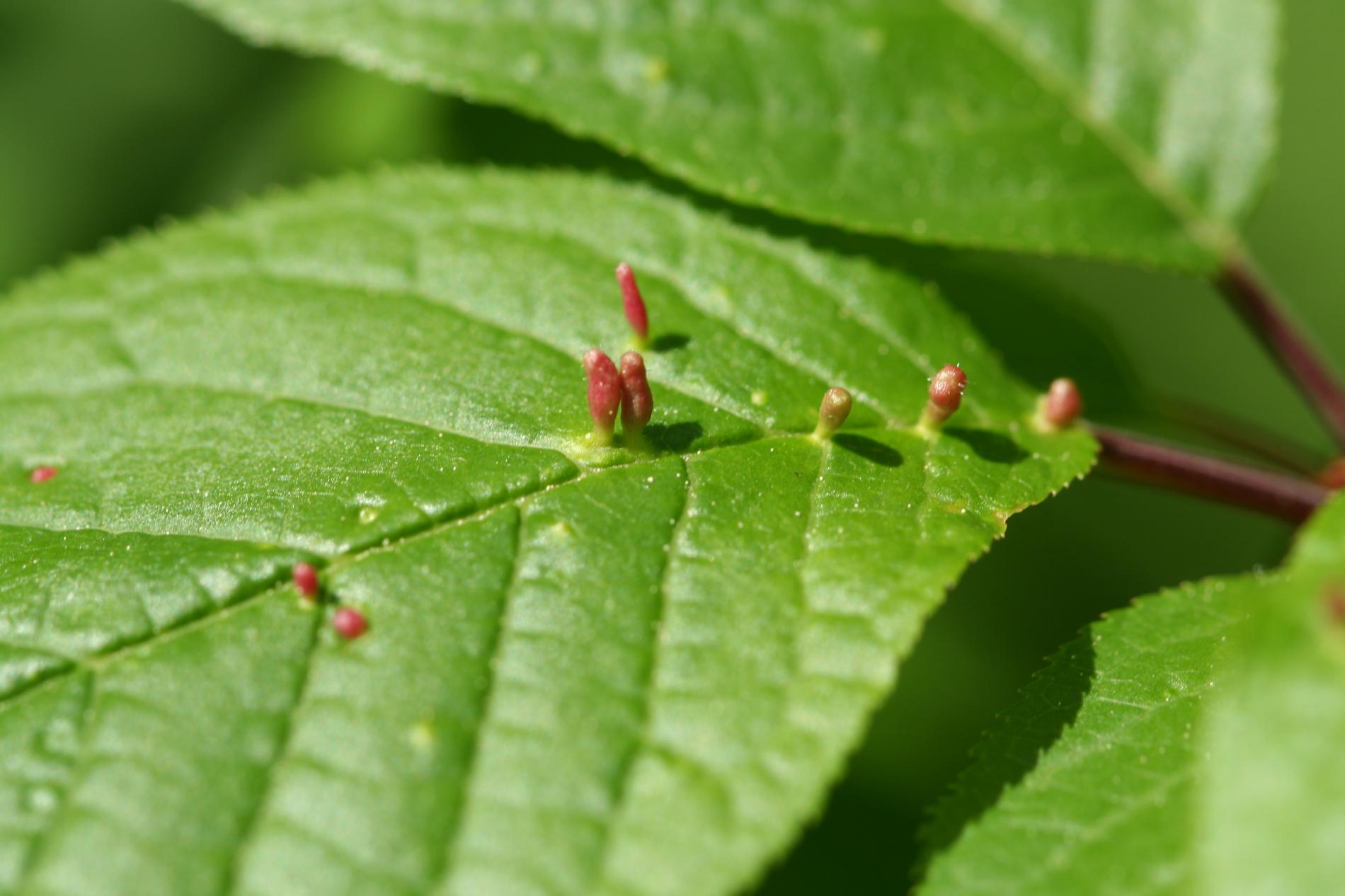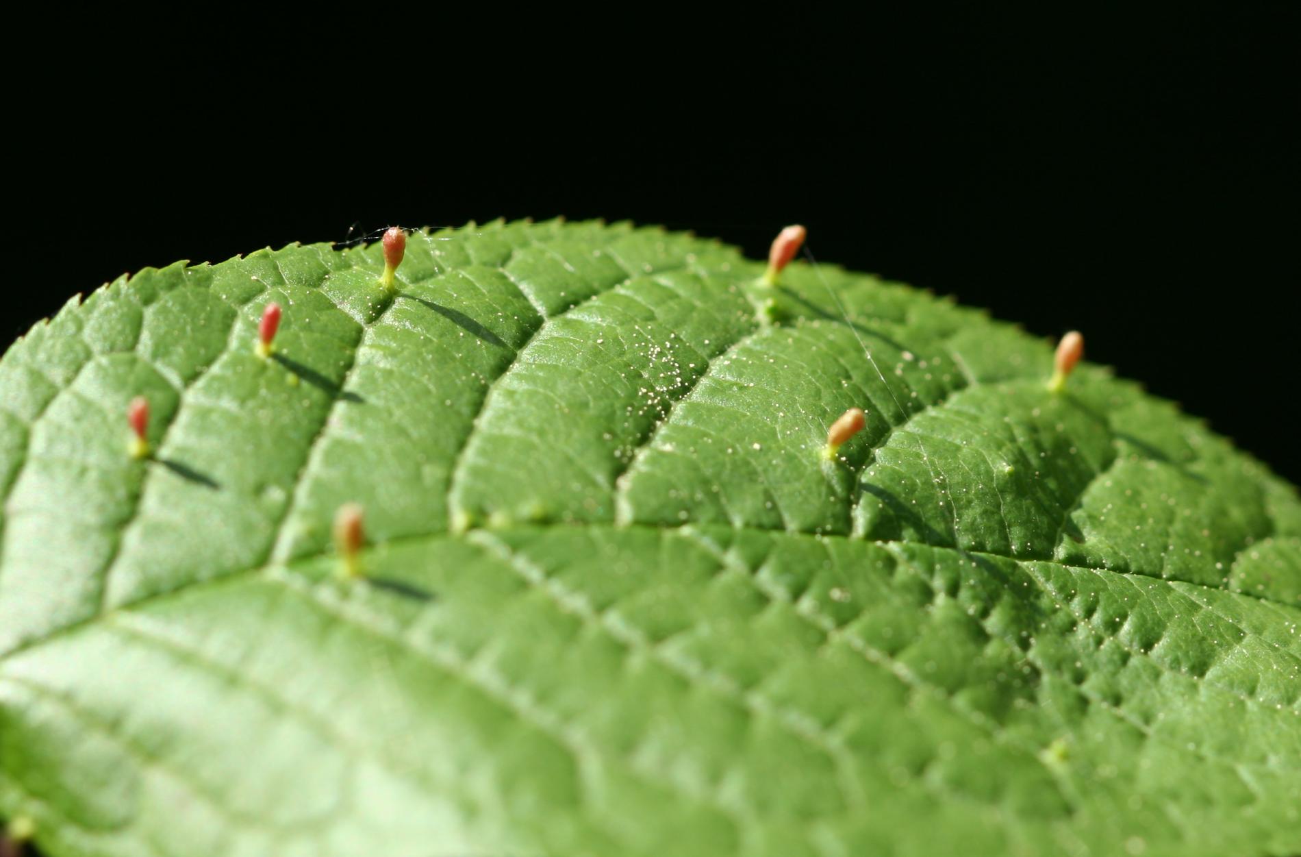 Tiny galls on the upper side of the leaf. They can be spherical, elliptical to elongated, green, yellow, pink or red.