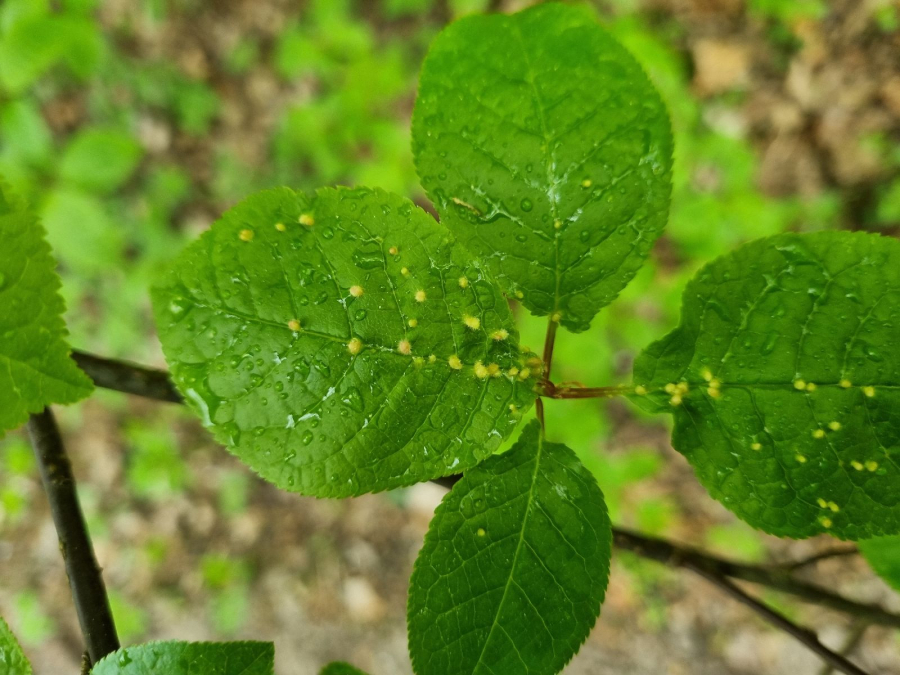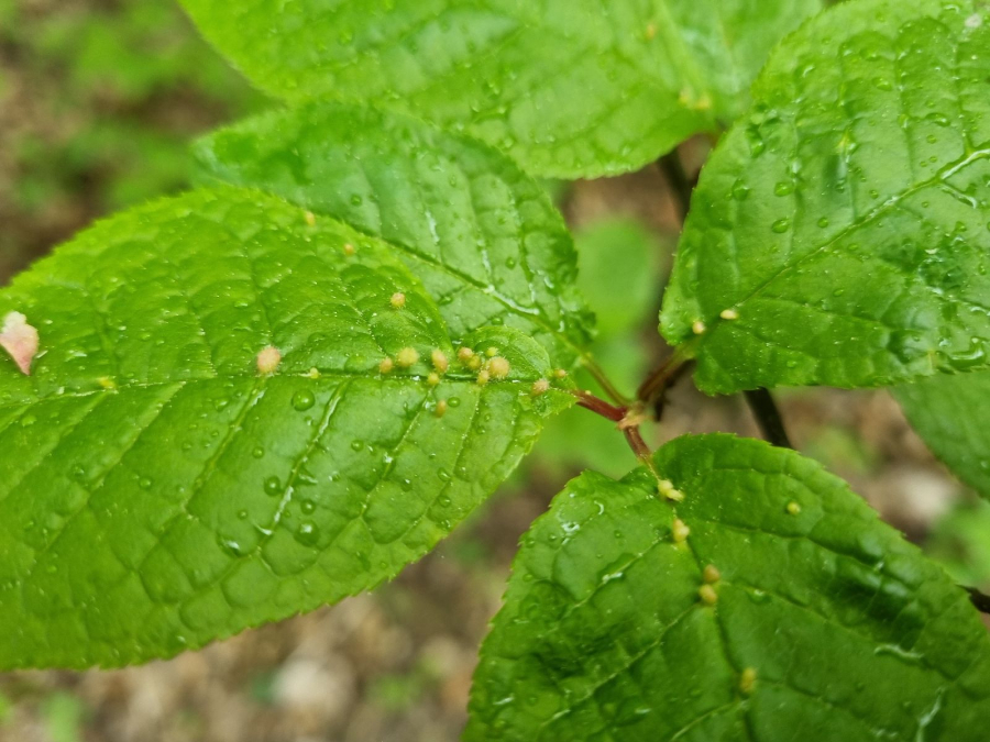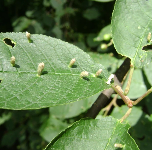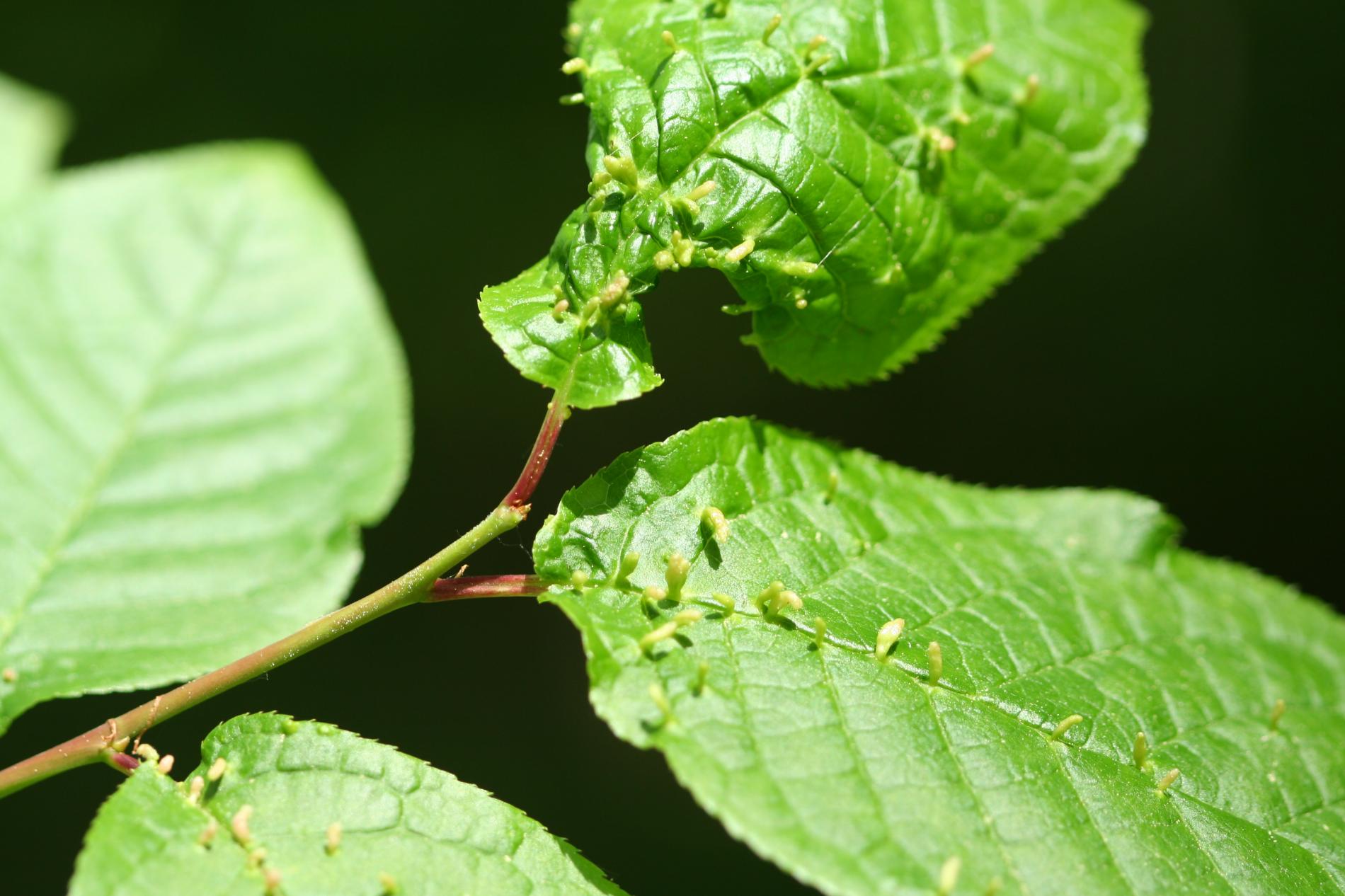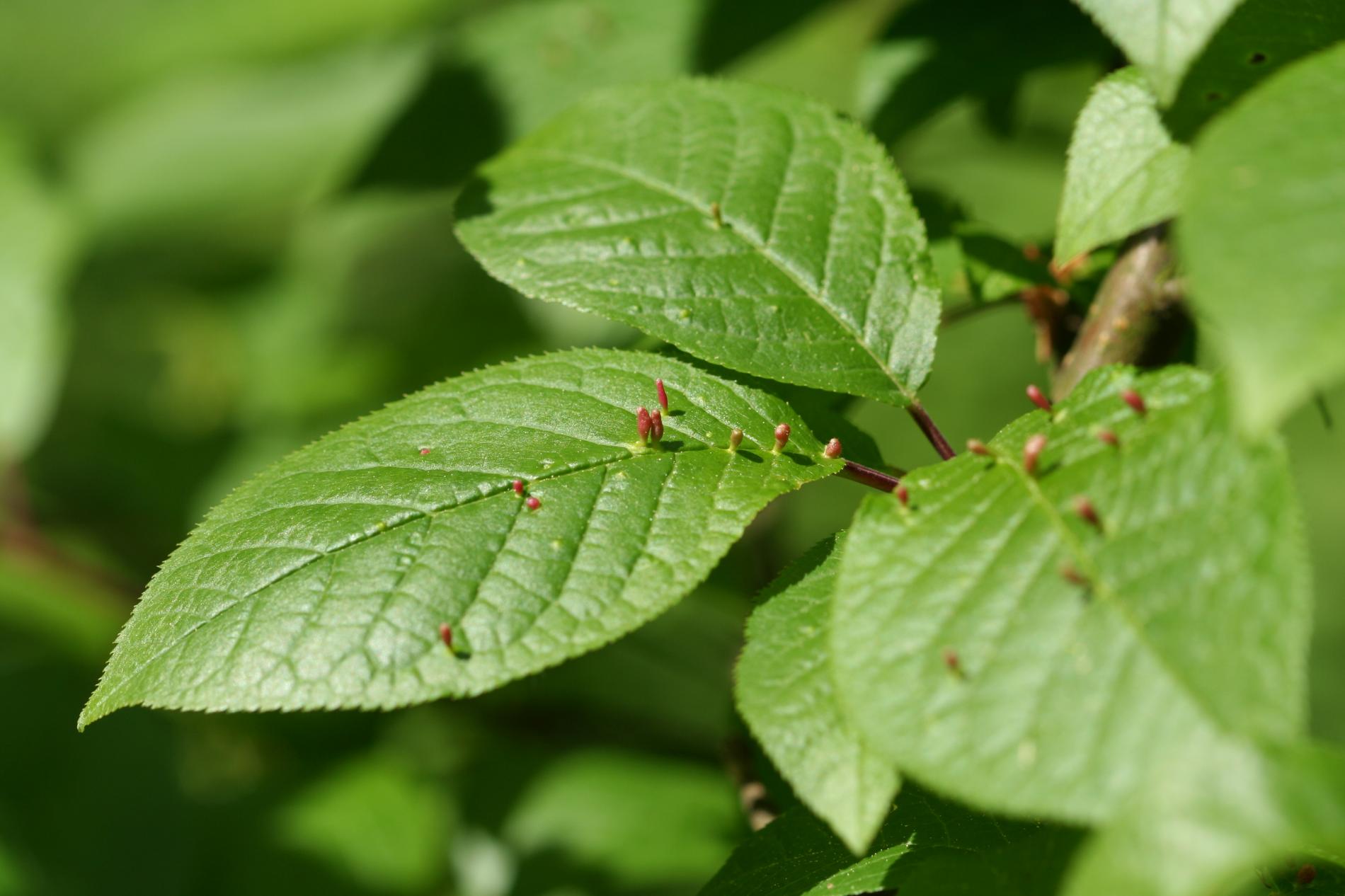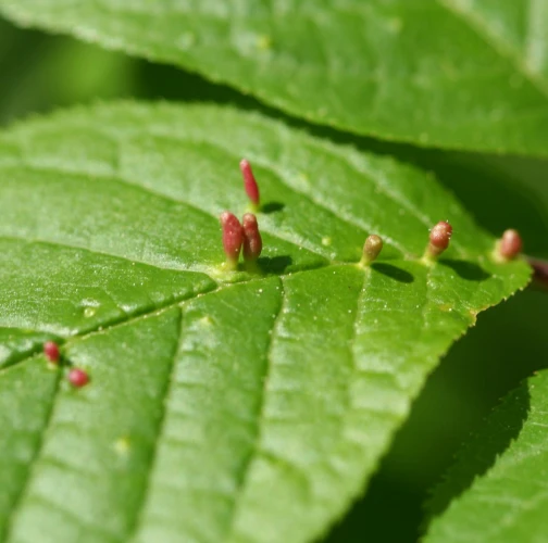 Tiny galls on the upper side of the leaf. They can be spherical, elliptical to elongated, green, yellow, pink or red.
