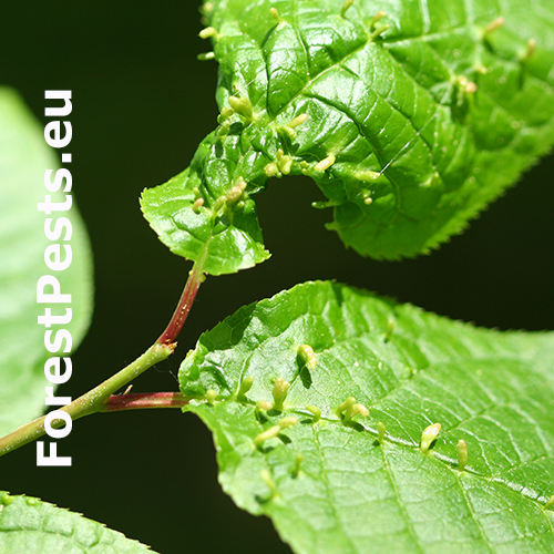 Pubescent knob-like galls, 1–2 mm high, found on the upper side of the leaf. Shape and colour vary. They can be spherical, elliptical to elongated elliptical, green, yellow, pink or red. Multiple galls occurring on the same leaf frequently cause deformation. Wide spread in Europe, but more frequent in southern parts. The main host is bird cherry (Prunus padus - Padus avium).