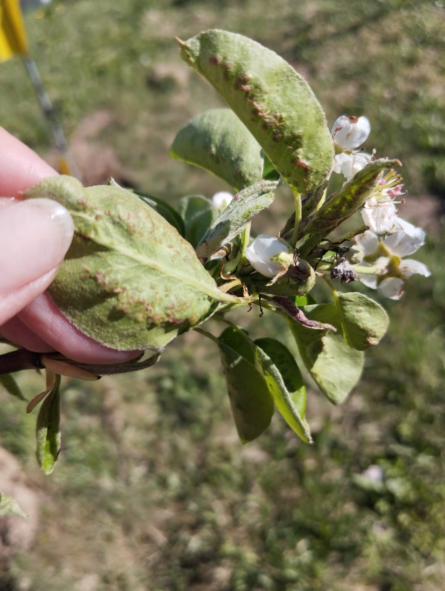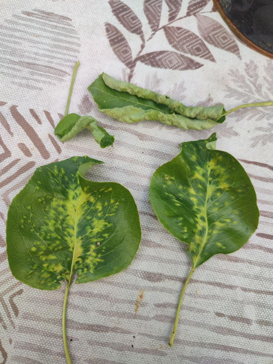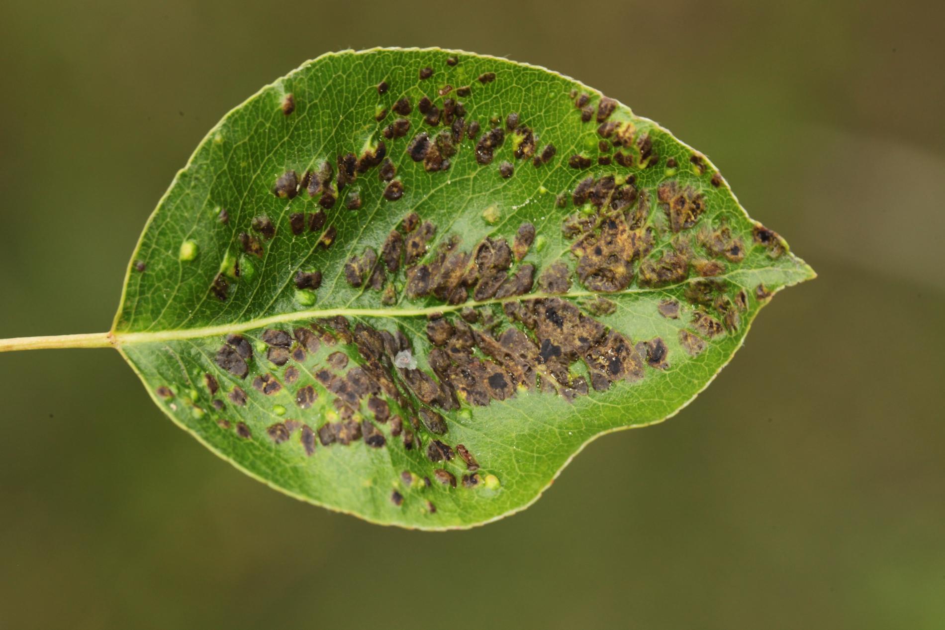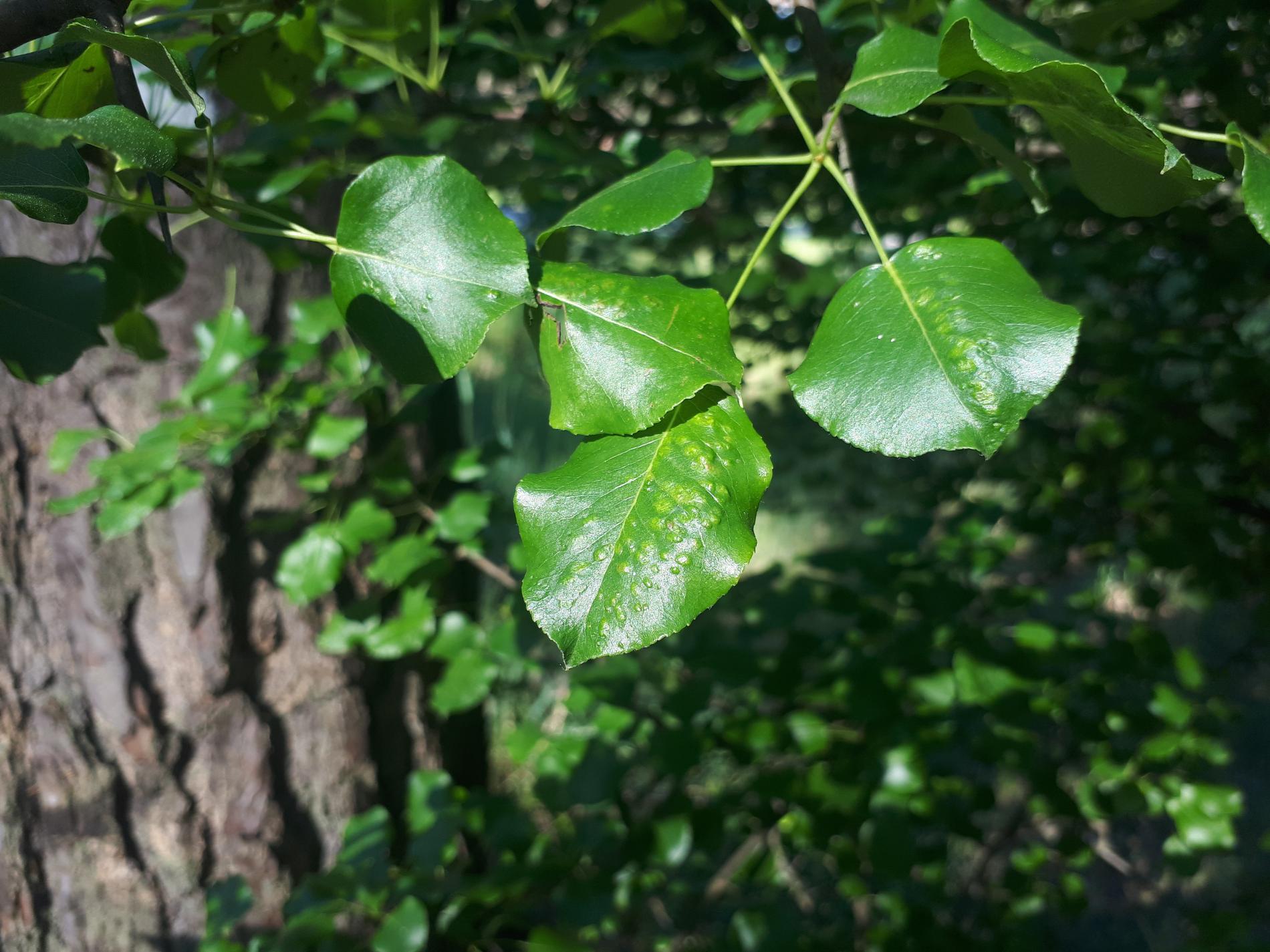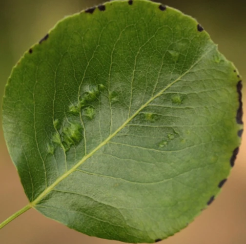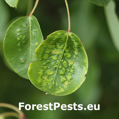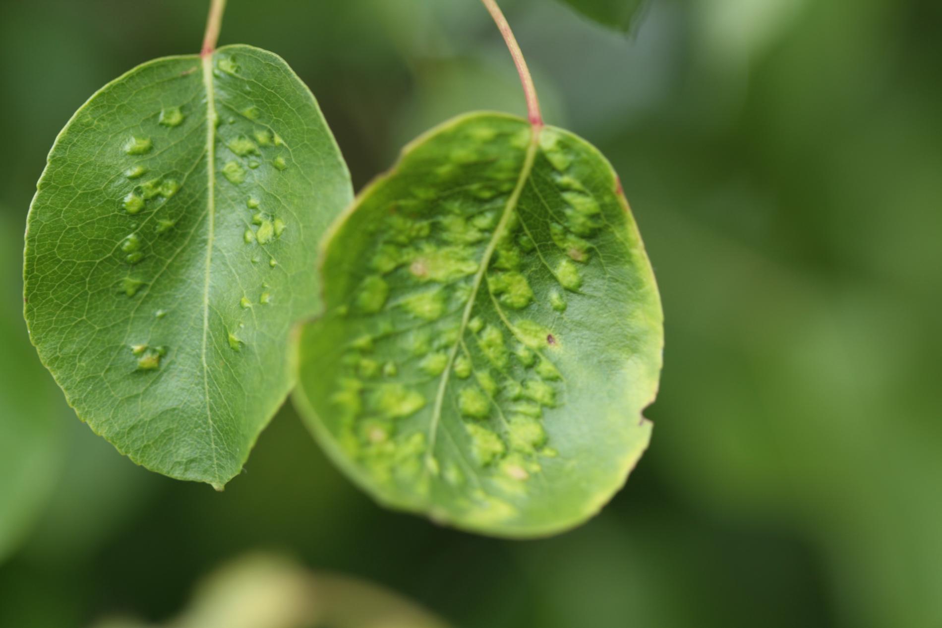 Deformations of pear leaves (pear leaf blisters) are caused by the pear leaf blister mite (Eriophyes piri). Early in spring, shortly after pear buds open, light spots can be seen on the upper surface of the leaves, and thickened areas on the lower surface. These spots later turn black during the summer. Often, all leaves on the tree are affected. More severely affected leaves do not fall off but remain on the trees until autumn. When multiple leaves are affected, the growth of the shoots is often slowed down. This species does not attack fruits. However, severe infestations can indirectly affect fruit quality and yield by impacting the overall health and vigor of the tree. Lower branches of older trees are usually the most affected. The pest is a yellowish-white mite, about 0.2 mm long, which is not visible to the naked eye. It mainly occurs on older pear trees, but occasionally it is found on young trees in fruit nurseries. The pear leaf blister mite overwinters in buds or in bark crevices. Chemical treatment of affected pear trees is usually not necessary. Typically, removing affected leaves from the trees is sufficient. In cases of severe infestation, it is necessary to treat the trees with an appropriate miticide.