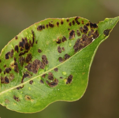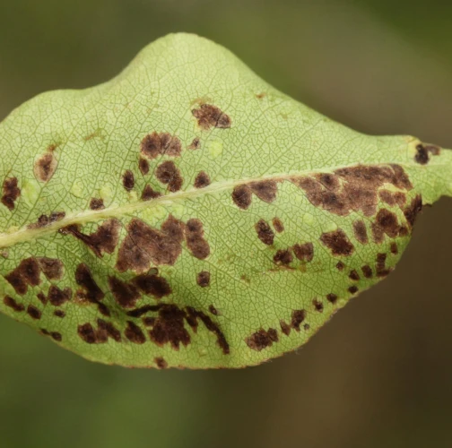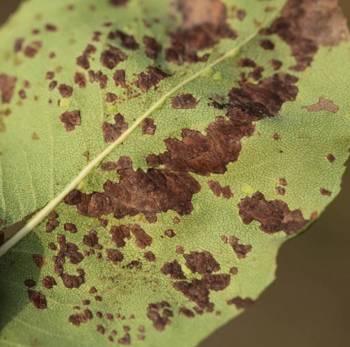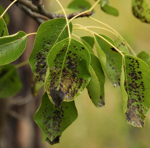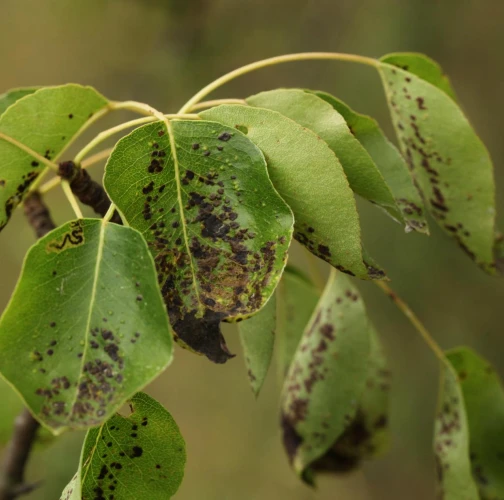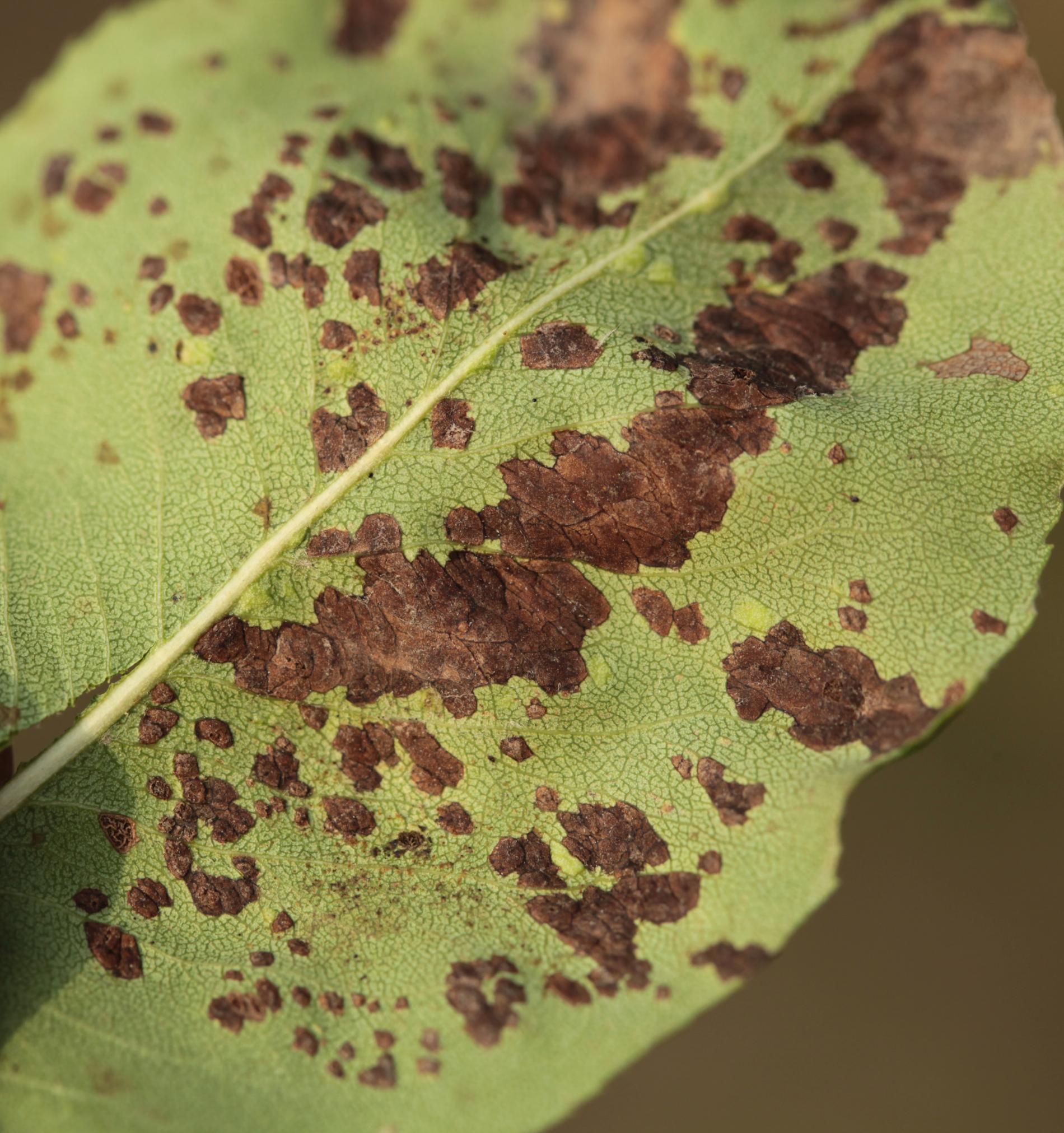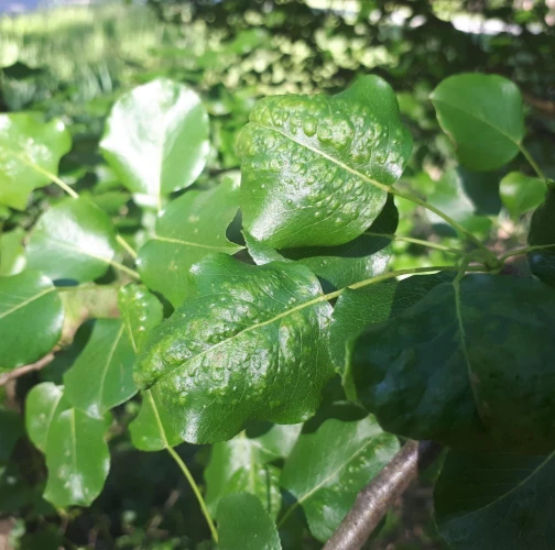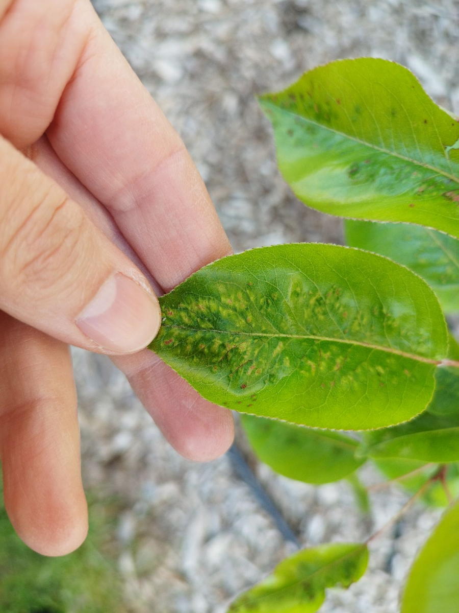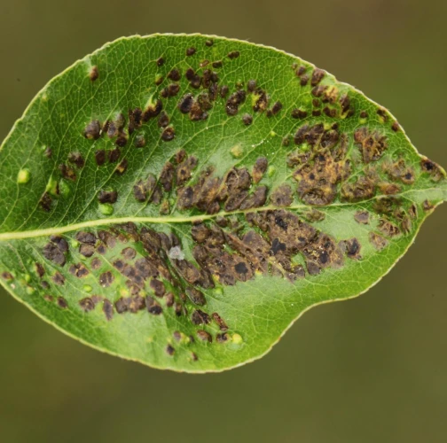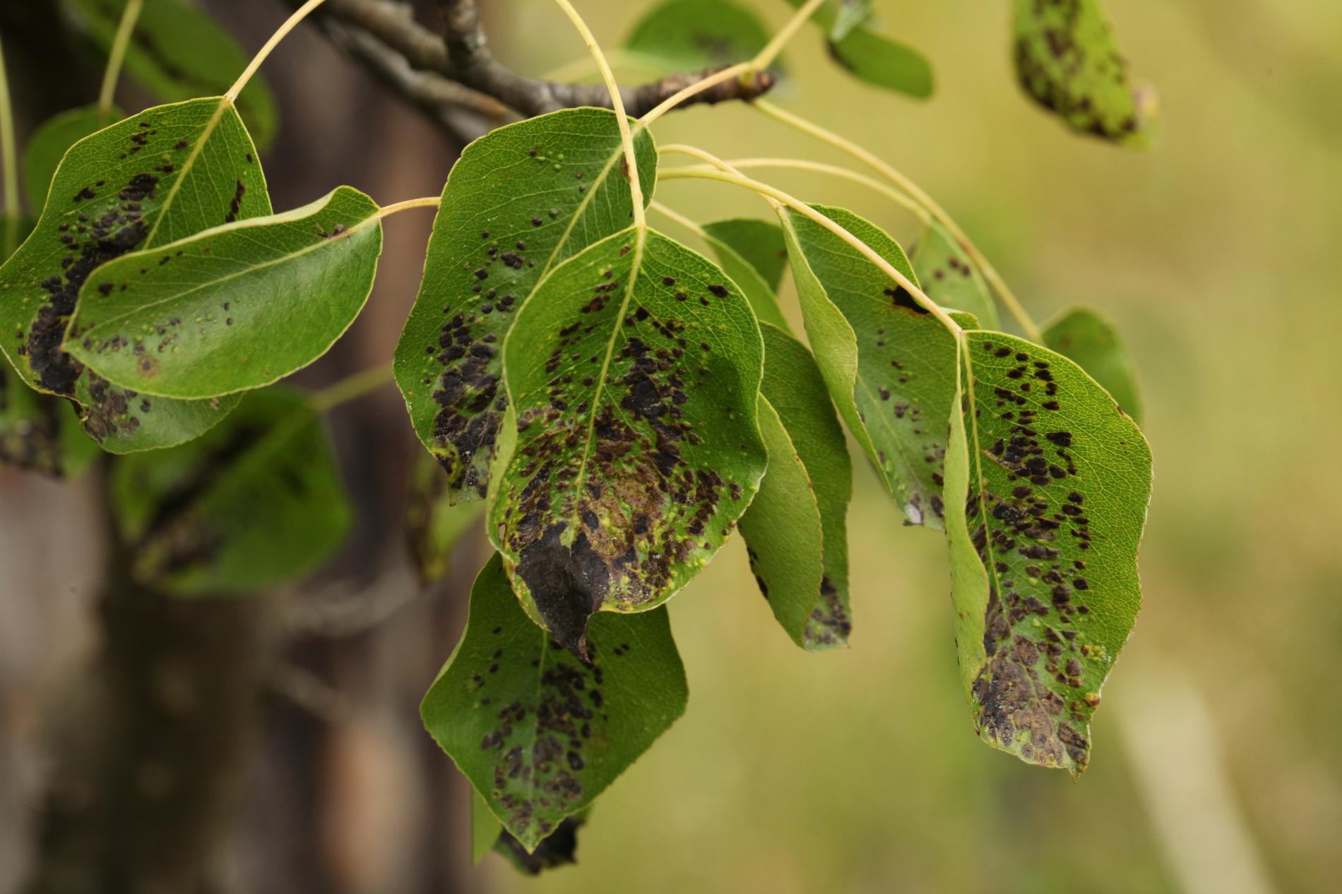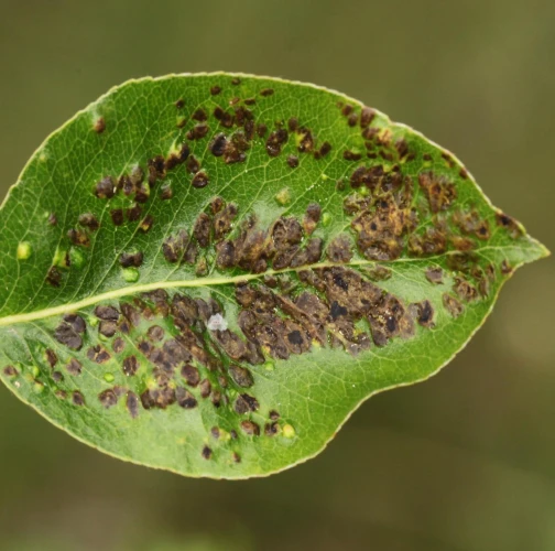 Deformations of pear leaves (pear leaf blisters) are caused by the pear leaf blister mite (Eriophyes piri). Early in spring, shortly after pear buds open, light spots can be seen on the upper surface of the leaves, and thickened areas on the lower surface. These spots later turn black during the summer. Often, all leaves on the tree are affected. More severely affected leaves do not fall off but remain on the trees until autumn. When multiple leaves are affected, the growth of the shoots is often slowed down. This species does not attack fruits. However, severe infestations can indirectly affect fruit quality and yield by impacting the overall health and vigor of the tree. Lower branches of older trees are usually the most affected. The pest is a yellowish-white mite, about 0.2 mm long, which is not visible to the naked eye. It mainly occurs on older pear trees, but occasionally it is found on young trees in fruit nurseries. The pear leaf blister mite overwinters in buds or in bark crevices. Chemical treatment of affected pear trees is usually not necessary. Typically, removing affected leaves from the trees is sufficient. In cases of severe infestation, it is necessary to treat the trees with an appropriate miticide.