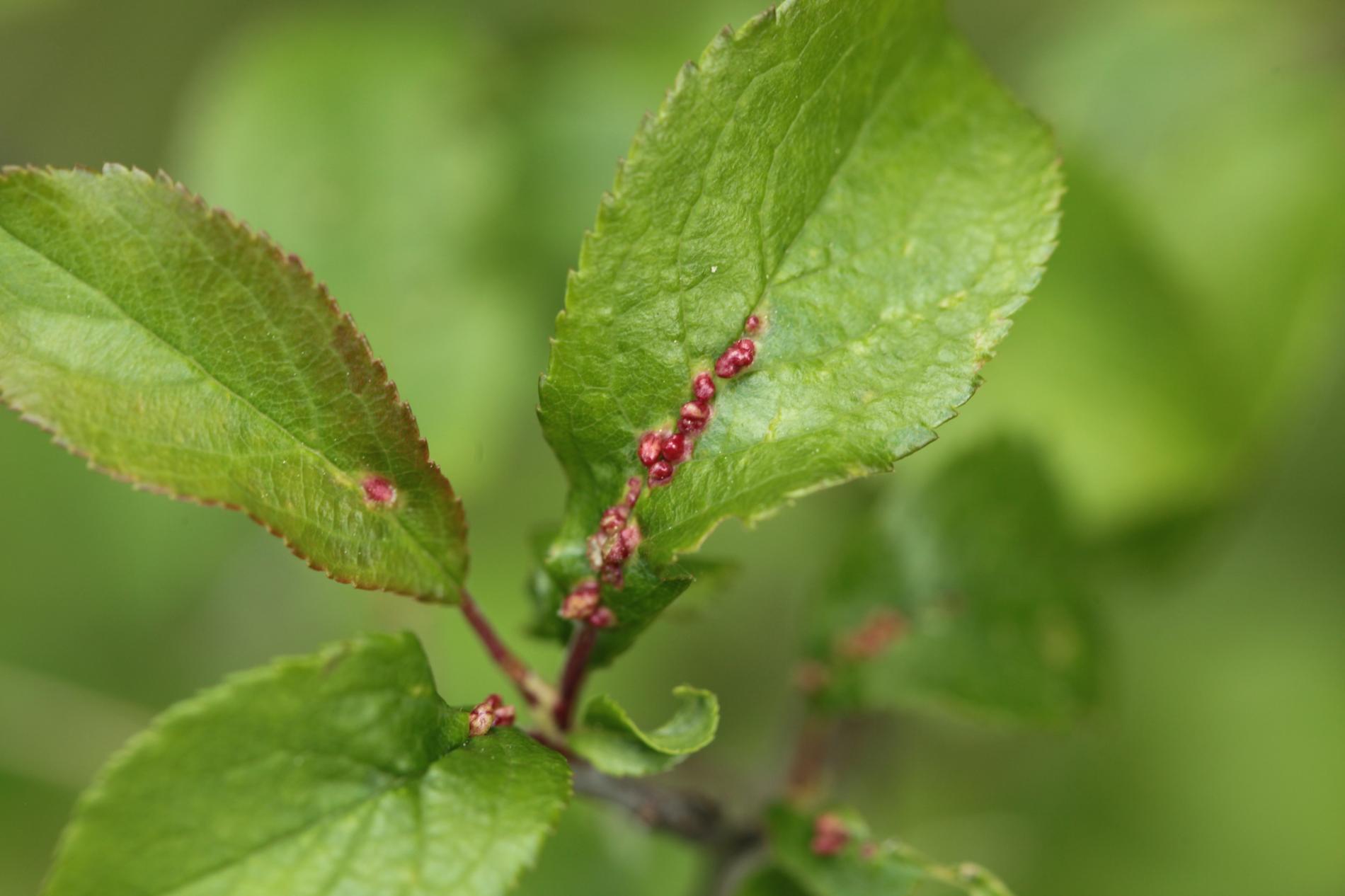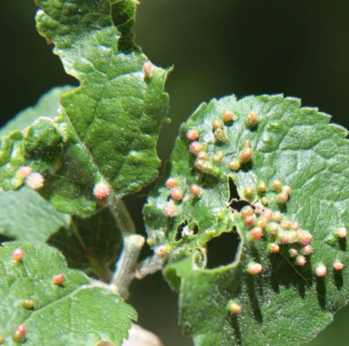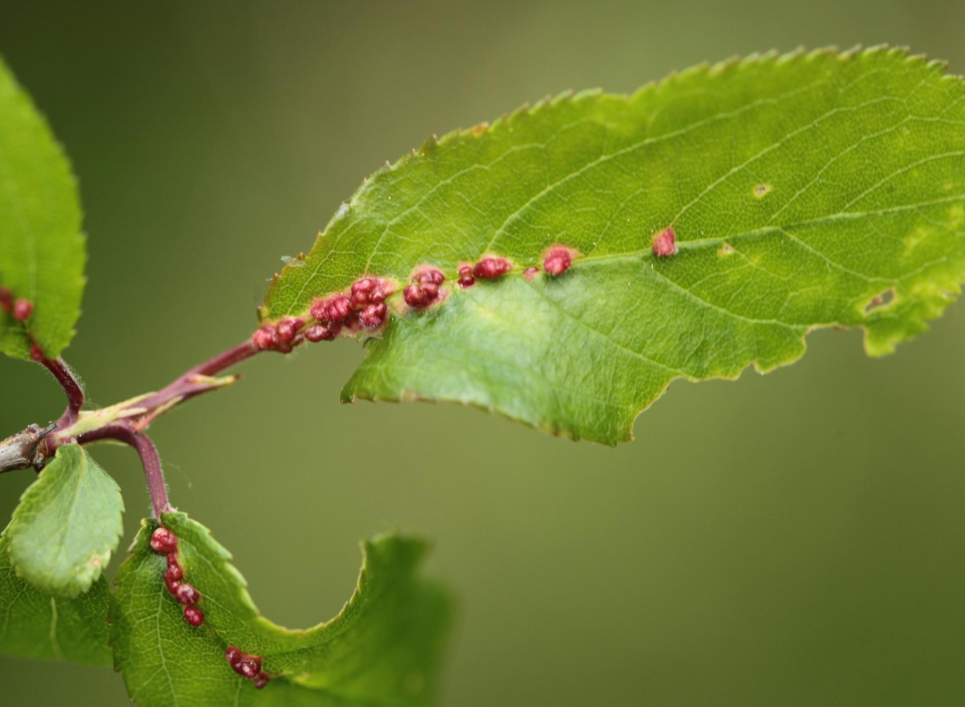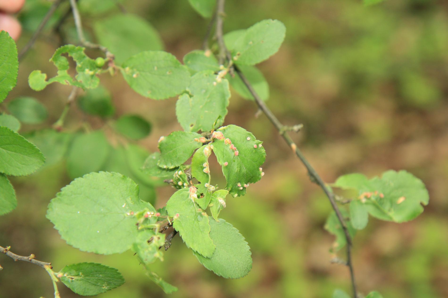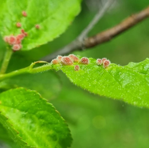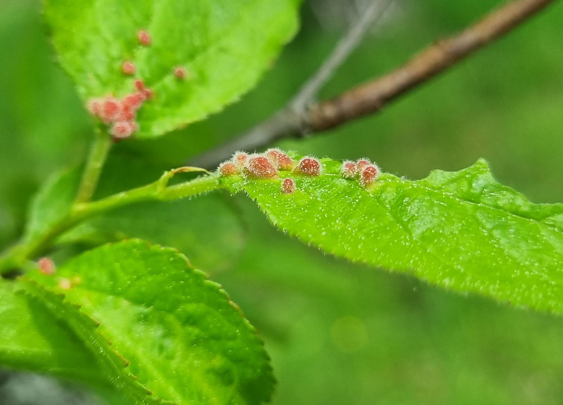 Common on blackthorn, round or elongated pouchlike galls are usually light-pink and hairy and have an opening on the upper surface of the leaf. They are more common on leaf edges and result in leaf deformation. They are created in the second half of summer as a result of mite presence.