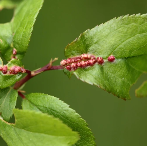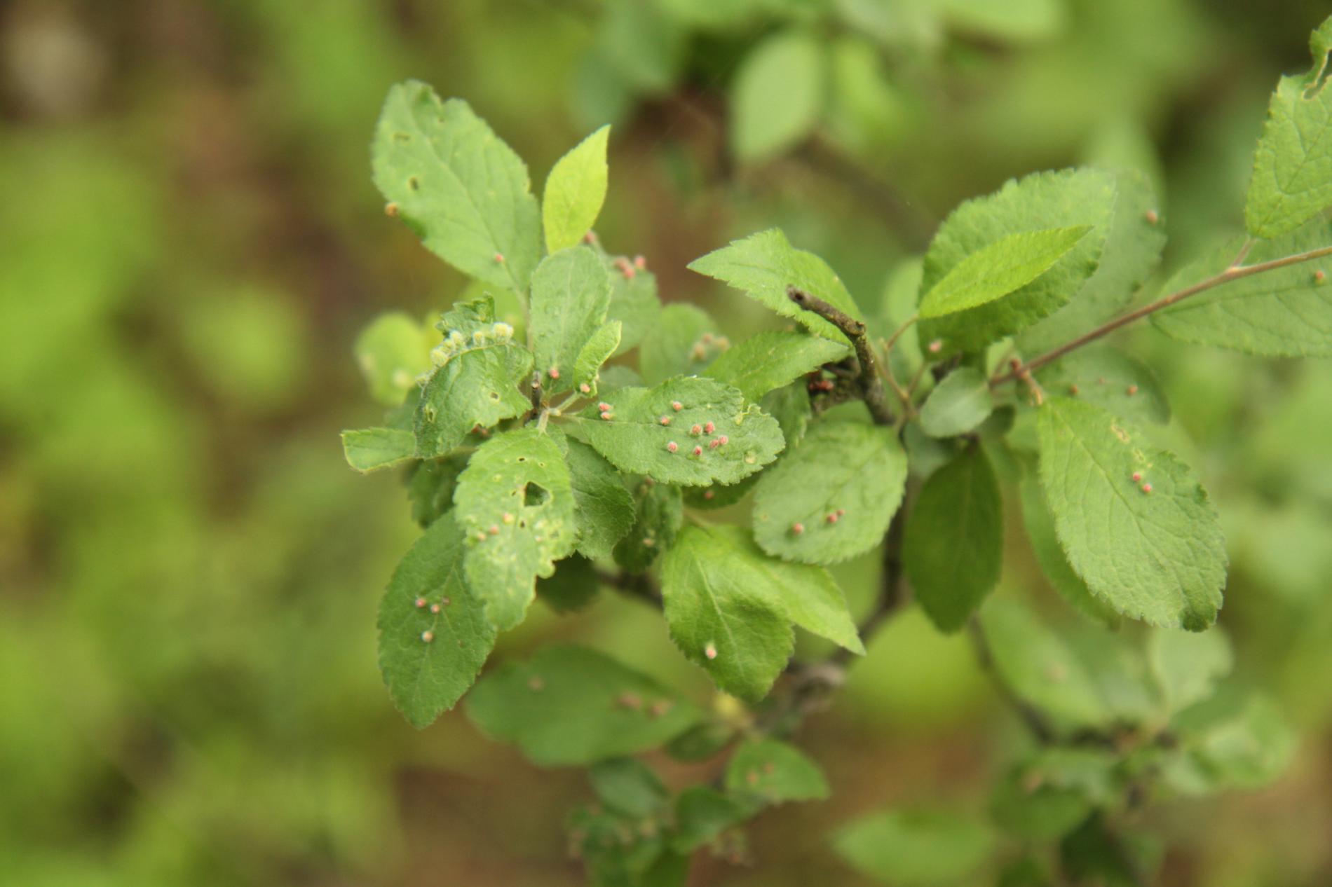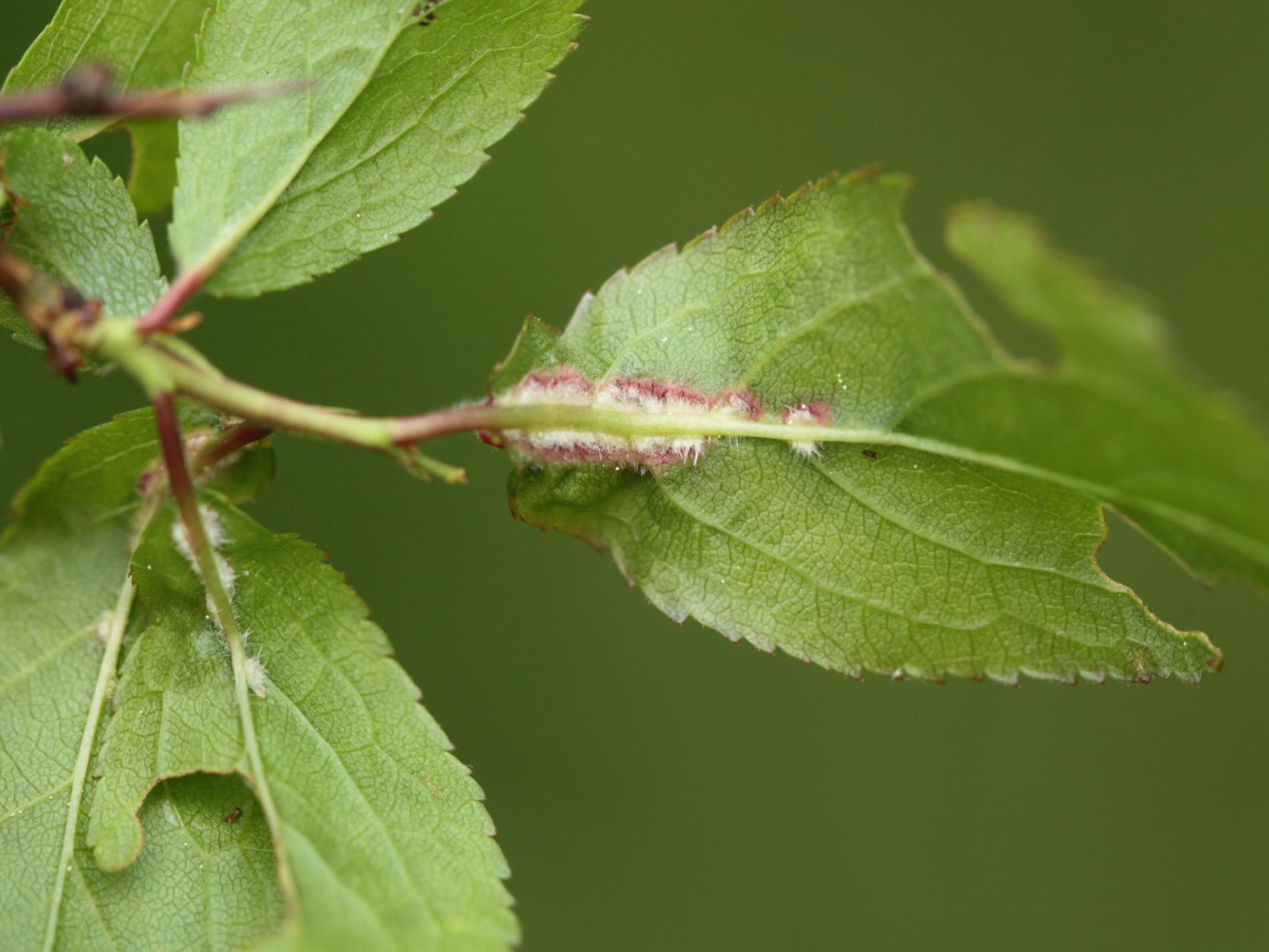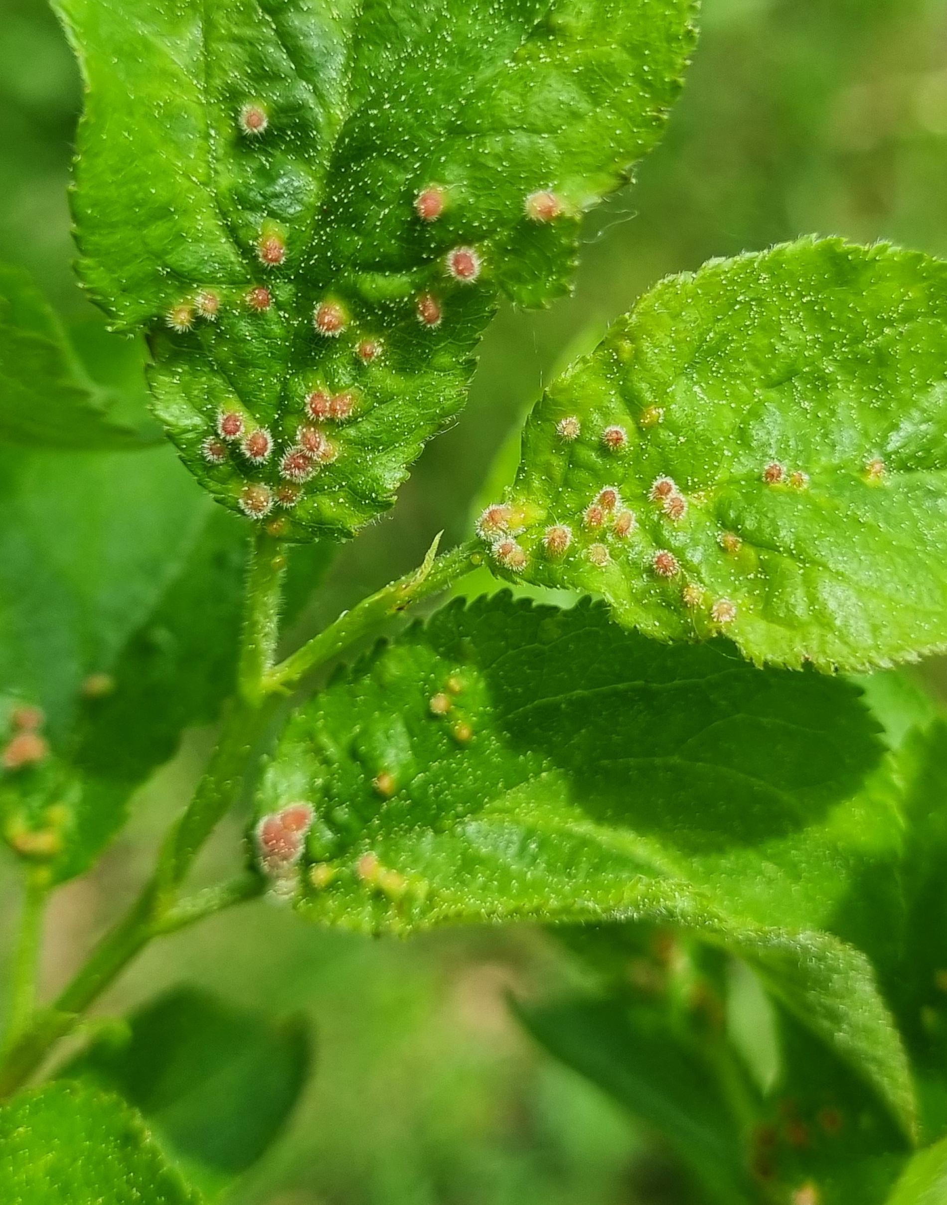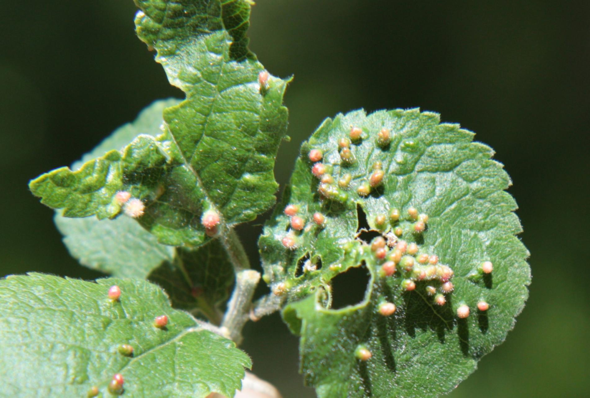 Common on blackthorn, round or elongated pouchlike galls are usually light-pink and hairy and have an opening on the upper surface of the leaf. They are more common on leaf edges and result in leaf deformation. They are created in the second half of summer as a result of mite presence.