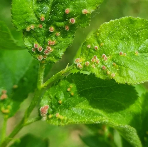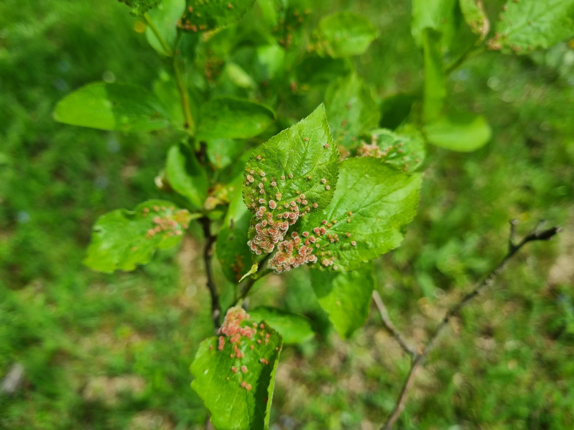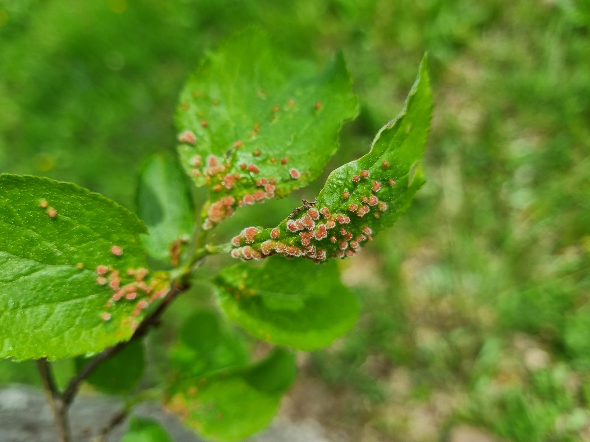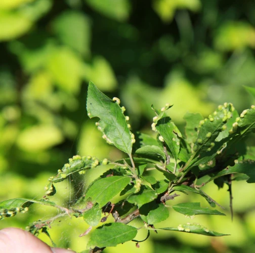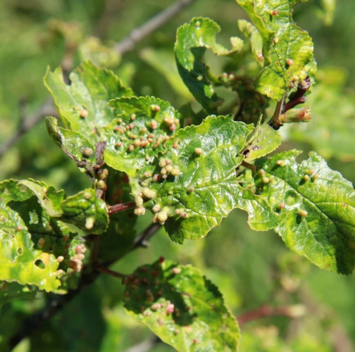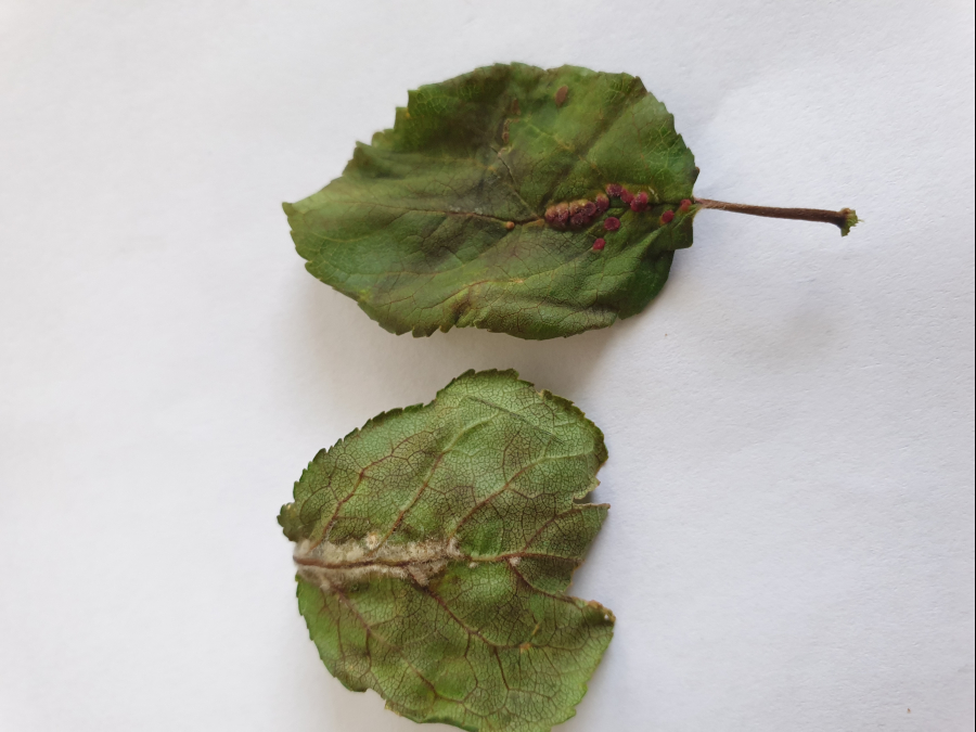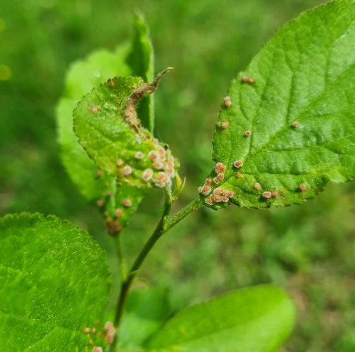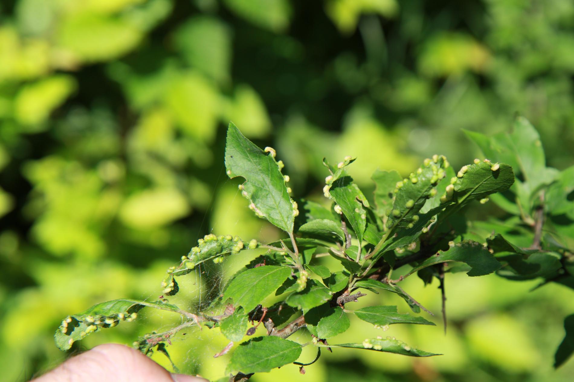 Common on blackthorn, round or elongated pouchlike galls are usually light-pink and hairy and have an opening on the upper surface of the leaf. They are more common on leaf edges and result in leaf deformation. They are created in the second half of summer as a result of mite presence.
