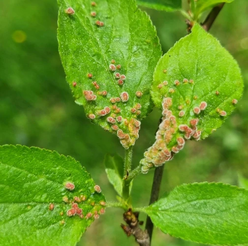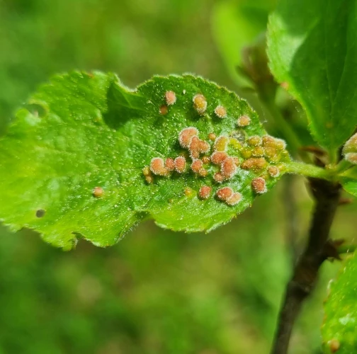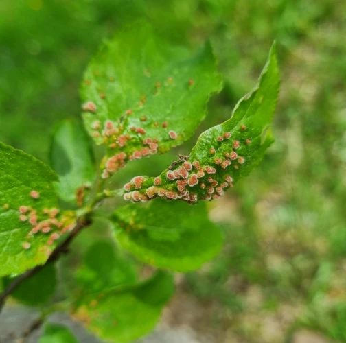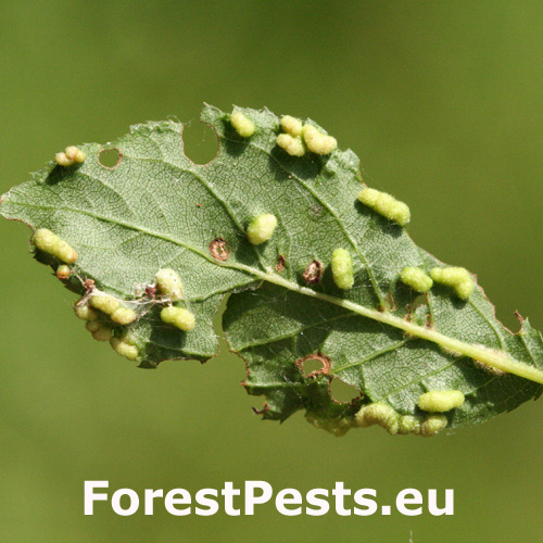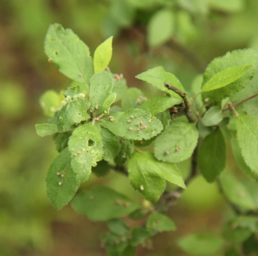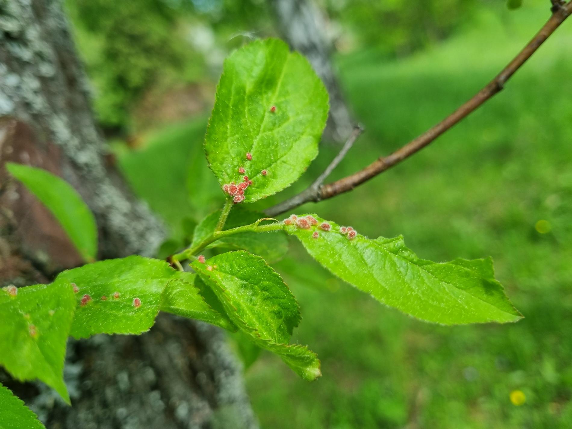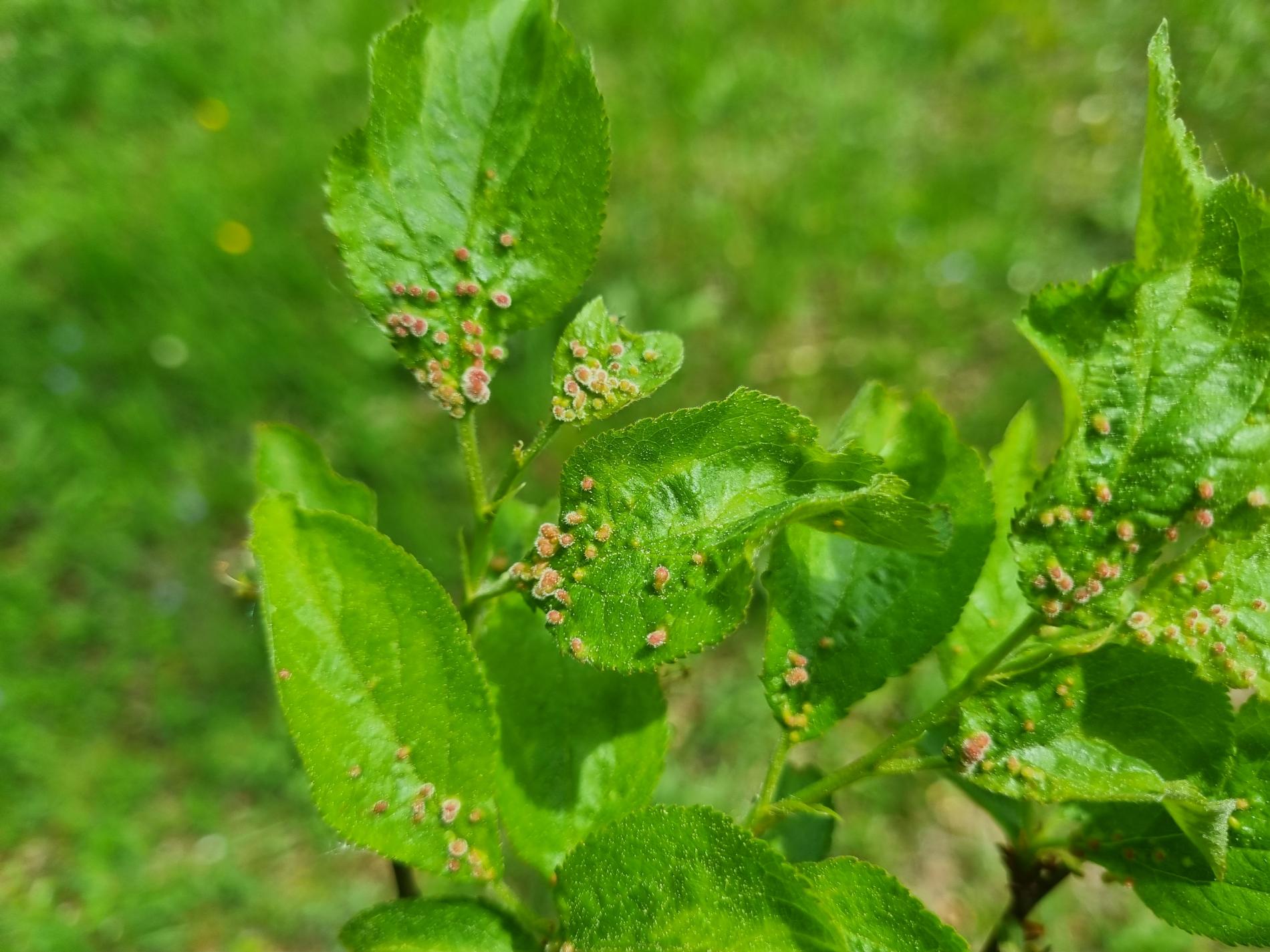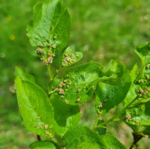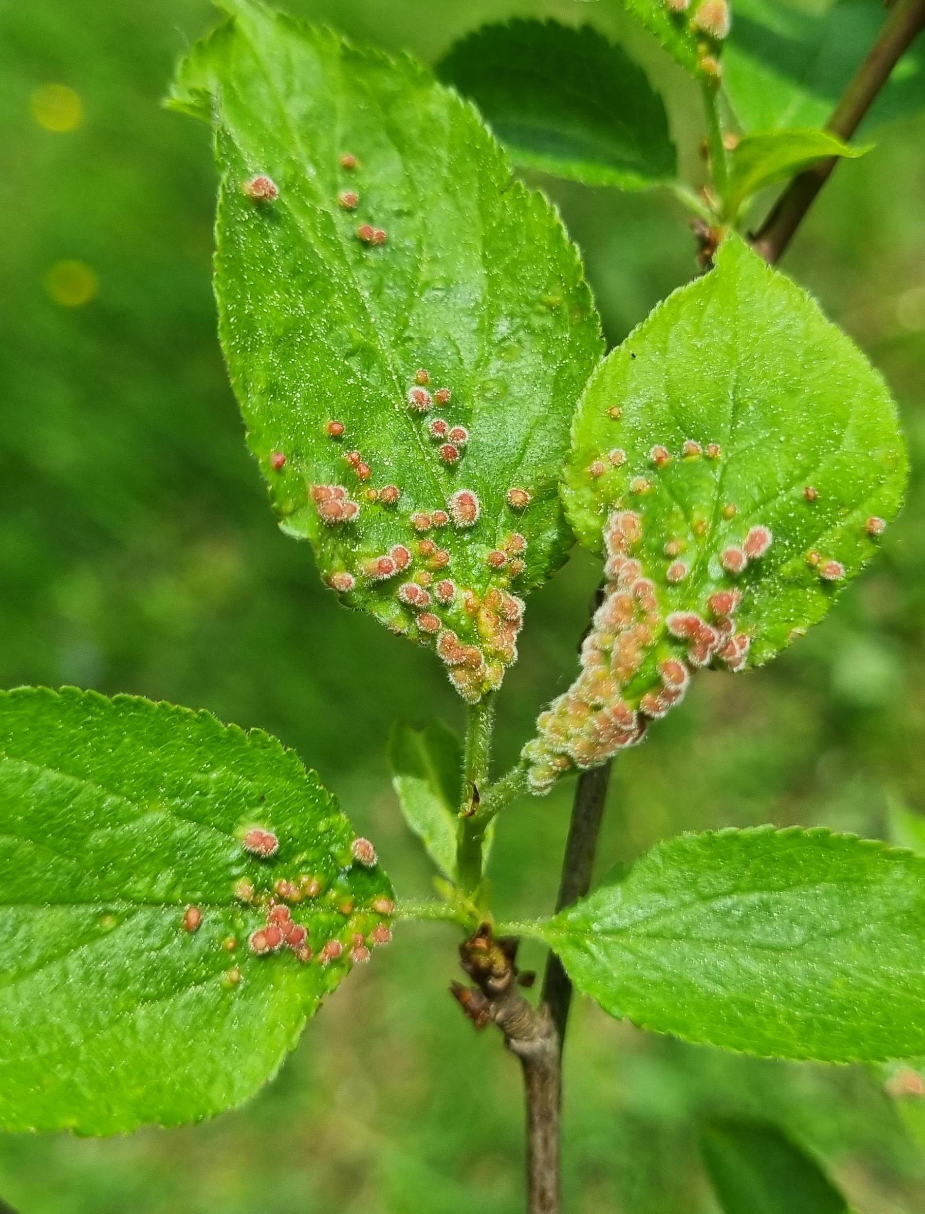 Common on blackthorn, round or elongated pouchlike galls are usually light-pink and hairy and have an opening on the upper surface of the leaf. They are more common on leaf edges and result in leaf deformation. They are created in the second half of summer as a result of mite presence.