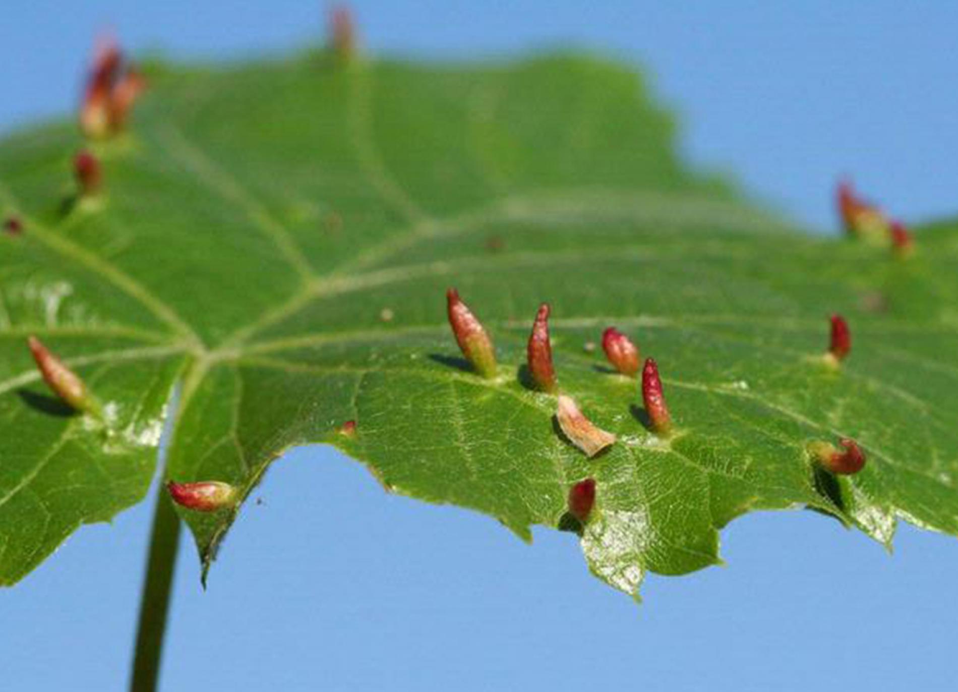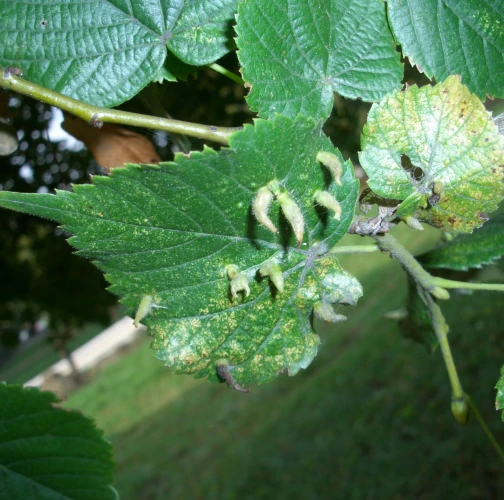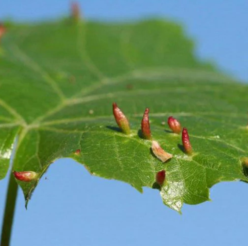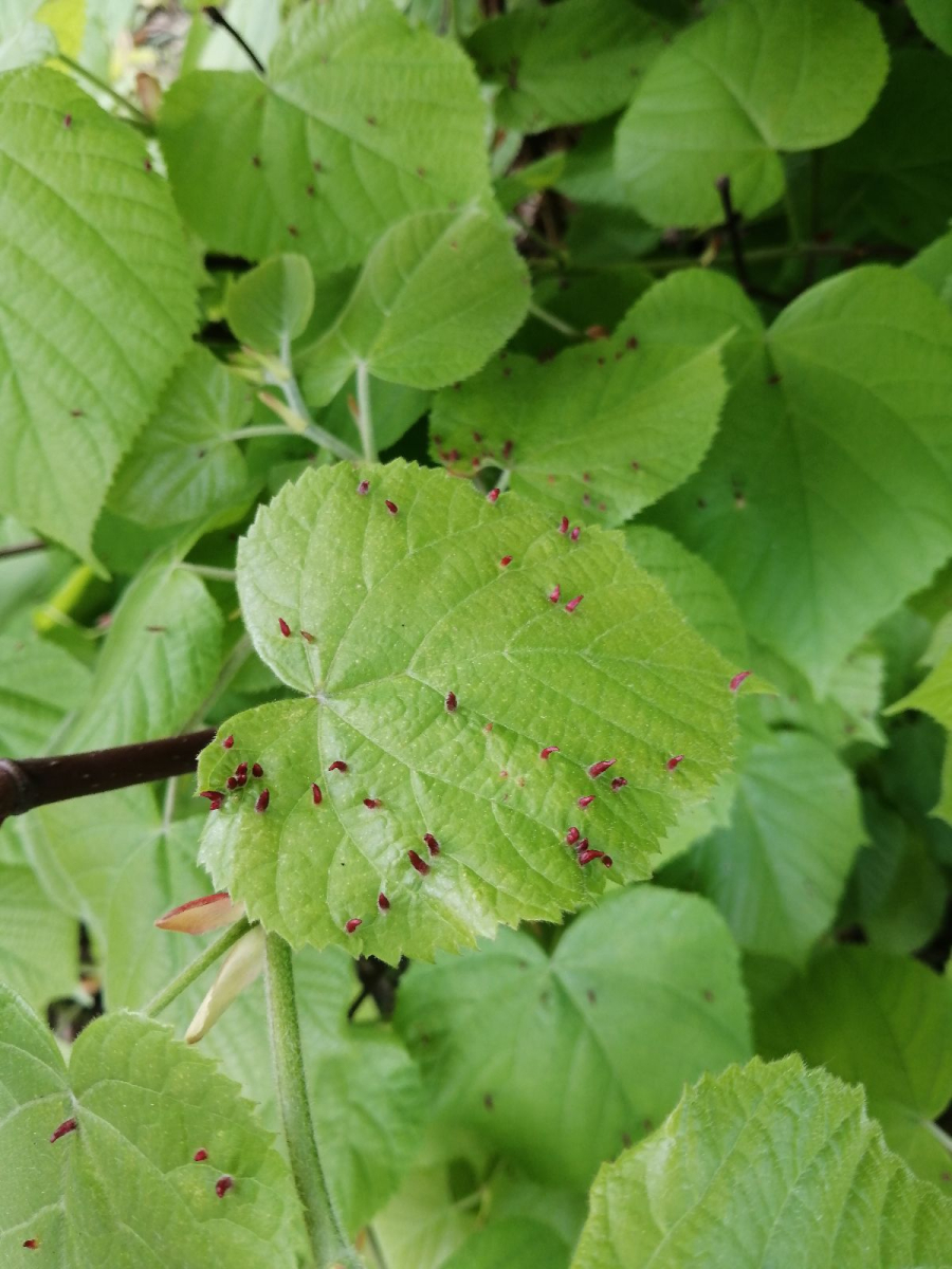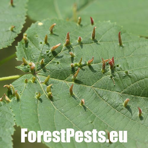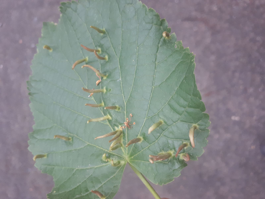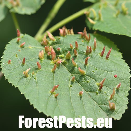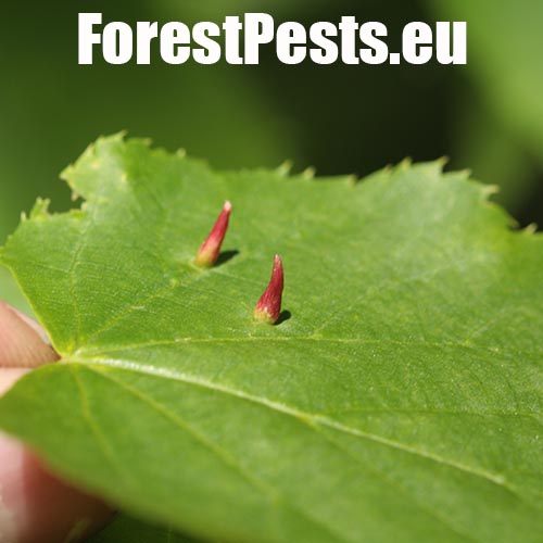 Eriophyes tiliae, commonly known as the gall mite, is a species of mite that infests trees in the Tilia genus. The mite feeds on the leaves of the tree, causing the formation of galls, which are abnormal growths that encase the mite and protect it from predators and environmental factors. Galls caused by Eriophyes tiliae are typically small, elyptical, and green or reddish in color. They may be found on the upper surface of the leaf. The life cycle of Eriophyes tiliae involves several stage. Sheaths are white, sometimes ocherous-brown. It is more abundant in lower parts of crowns where it is subjected to less direct sunlight.