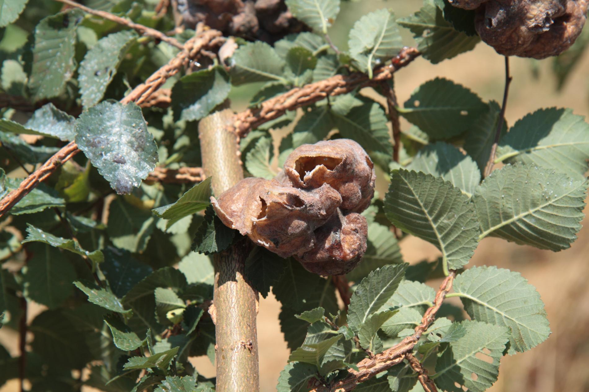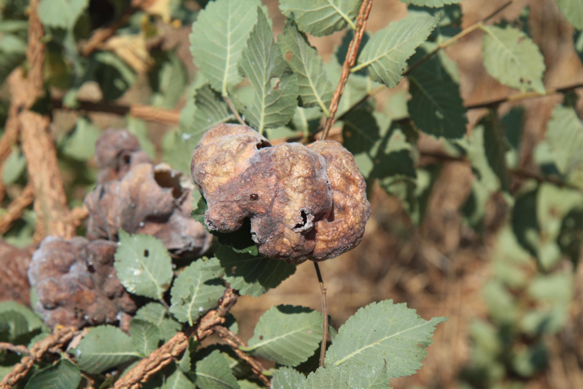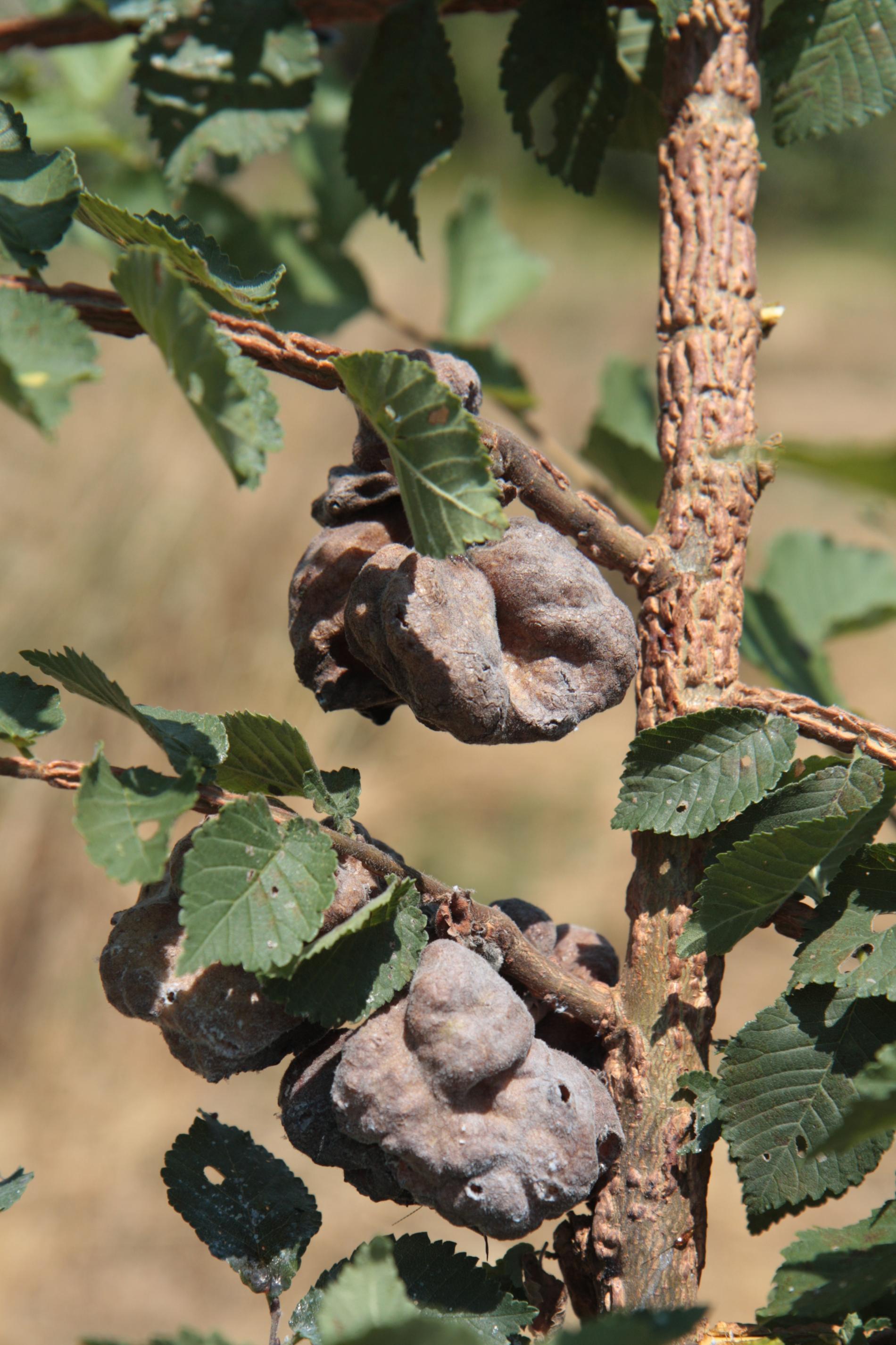 Large, bladder-like gall on leaves of elm. Often occurs several galls on one leaf. Colony of Aphids lives inside.