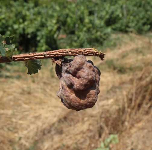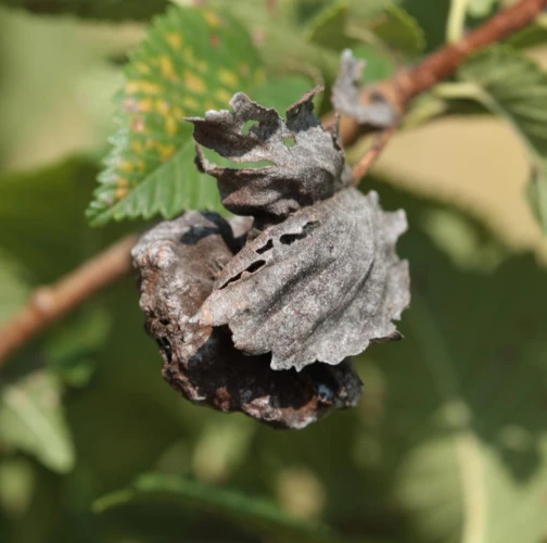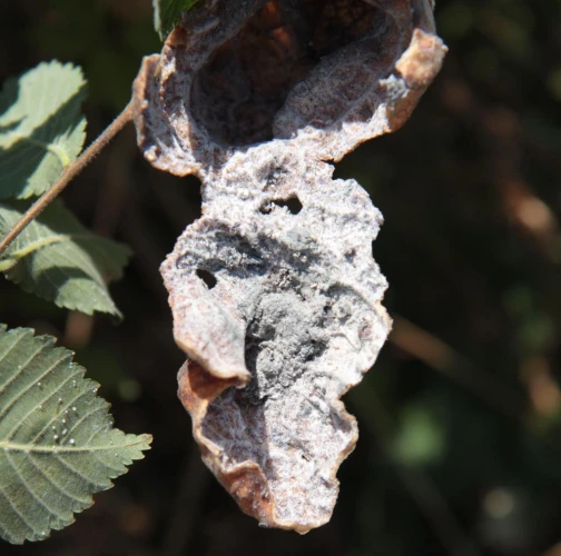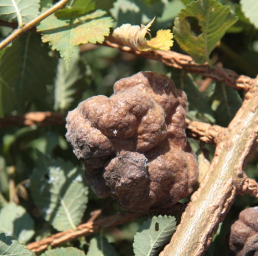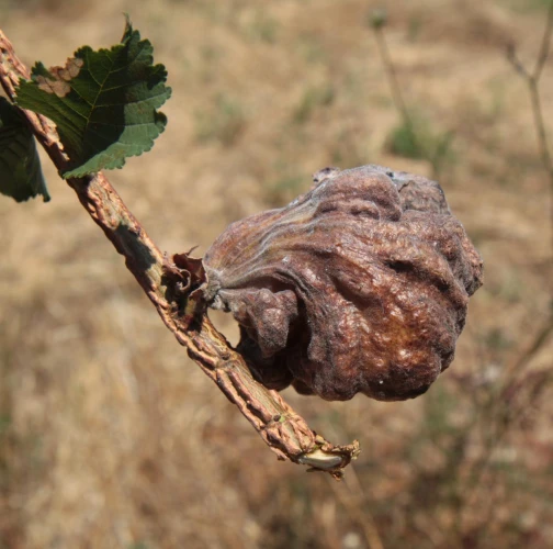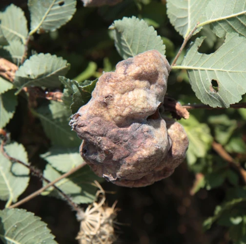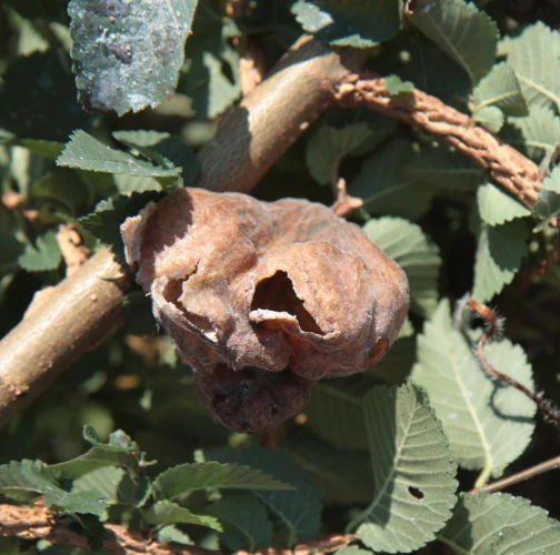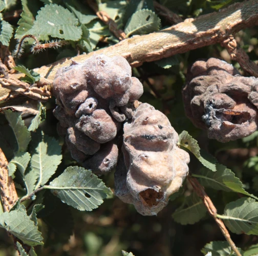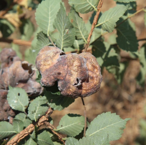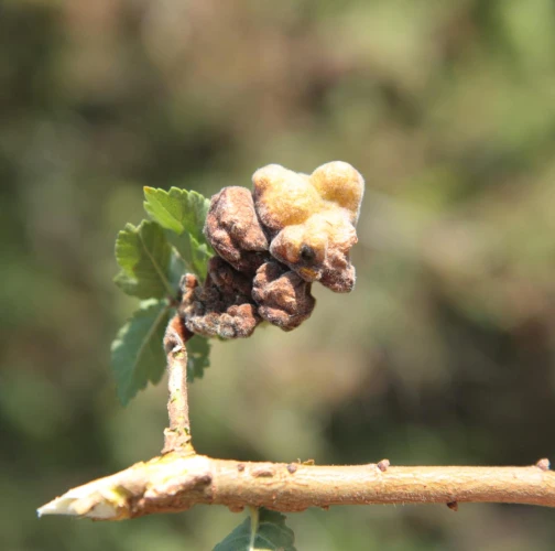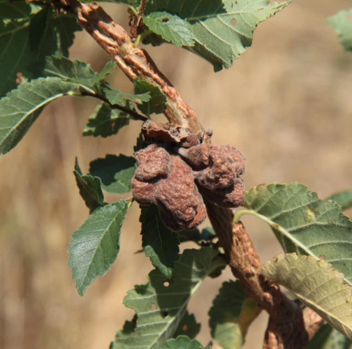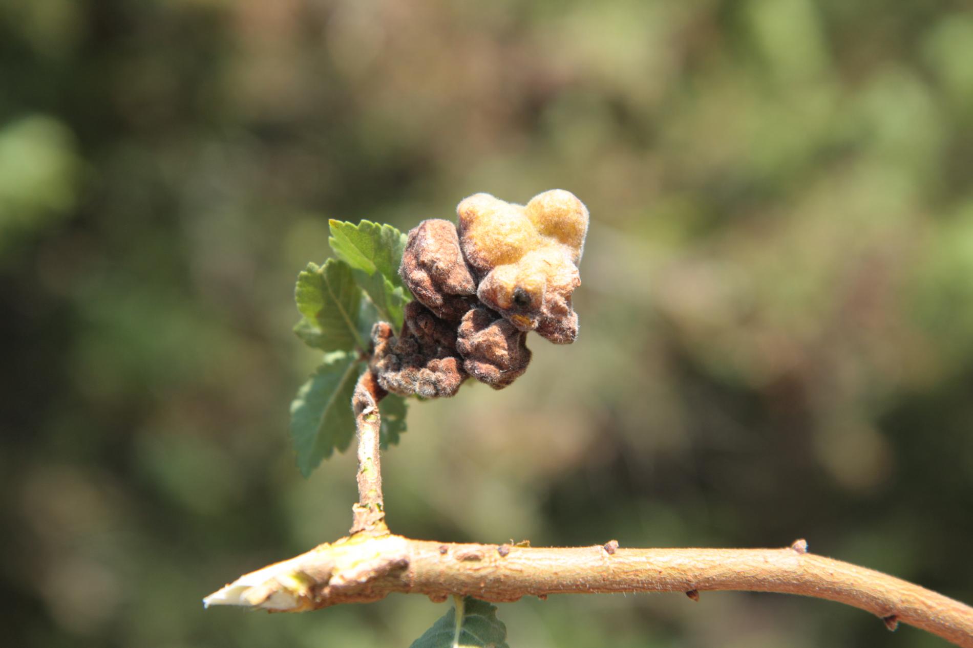 The gall produced by Eriosoma lanuginosum, commonly known as the elm balloon-gall aphid, is a protective structure that develops on elm leaves as a result of the aphid\'s feeding activities. The gall is formed by a combination of the tree\'s reaction to the aphid\'s feeding and the aphid\'s secretion of chemicals that induce gall formation. The gall is large, bladder like, sometimes reaching 4-5 cm in diameter and is typically round or oval-shaped. The gall tissue is light green at first and covered with fine white hairs, but becomes brown and hard as the gall matures. Eriosoma lanuginosum can be found on various elm species.