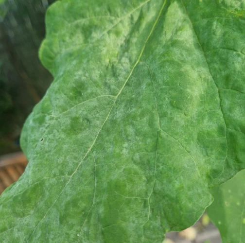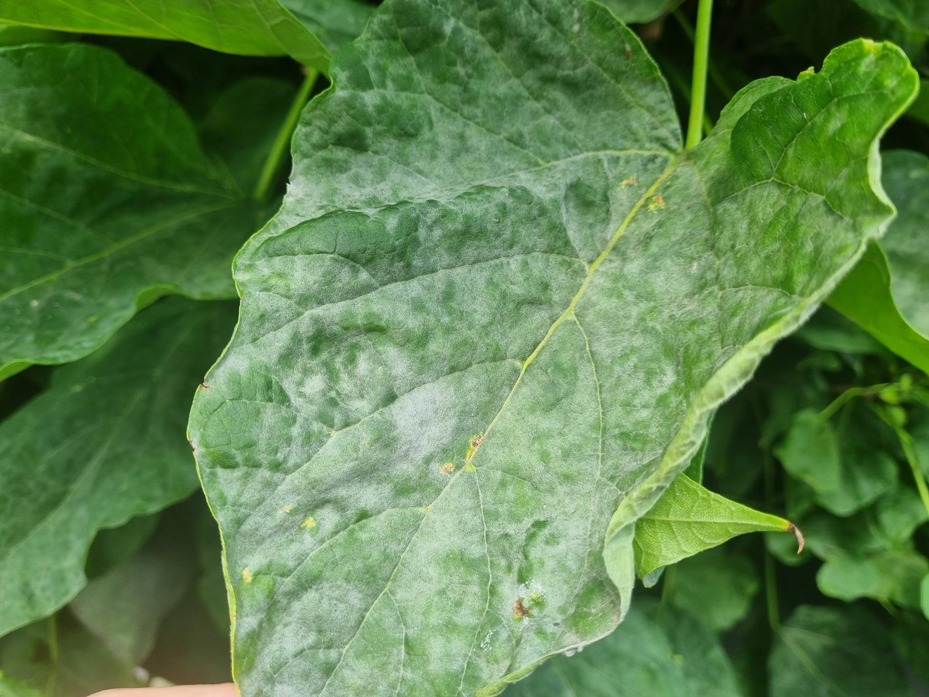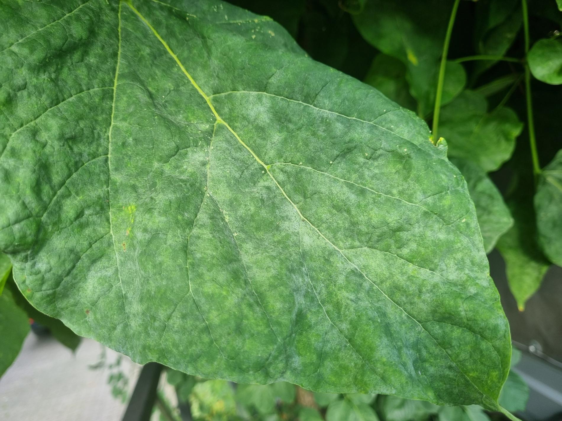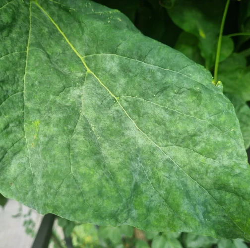White, powdery fungal growth on leaves, stems, and sometimes flowers. Premature leaf drop, leaf yellowing, and reduced plant vigor.