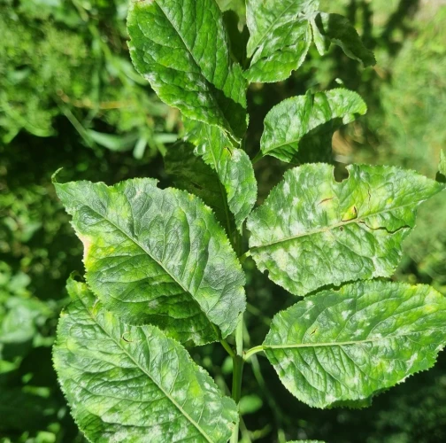 This disease is characterized by white, powdery fungal growth on the surfaces of leaves, stems, and sometimes flowers, leading to distorted growth, leaf curling, and reduced plant vigor.