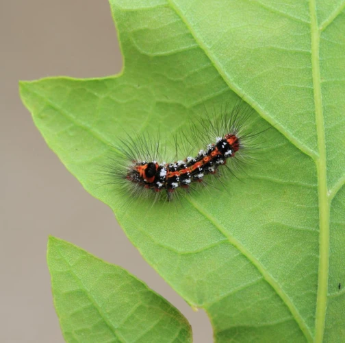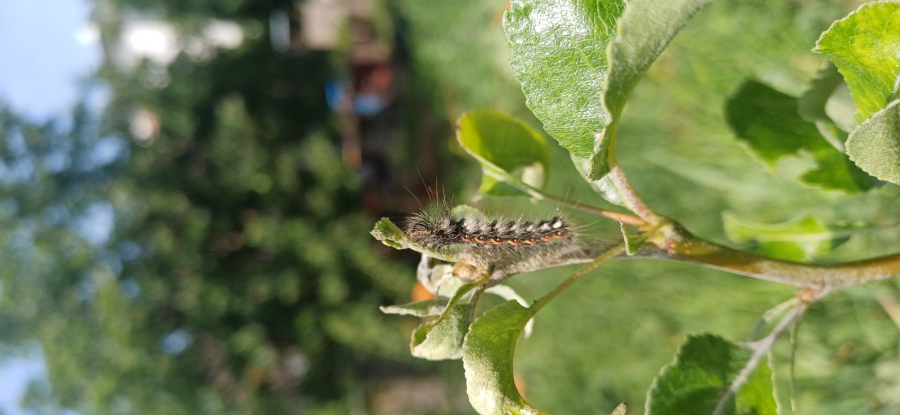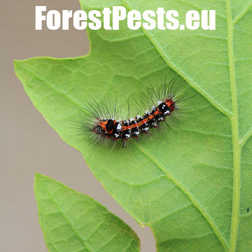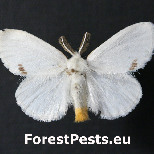 Adults are all white, except for a bold orange tip to the body and one or two black spots on the wings, with a wingspan of about 25-30 mm. During the day they sit on the leaves in bushes or on tree branches. The polyphagous larva lives on several broadleaved species. The hairy larvae are black with a red stripe down the back and a white one on each side. They appear in August and feed in masses on oak, blackthorn, sallows and many other trees and shrubs. They overwinter in cocoons and emerge to feed again in April. The larvae are defoliators and occasionally cause damage to fruit, forest and urban trees.