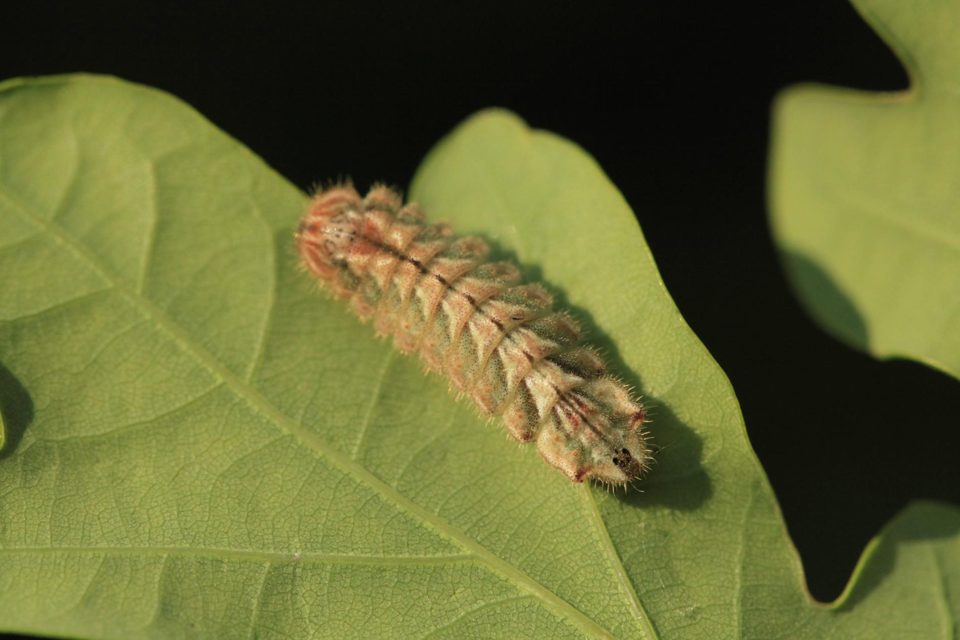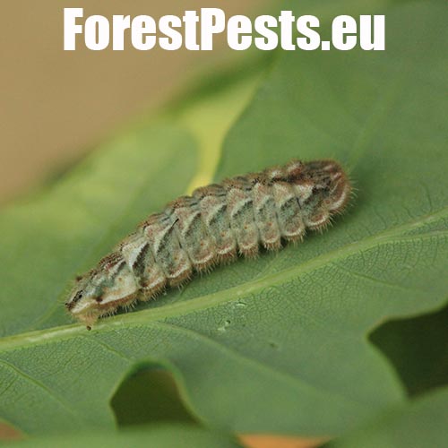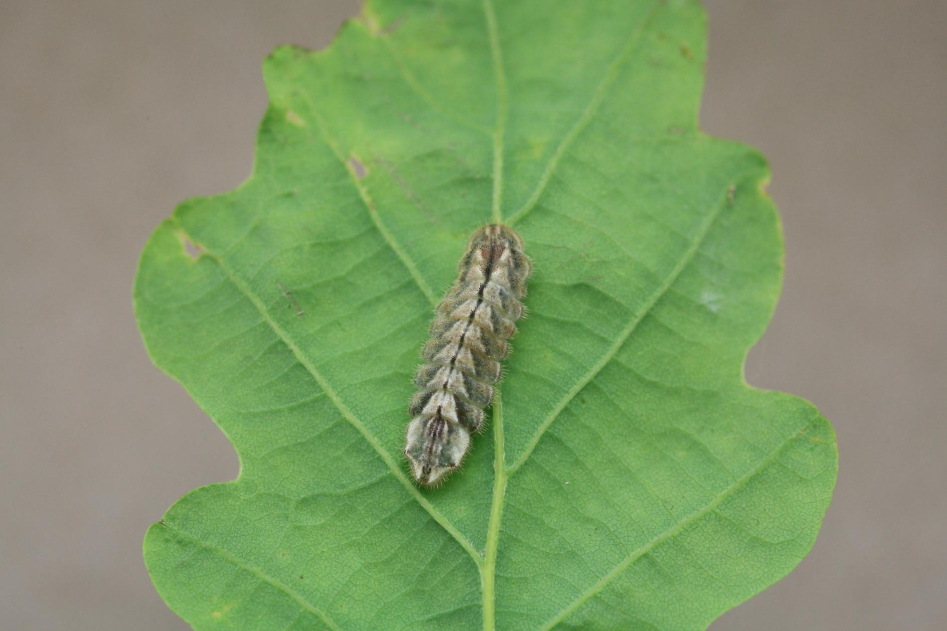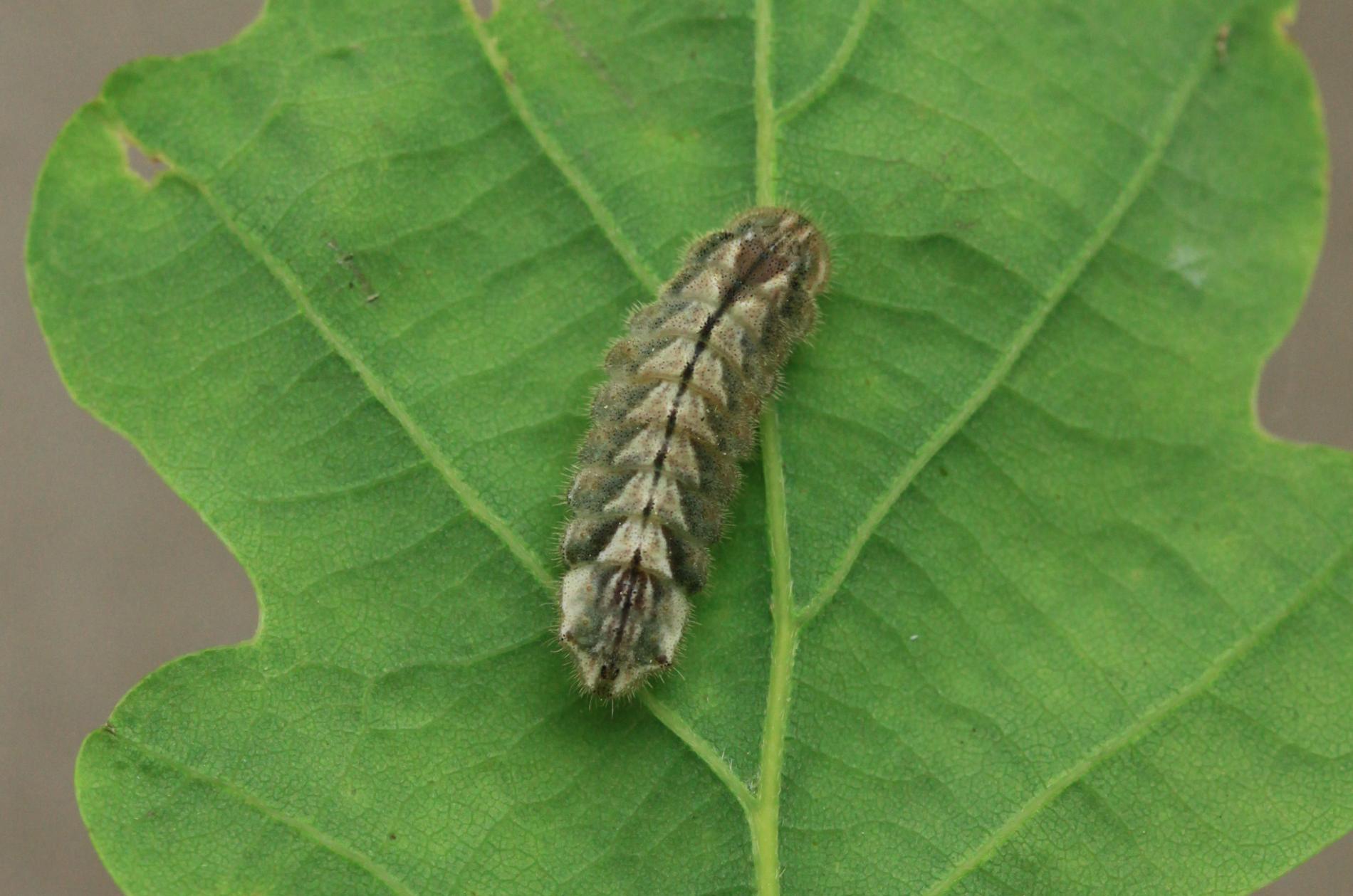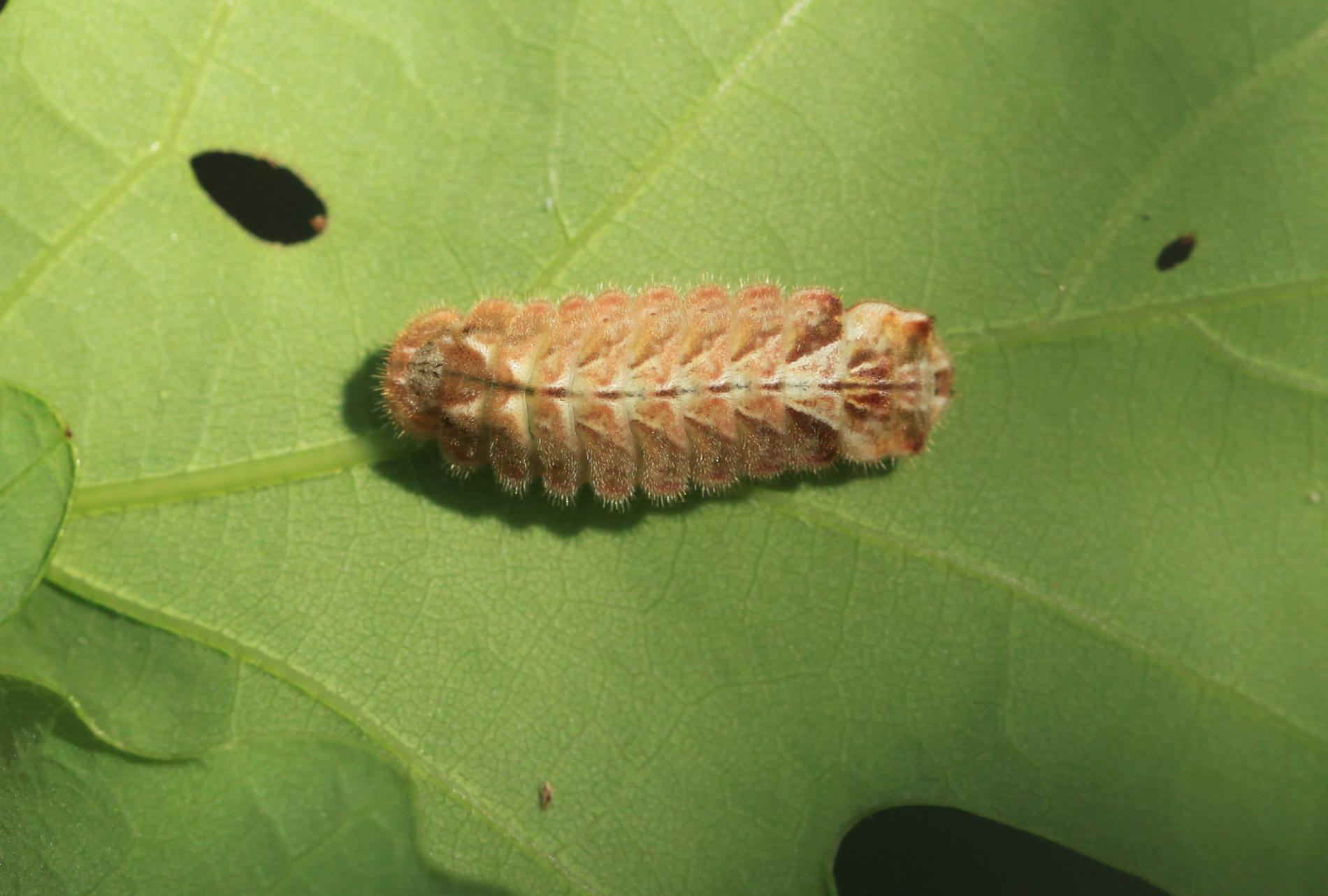 Larva up to 20 mm in length, relatively flattened, wider, than tall, rusty-brown or cinnamon-brown in colour with dark-brown dorsal line, which is bordered by paler stripe. Each segment bear dark-brown, in upper part whitish bordered, skewed stripe below dorsum. Last three segments usually paler than other ones. Lateral line is whitish. Larva feeds on Quercus spp. Hibernation as individual egg on branches. Pupation on ground. Adult 25-30 mm in wingspan, dark brown with metallic-blue wings (male) or with metallic-blue spots on forewings (female). Marginal zone of oak forests, open oak forests, locally fairly abundant.