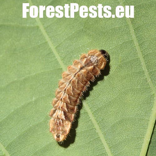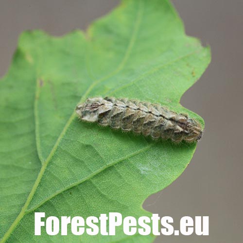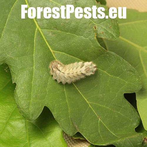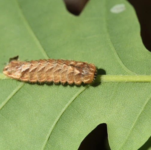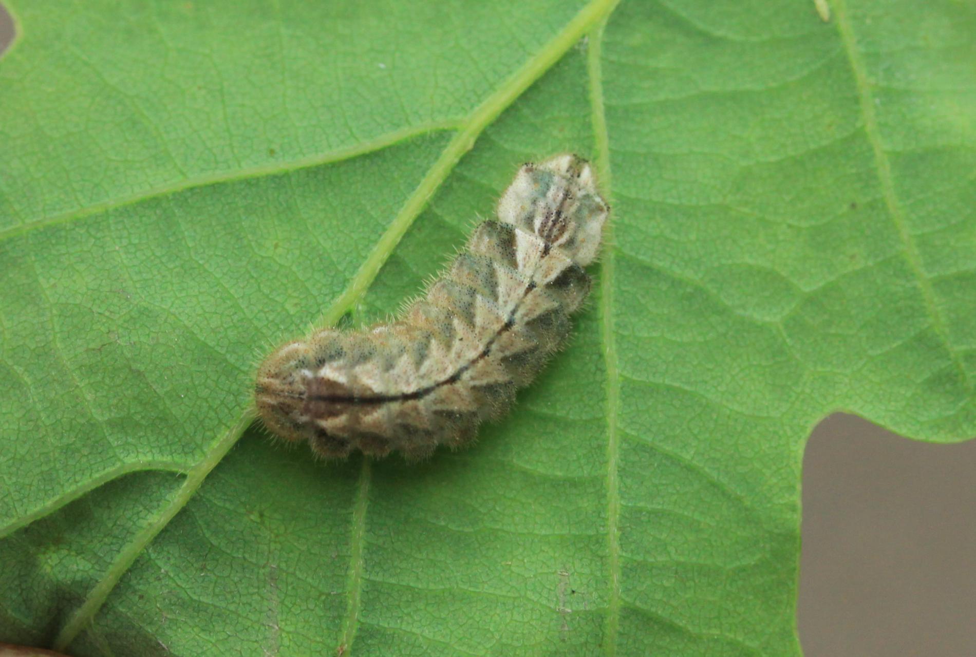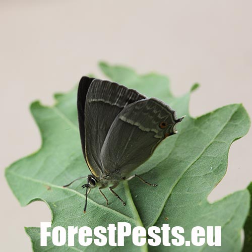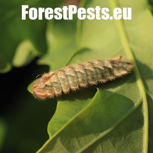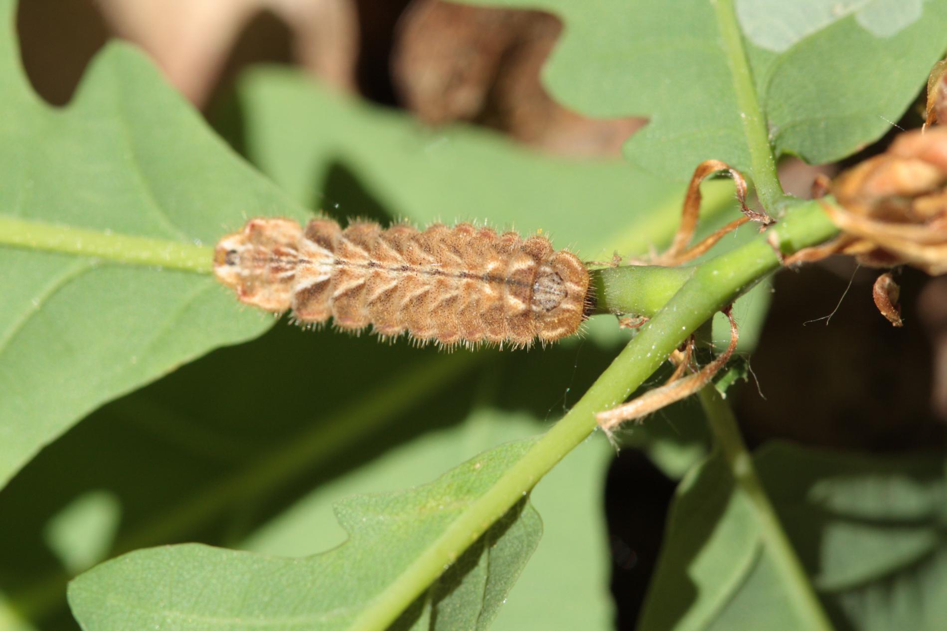 Larva up to 20 mm in length, relatively flattened, wider, than tall, rusty-brown or cinnamon-brown in colour with dark-brown dorsal line, which is bordered by paler stripe. Each segment bear dark-brown, in upper part whitish bordered, skewed stripe below dorsum. Last three segments usually paler than other ones. Lateral line is whitish. Larva feeds on Quercus spp. Hibernation as individual egg on branches. Pupation on ground. Adult 25-30 mm in wingspan, dark brown with metallic-blue wings (male) or with metallic-blue spots on forewings (female). Marginal zone of oak forests, open oak forests, locally fairly abundant.