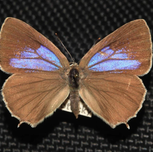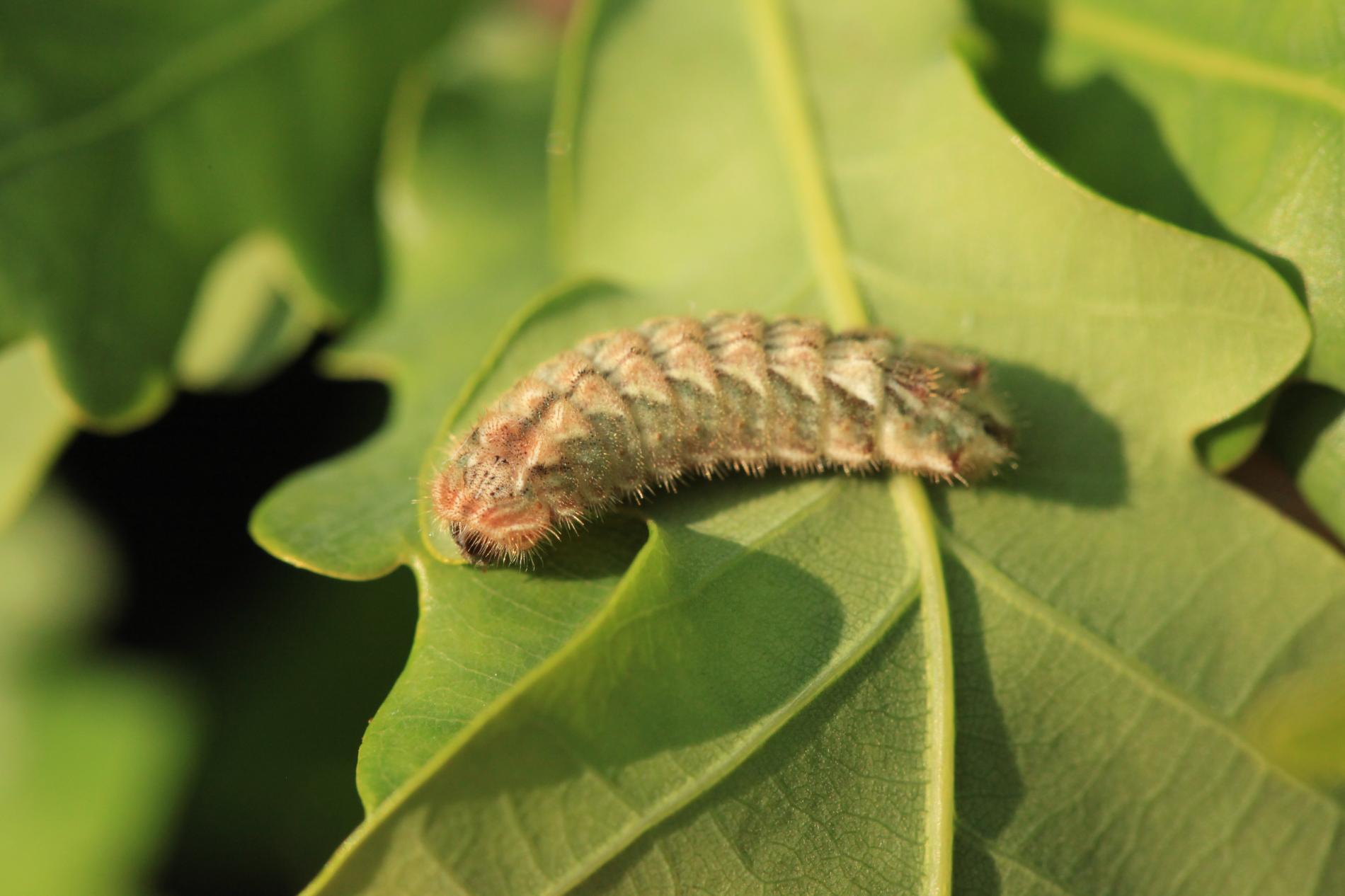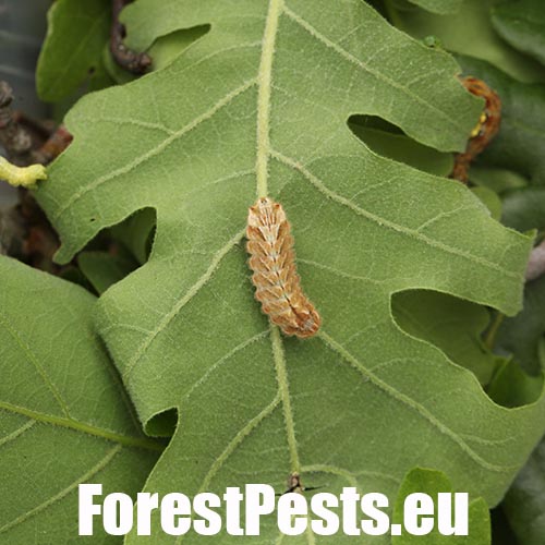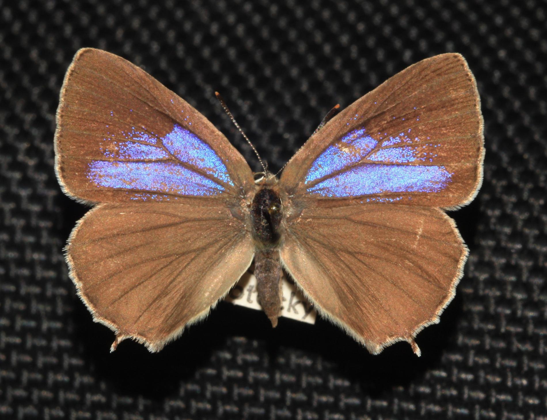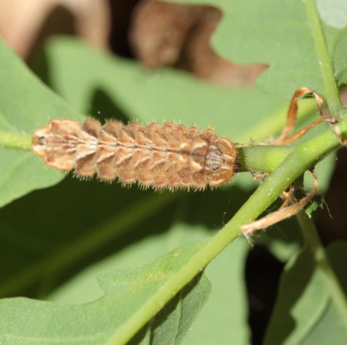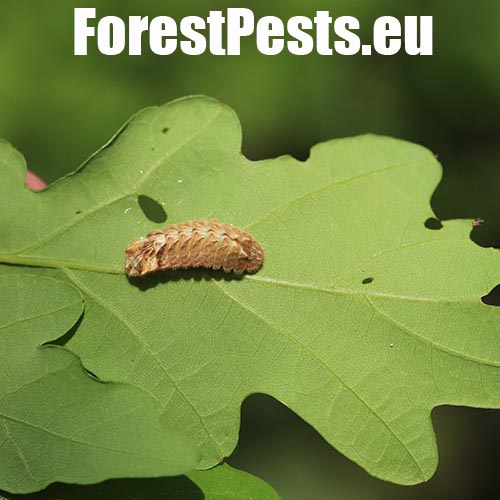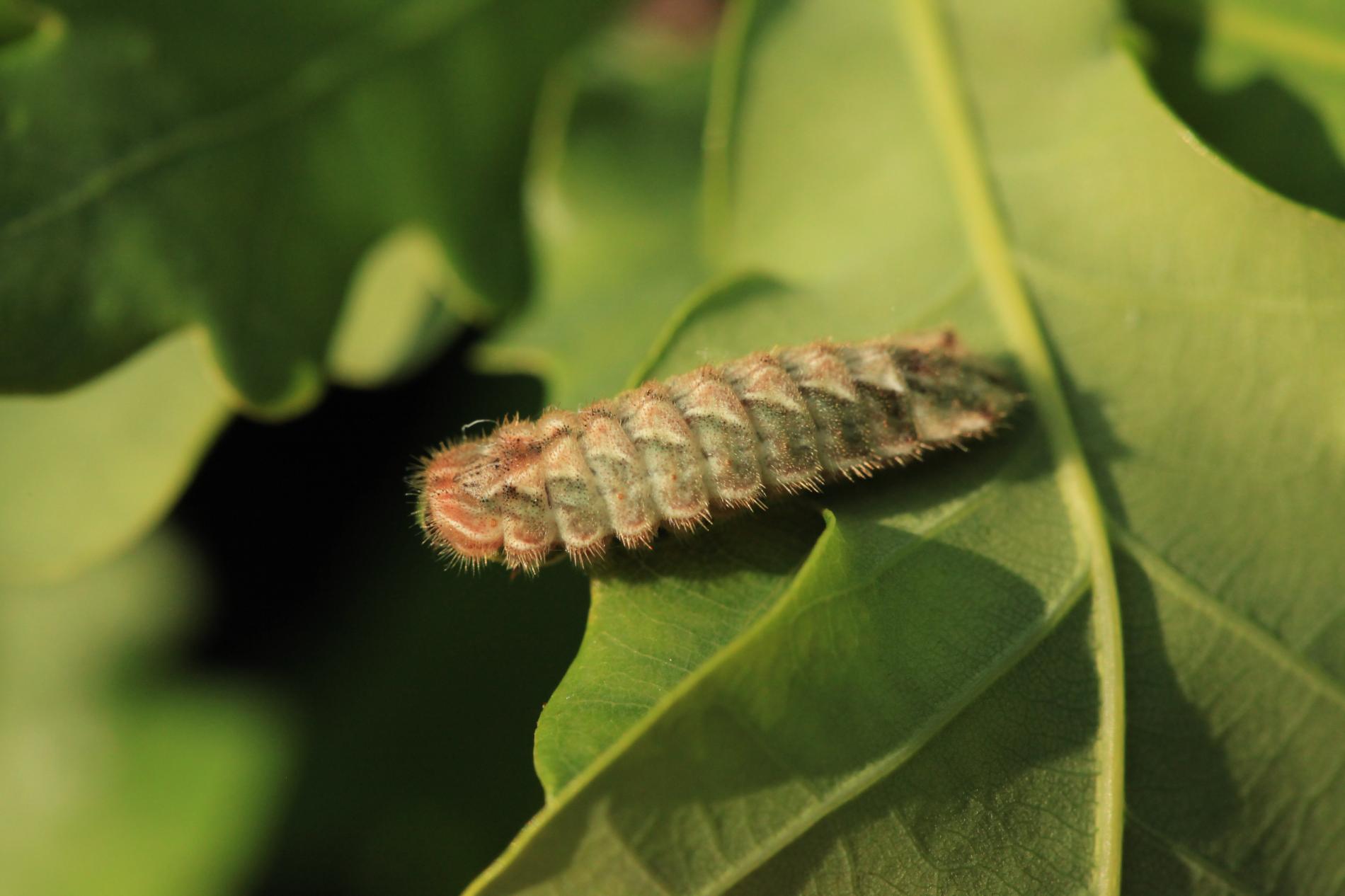 Larva up to 20 mm in length, relatively flattened, wider, than tall, rusty-brown or cinnamon-brown in colour with dark-brown dorsal line, which is bordered by paler stripe. Each segment bear dark-brown, in upper part whitish bordered, skewed stripe below dorsum. Last three segments usually paler than other ones. Lateral line is whitish. Larva feeds on Quercus spp. Hibernation as individual egg on branches. Pupation on ground. Adult 25-30 mm in wingspan, dark brown with metallic-blue wings (male) or with metallic-blue spots on forewings (female). Marginal zone of oak forests, open oak forests, locally fairly abundant.