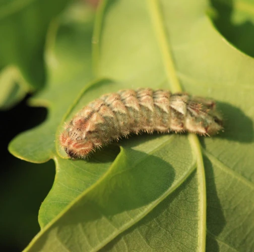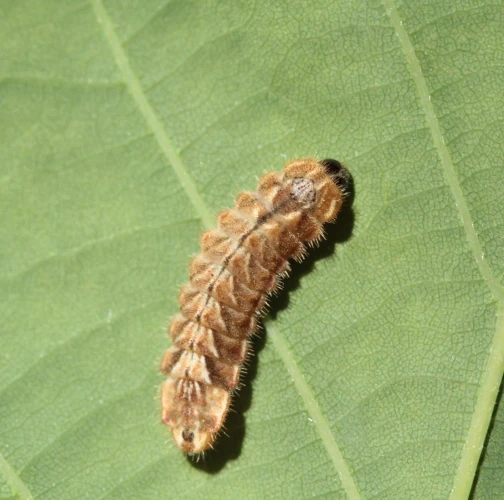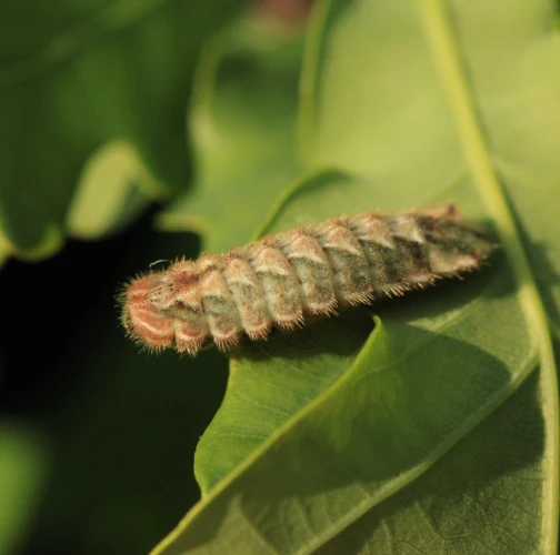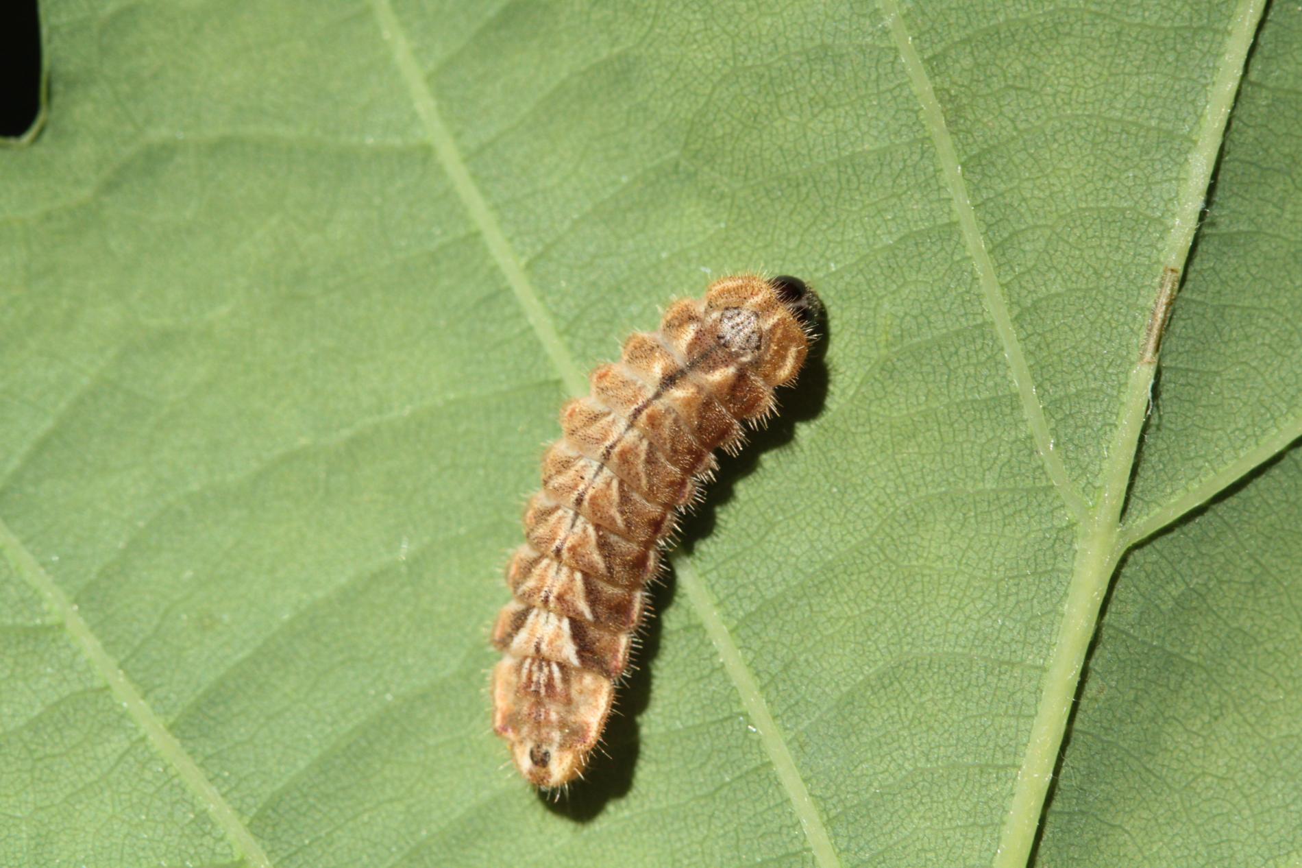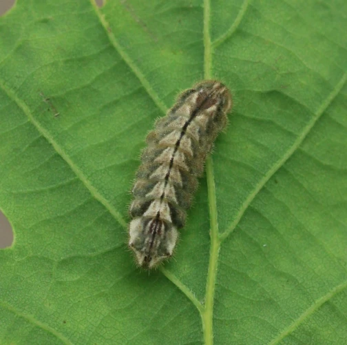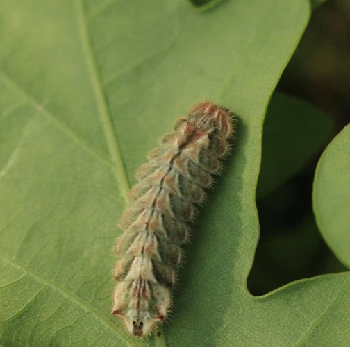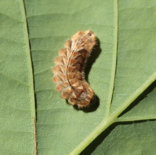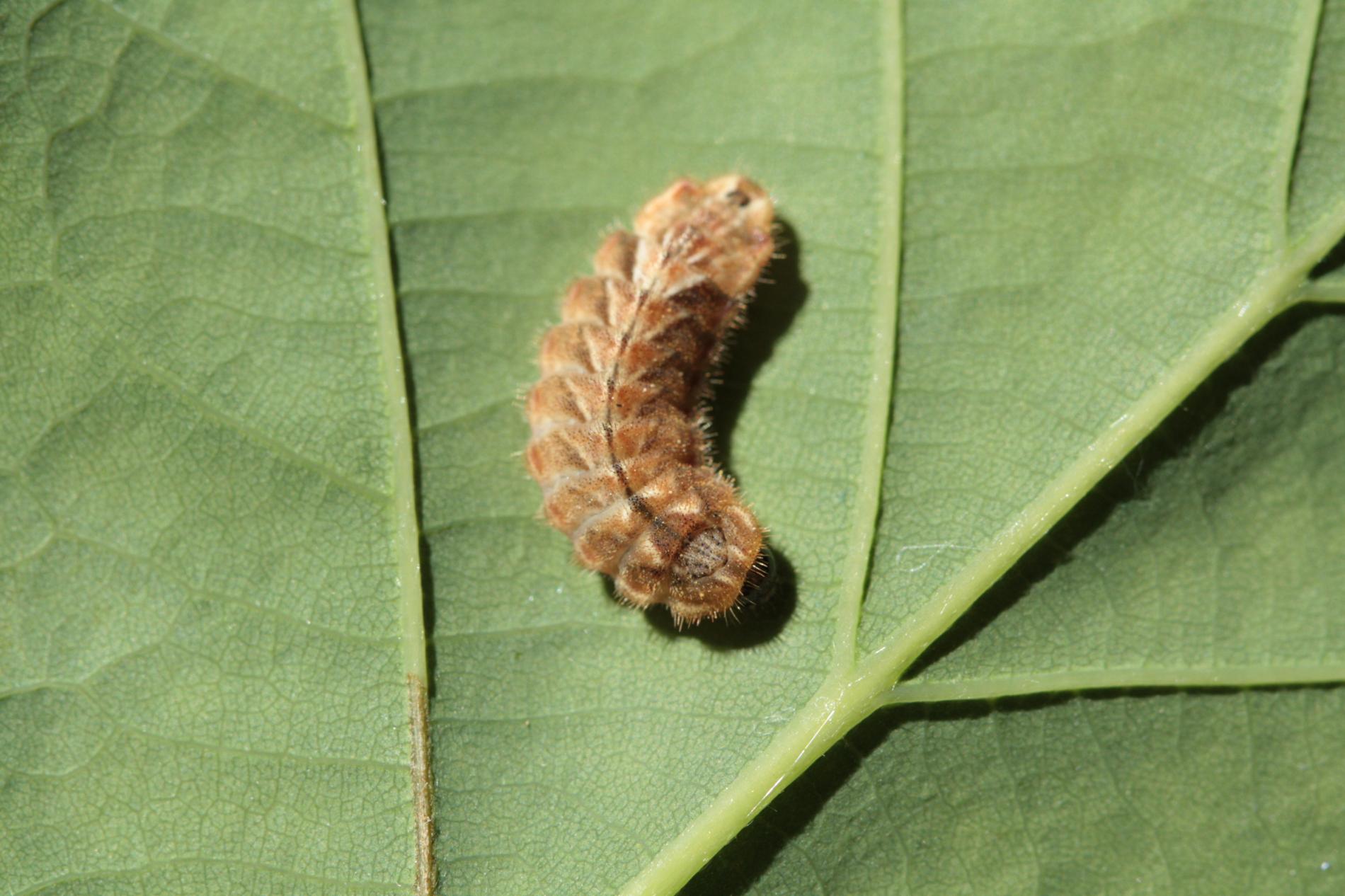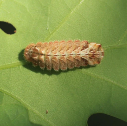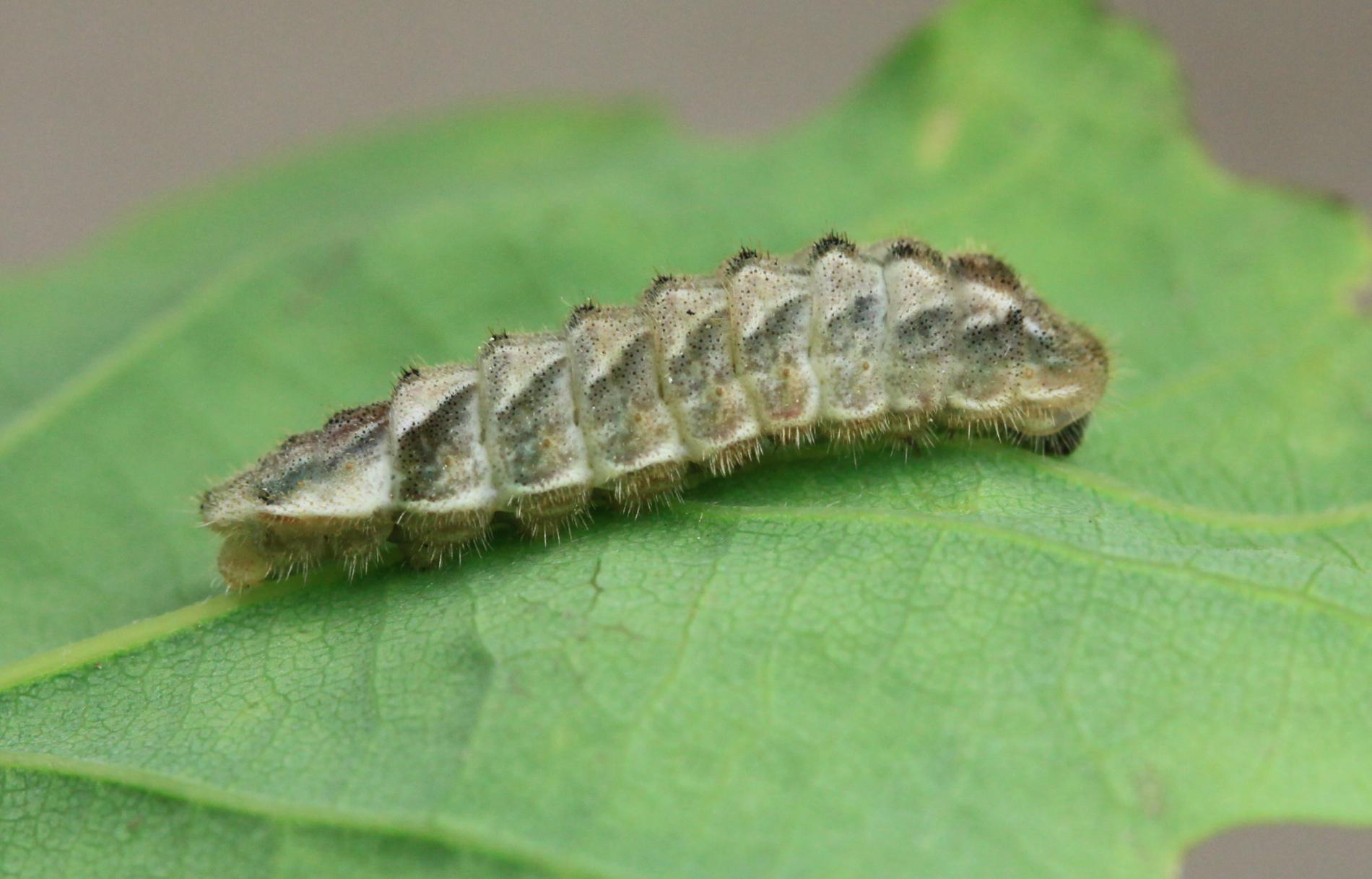 The caterpillar has a very atypical shape. It is oval and resembles a small snail without a shell rather than a butterfly caterpillar.