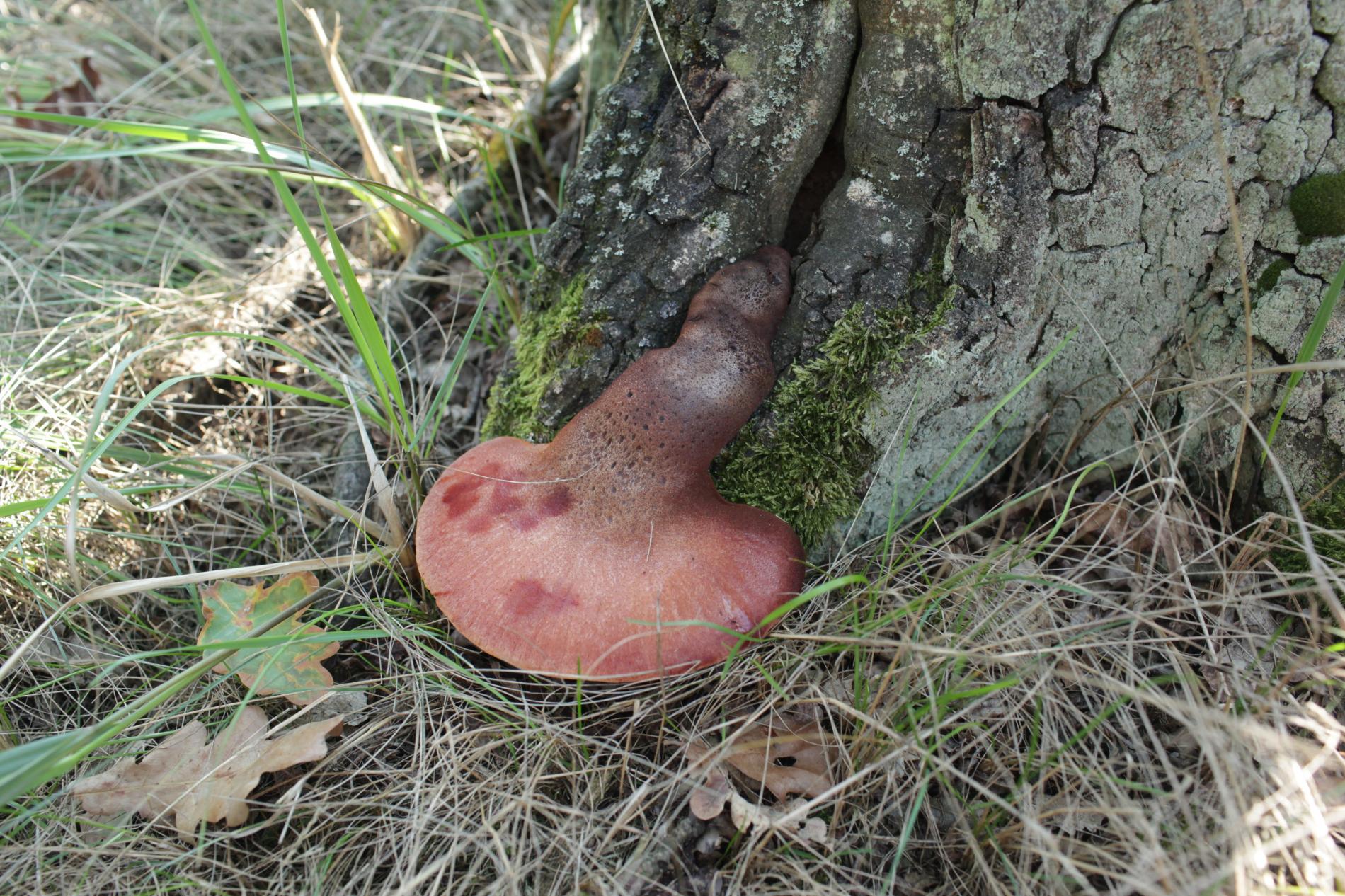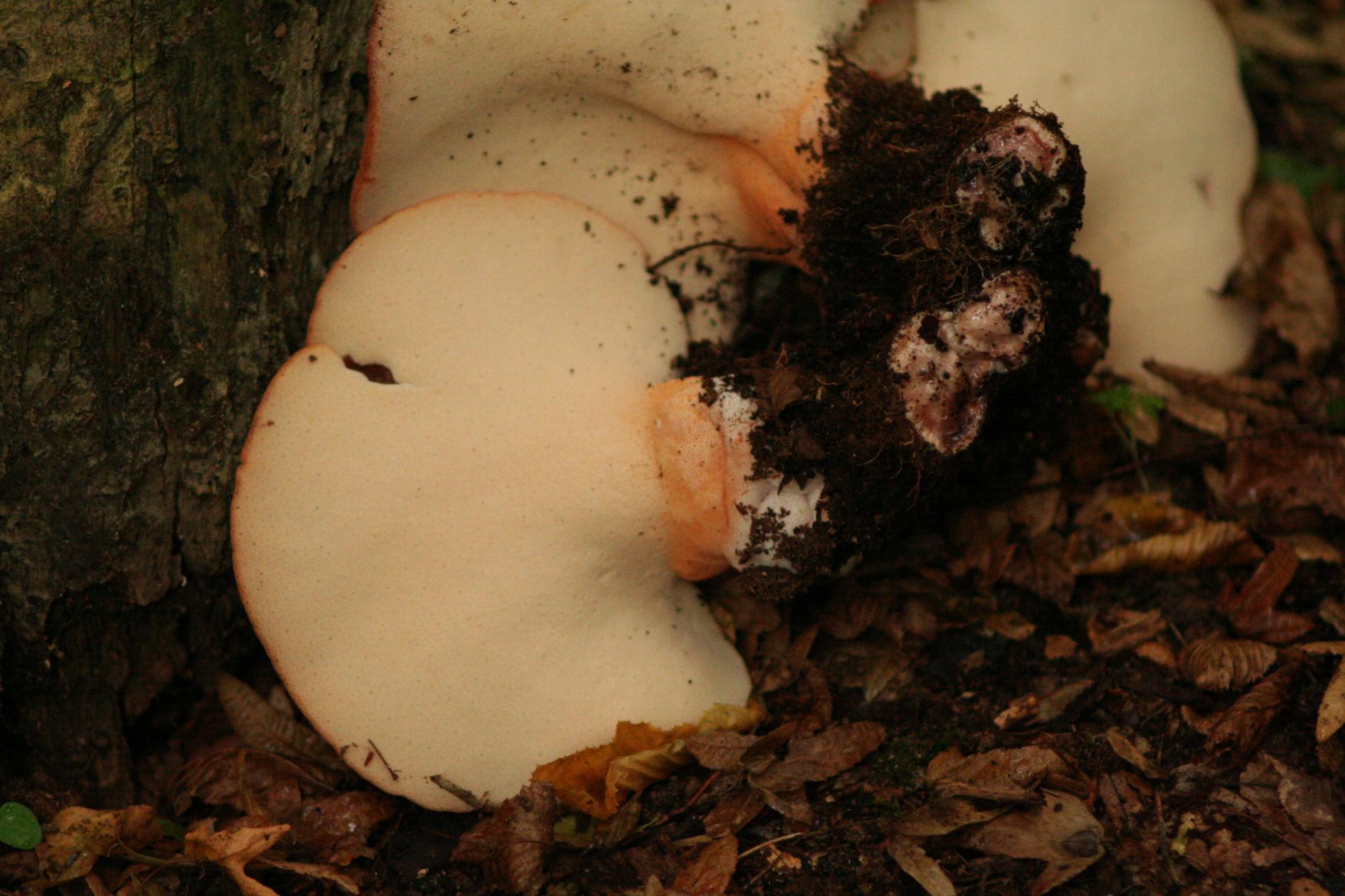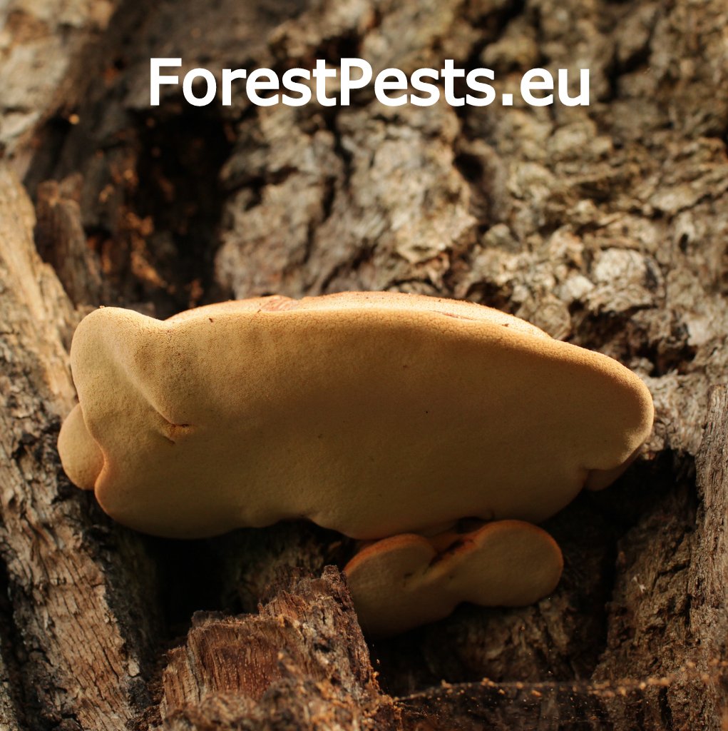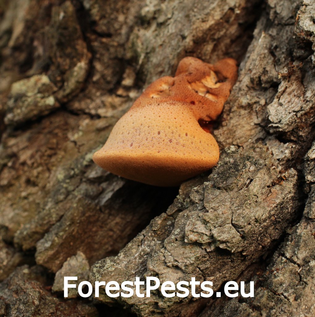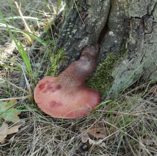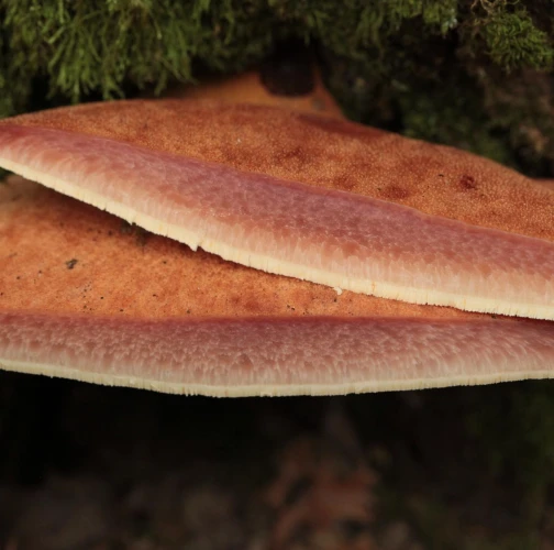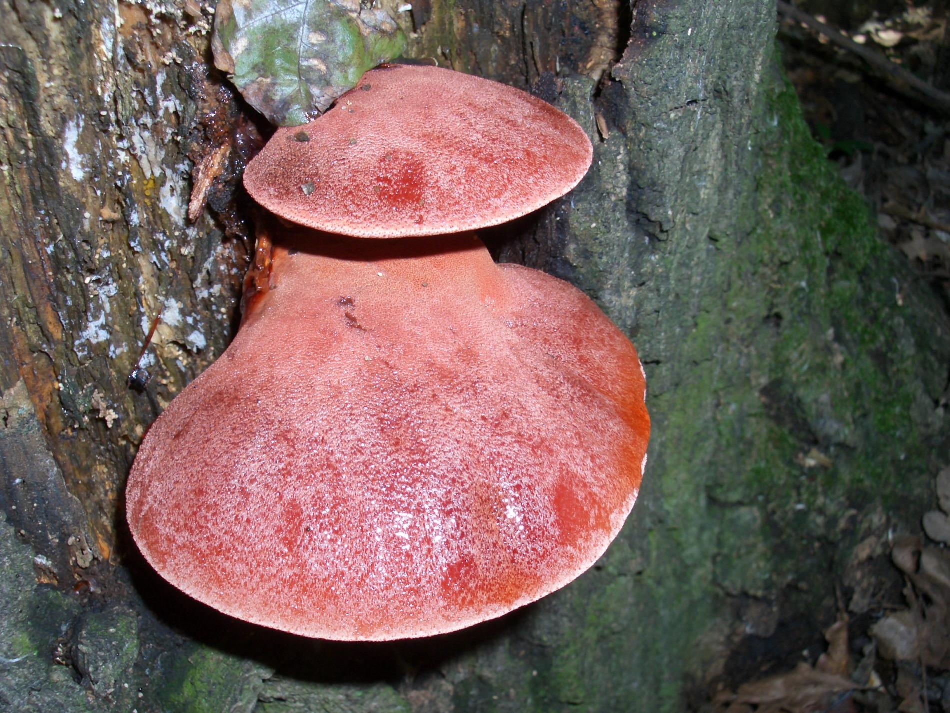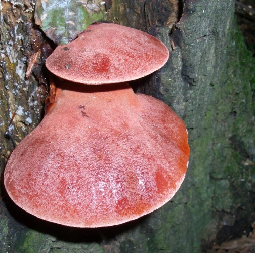 The fruiting body is annual, juicy and fleshy, elongated, thick and tongue-like, 5-25 cm wide, and 3-8 cm thick. On the surface, it has a jelly-like papillous epidermis, orange red when young, later on fleshy purple, and fleshy brown when old. The tubes are loose (the walls are not joined with each other); whitish to pale ochre, the colour turns to rusty brown when old. It reminds of fresh bloody beef meat on the cut. The mycelium causes the heartwood to turn brown, the heartwood is not destroyed completely, but it is more fragile.