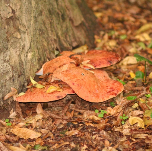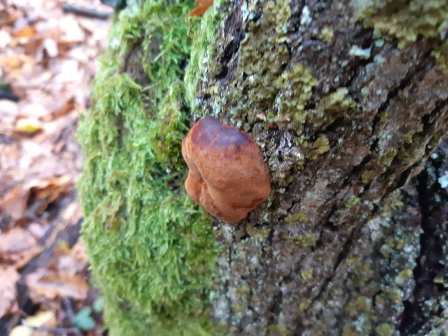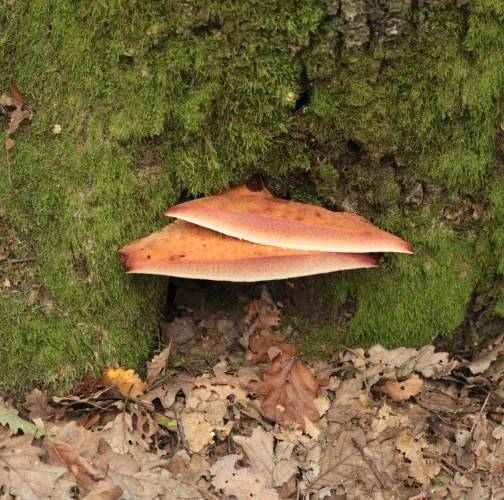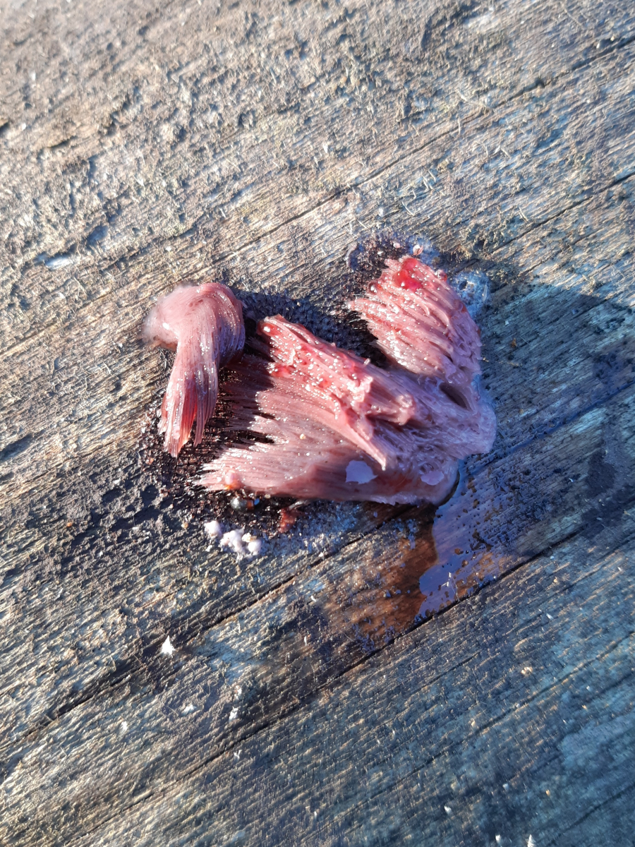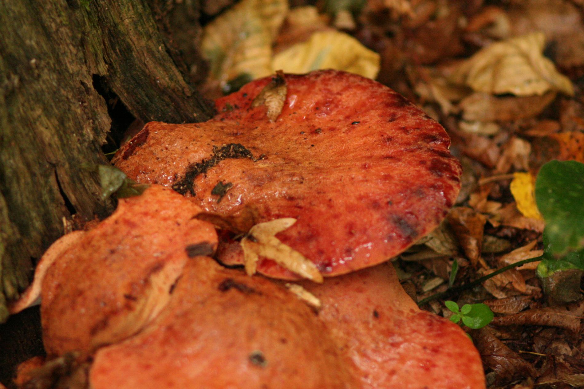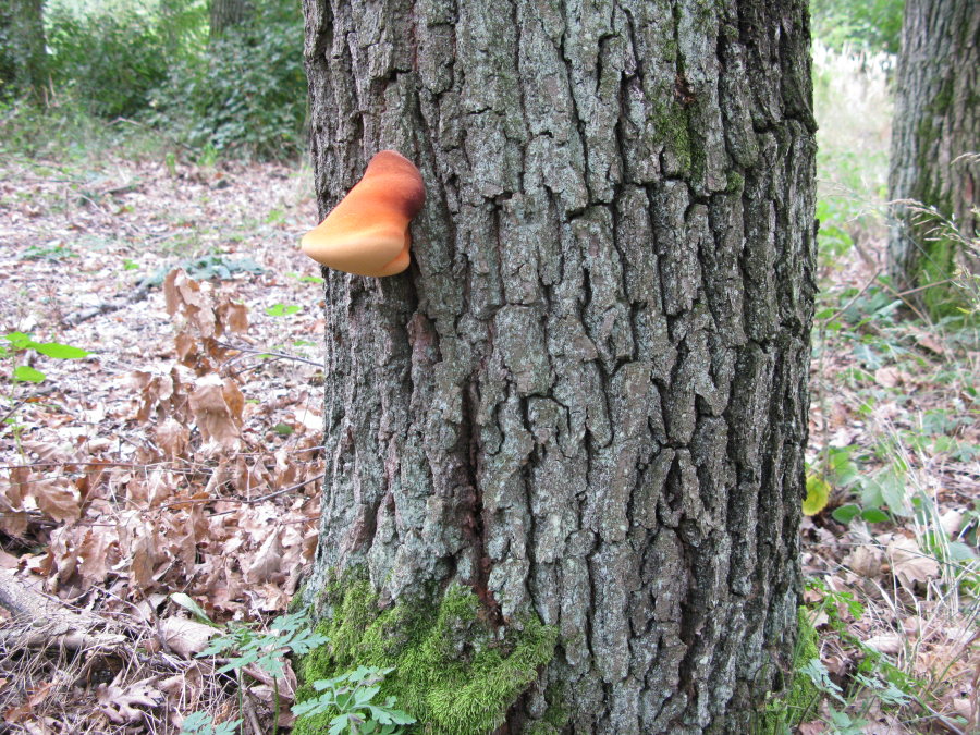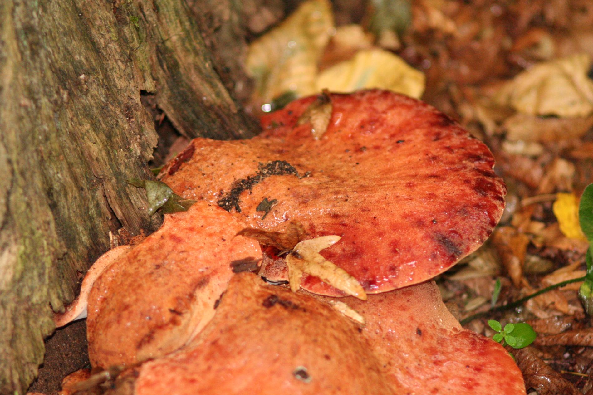 The fruiting body is annual, juicy and fleshy, elongated, thick and tongue-like, 5-25 cm wide, and 3-8 cm thick. On the surface, it has a jelly-like papillous epidermis, orange red when young, later on fleshy purple, and fleshy brown when old. The tubes are loose (the walls are not joined with each other); whitish to pale ochre, the colour turns to rusty brown when old. It reminds of fresh bloody beef meat on the cut. The mycelium causes the heartwood to turn brown, the heartwood is not destroyed completely, but it is more fragile.