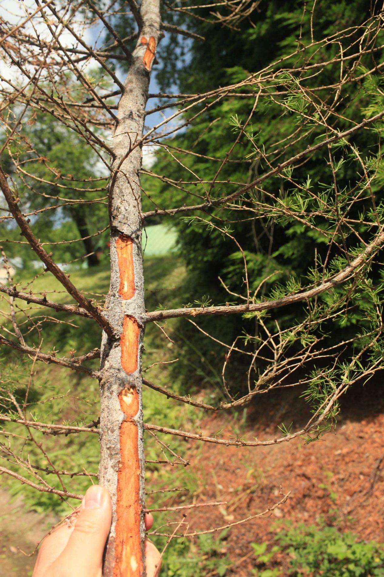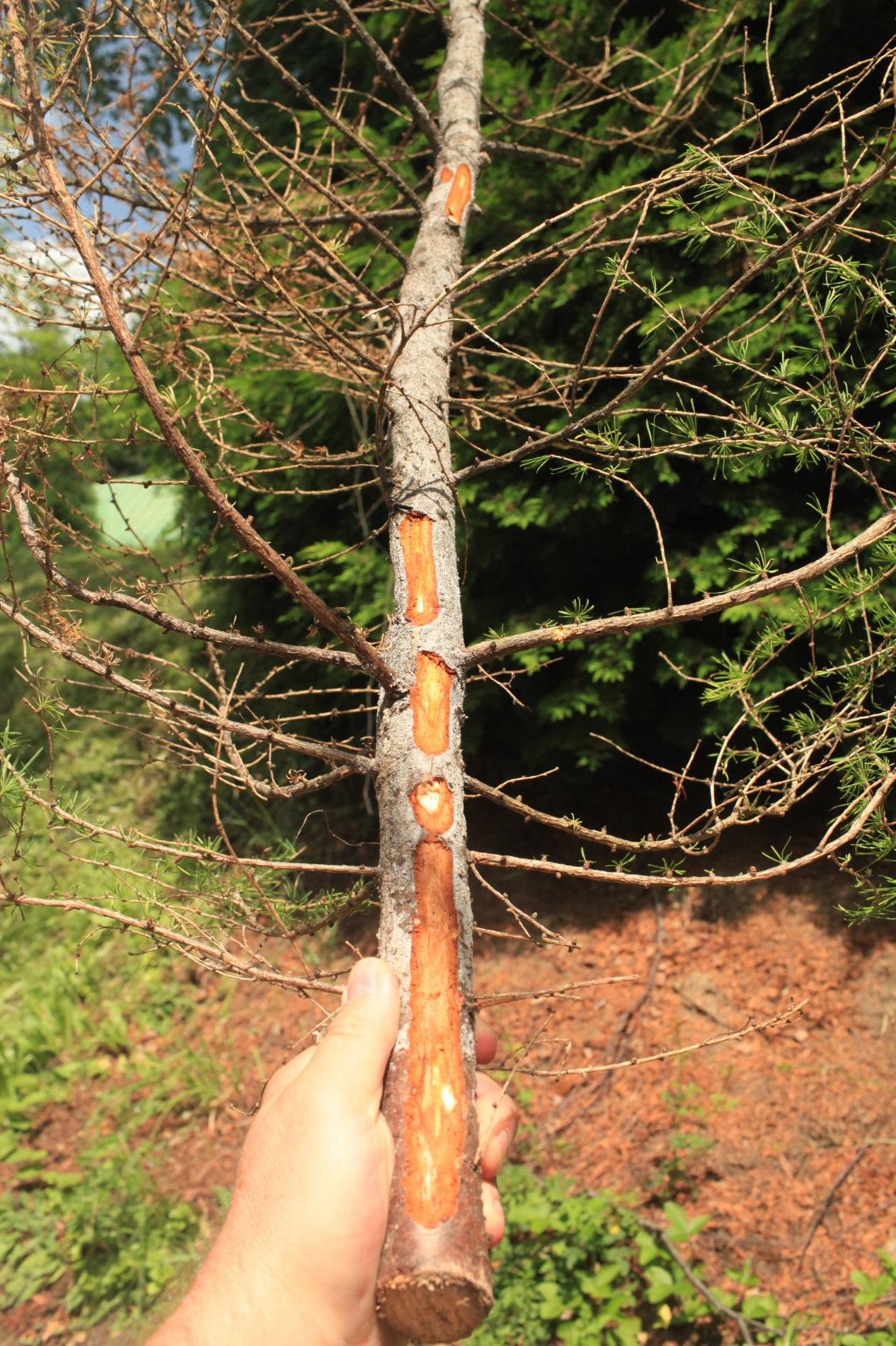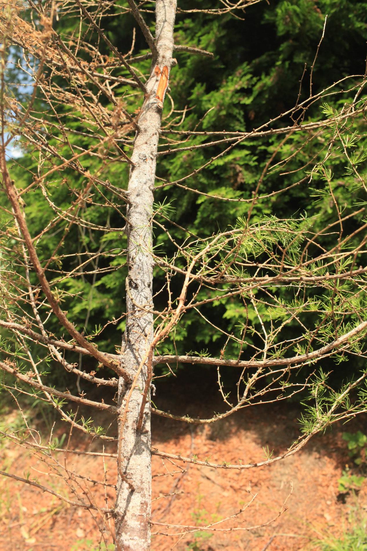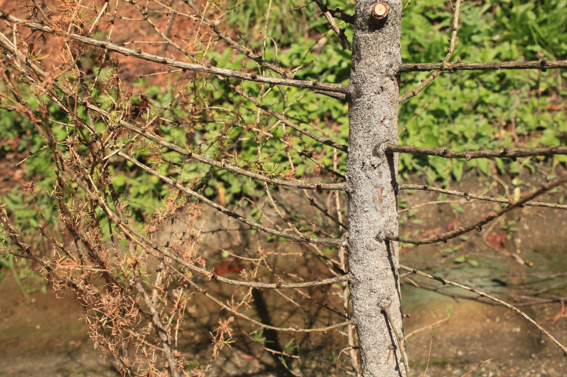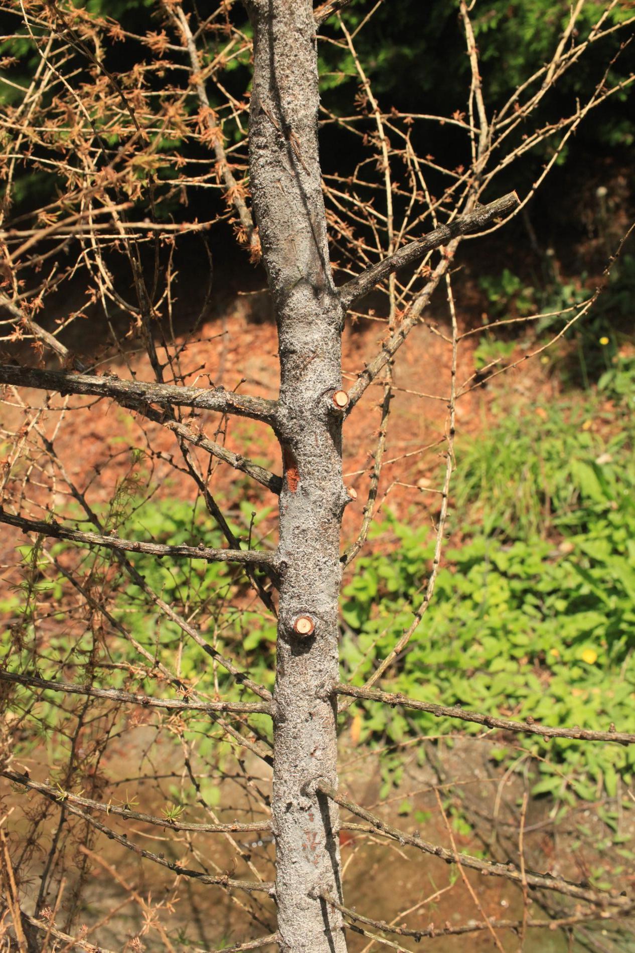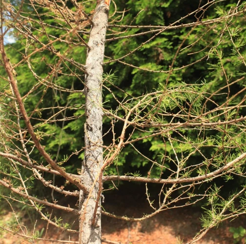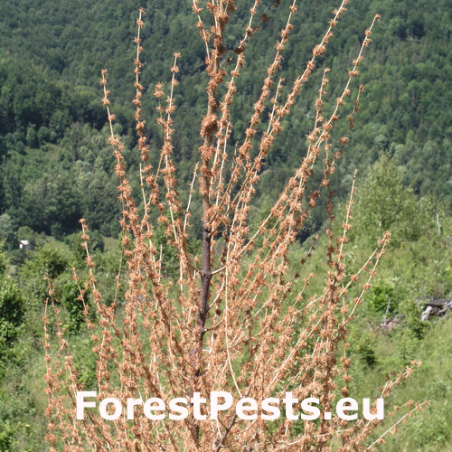 Die back of branches and whole crowns of young trees up to 15 years.