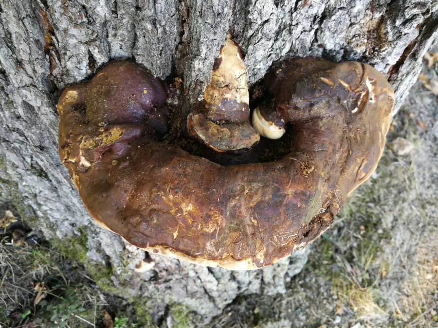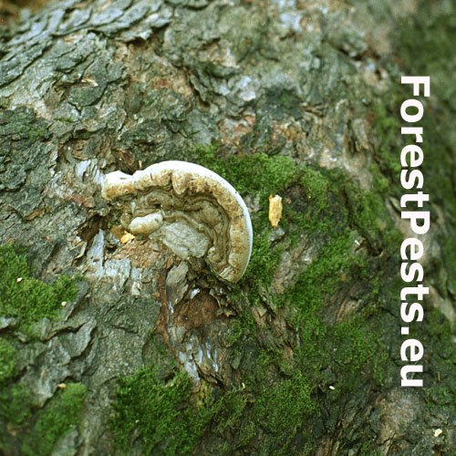 The fruiting bodies are perennial, bracket-like, up to 50 cm wide and 20 cm thick. The surface is dark brown, grooved, waved and covered with bark reaching up to 3 mm in thickness. Edges of the fruiting bodies are round and white at the time of increment. Similarly, the pores on the bottom side of the fruiting bodies are white first, later they are ochre to reddish-brown. The ecosystem of the fungus is the urban environment. It infects living or dead broadleaves, mostly in parks and alleys. Besides, a common symptom is intense spotty white rot of roots and the trunk. Infected wood is covered with black pseudosclerosis lines.