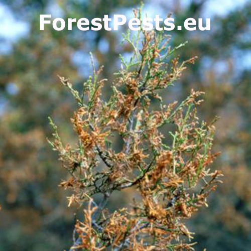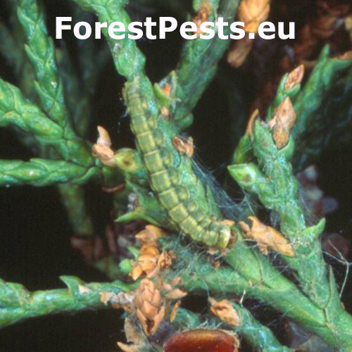 Mined needles and shoots are present, later connected by silken tubes or nests. Damaged needles are partially hollowed, discoloured and mixed with frass inside the webbing.