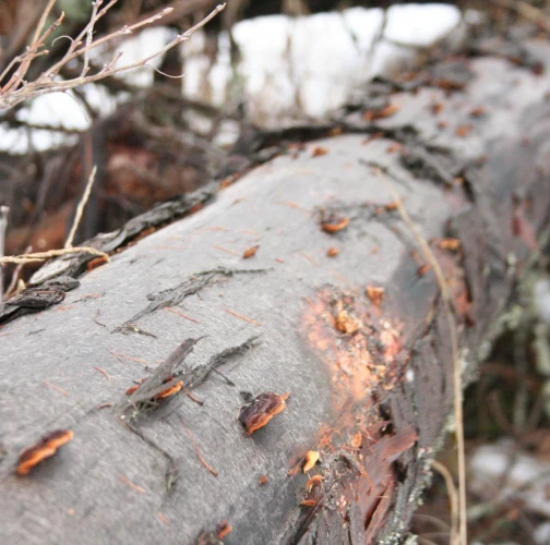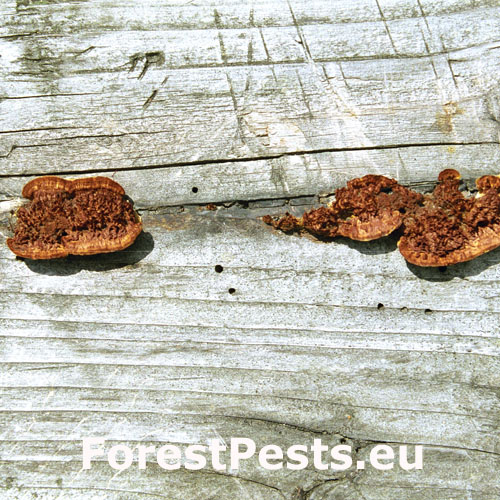 The presence of rusty-brown fruiting bodies emerging on the surface of the wood, most often through cracks and fissures, are laterally added to the semi-spilled.