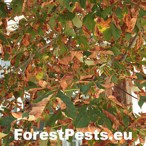 Spots on leaves caused by this fungus regularly appear in summer. The pest is characterized by yellowing and later browning of leaves from their edges. The disease also occurs with horse chestnut leaf miner, which is much more damaging that the fungal disease attracting less attention. This disease is significant especially in forest nurseries where it reduces the assimilation surface and general vitality of seedlings and young trees, and mainly in parks where it lowers their aesthetic value.