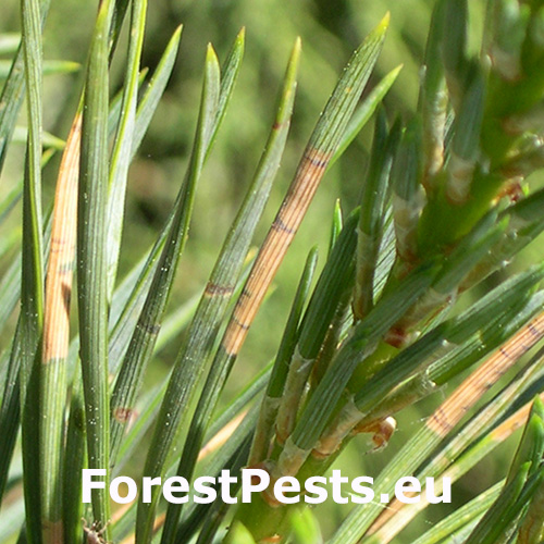 Adults cause rows of yellow-brown rings on needles, leading to browning and needle drop.