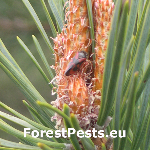 Haematoloma dorsata is a froghopper species primarily found in Mediterranean regions but has expanded its range across parts of Europe, including the Netherlands, France, Belgium, and Switzerland. The insect targets several conifers, particularly Pinus species such as Scots pine (Pinus sylvestris), black pine (Pinus nigra), and Aleppo pine (Pinus halepensis), among others. Adults feed on conifer needles by piercing them with their sucking mouthparts, which causes transverse rows of yellow to brown rings. Over time, needles may turn brown and fall off. The larvae, covered in a frothy secretion for protection, feed on the roots of grasses, where they also overwinter. This species has one generation per year, with adults emerging from spring to early summer.