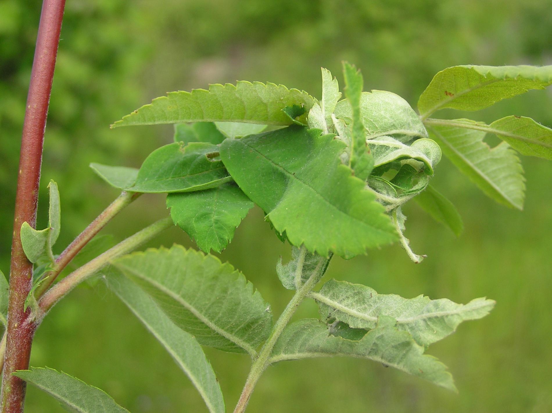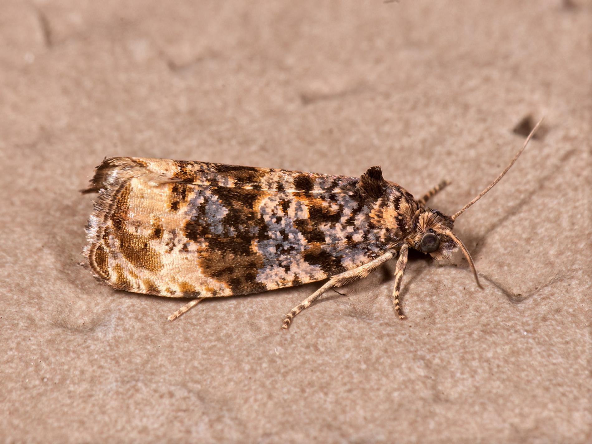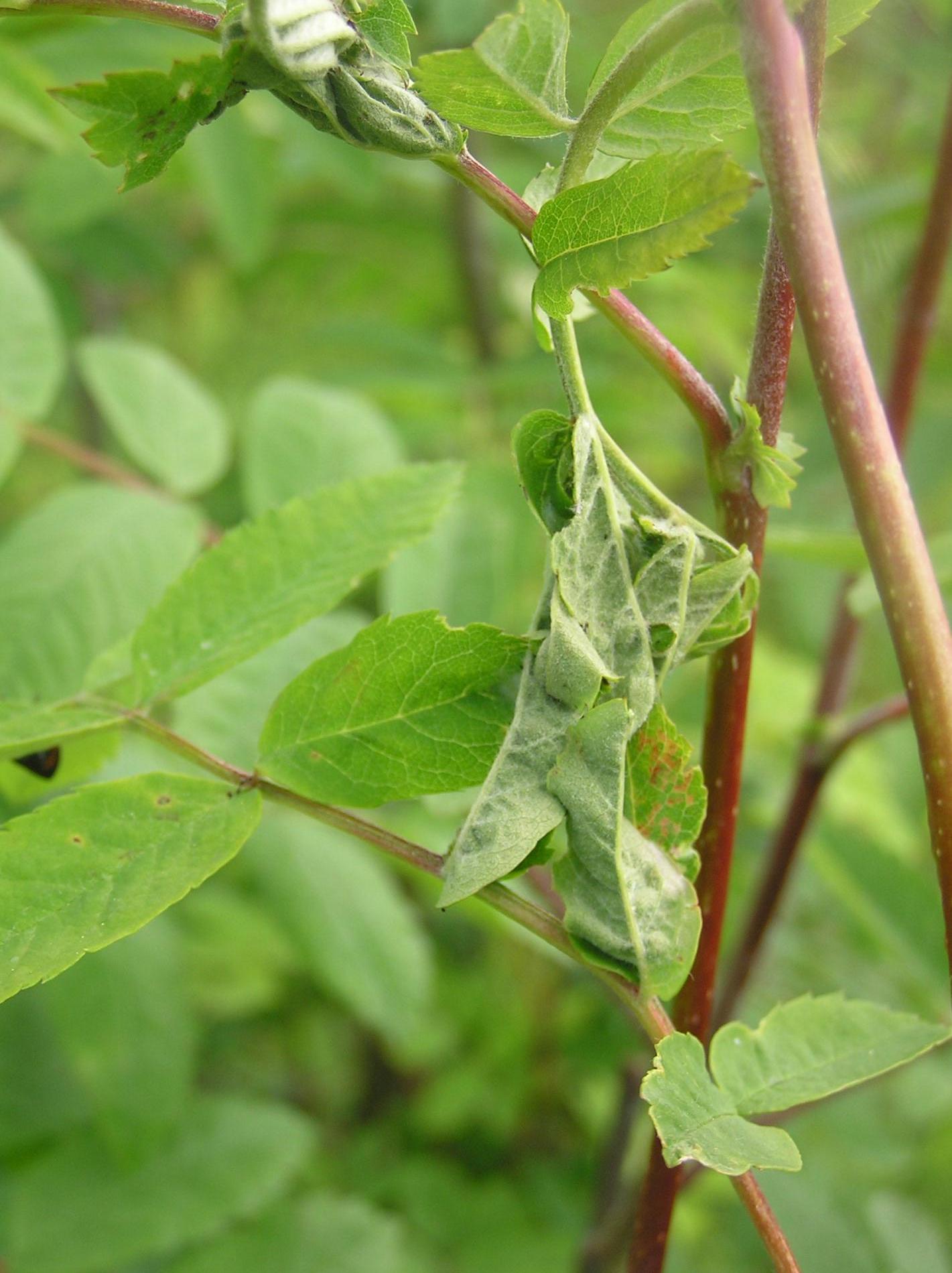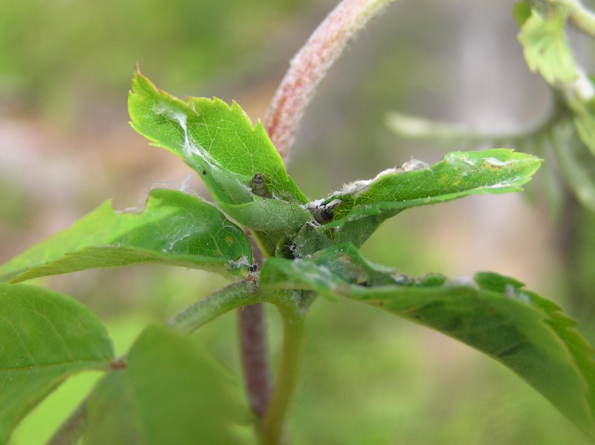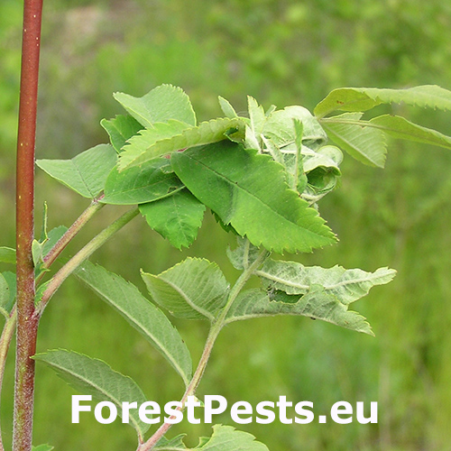Hedya pruniana, also known as the plum tortrix, is a species of moth in the family Tortricidae, found throughout the Palearctic region, including Central Europe, Anatolia, Iran, the Ural, Transcaucasia, and western Kazakhstan. It has a wingspan of 15–19 mm, with forewings that are white or ochreous-tinged and marked with dark fuscous and brown patterns, while the hindwings are grey, darker in females. The larvae, which are bright green with black spots and a black head, feed on various plants such as Prunus spinosa (blackthorn), Crataegus (hawthorn), Rosa, Sorbus, and Corylus avellana (hazel). Adults appearing from May to July. The larvae of the plum tortrix (Hedya pruniana) create shelters by curling or folding leaves together, binding them with silk. These curled leaves provide a protective habitat where the larvae can feed in relative safety. Within these leaf shelters, the larvae consume the soft plant tissues, causing visible damage to the leaves. This habitat also protects them from predators and environmental stress until they overwinter and eventually pupate.