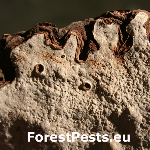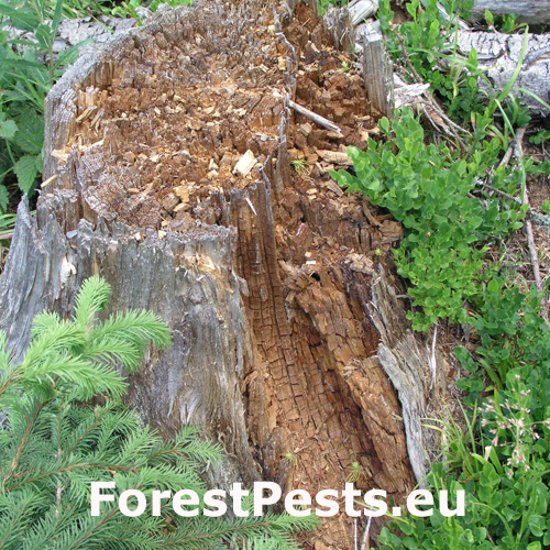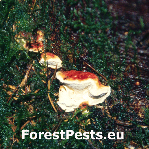 The fruiting bodies are annual or perennial and grow in summer and autumn on stumps and roots of living or dead trees. This fungus has two main methods of infection: 1. Trees can be infected by spores which are brought into wounds on roots and root swellings by air. The spores are also brought onto tree stumps which the fungus colonizes saprophytically. 2. Through the contact of healthy roots with infected ones, the mycelium overgrows directly from the infected to healthy roots. This fungus is one of the most dangerous pathogens in Europe, with a range of distribution from lowlands to mountain areas. The decaying heartwood is discoloured reddish-brown, decomposes in angular chunks and in later stages develops white mycelium pouches.