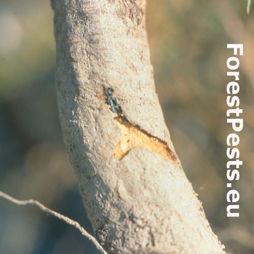 The egg gallery system is plain, prolonged with a bend at the end, up to 10 cm long and 1.7–2 mm wide. The larval galleries are relatively sparse.