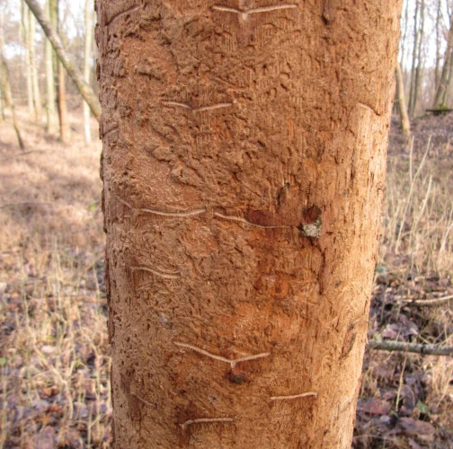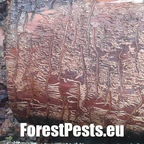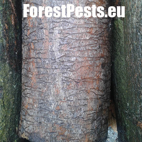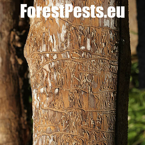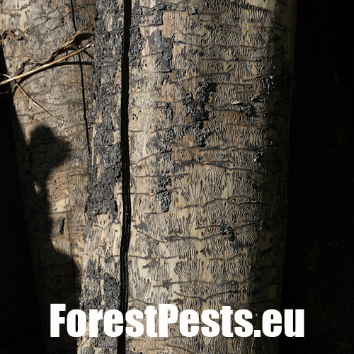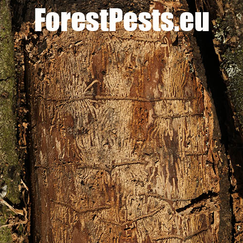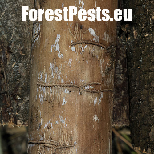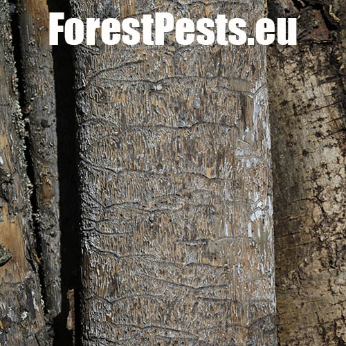 The ash bark beetle is the most common ash bark pest in Europe. It usually colonizes trunks of medium-aged or young trees. In case of broad-stemmed and older ash trees the beetle lives on thick branches. Its size is 2.5–3.5 mm. The gallery system consists of pairs of 6–10 cm long maternal tunnels. The larval tunnels, 3–6 cm long, are dense and parallel. The larvae push a high amount of wood debris in the form of a whitish powder out of the holes in wood. The larvae usually pupate in sapwood. The adult beetles leave the galleries through exit holes. The adults construct overwintering gallery under the bark. Characteristic galls develop over this place.