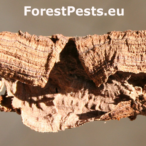The pileus is 1-6 cm tall and 0.1 cm thick. The pileus surface is pale brown to rusty brown, the hymenium is smooth, ocher brown to greyish-brown. When using a magnifying glass, fine but firm hair is visible on the hymenium. As regards colour and size, the fungus is inconspicuous, however, it often occurs in row formations and in large quantities. The mycelium causes heartwood rot of dead stubs and branches.