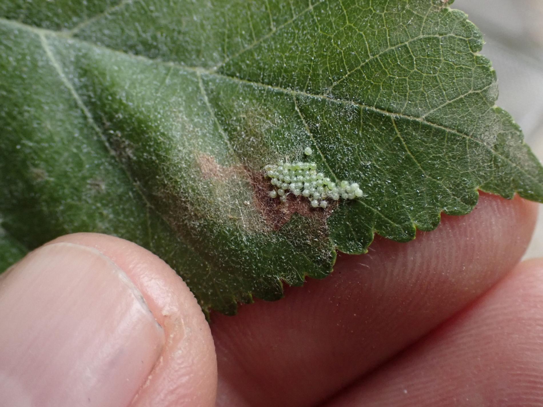 Leaves are skeletonized at first, later they are damaged so that only thicker veins remain intact. The leaves are damaged by the larvae which live at first gregariously and later singly.
