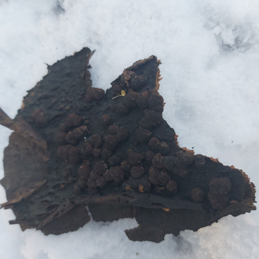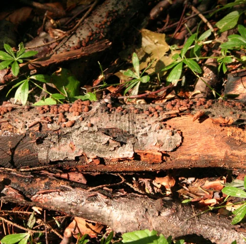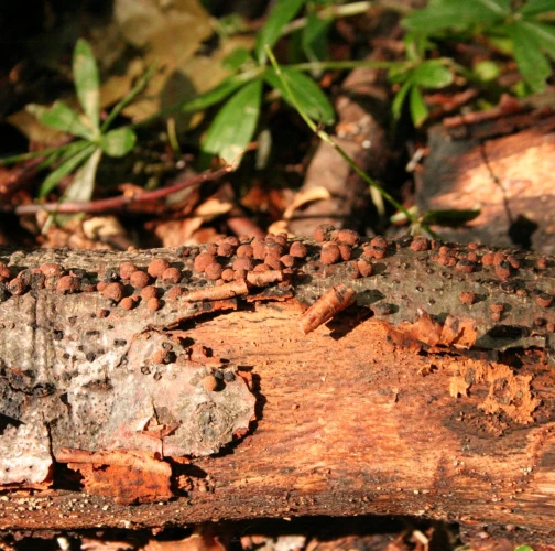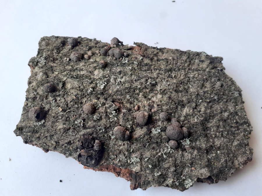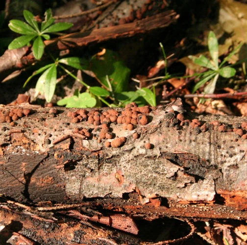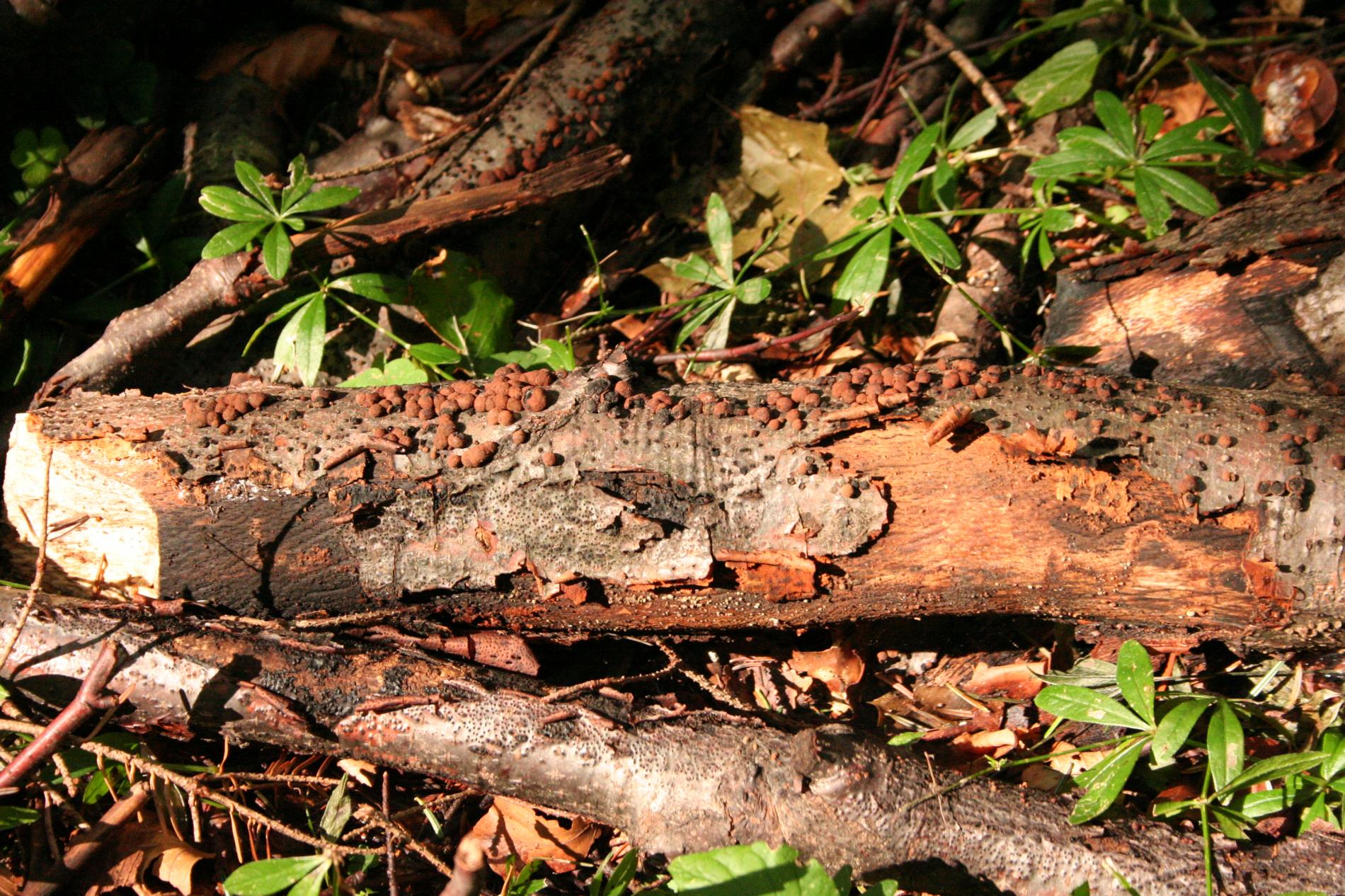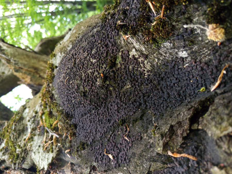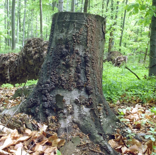 The fungus is common on bark of freshly felled trees and branches(A). It causes white rot, however, it does not penetrate deeply into wood. On rotting wood there are thin black lines formed to delimit healthy and rotting wood. About 1 cm long globular fruiting bodies grow in groups on bark. They are reddish brown, inside black and with its solidity they remind of charcoal. The older fruiting bodies are often striking as bark around them is covered with the black powder from spores.